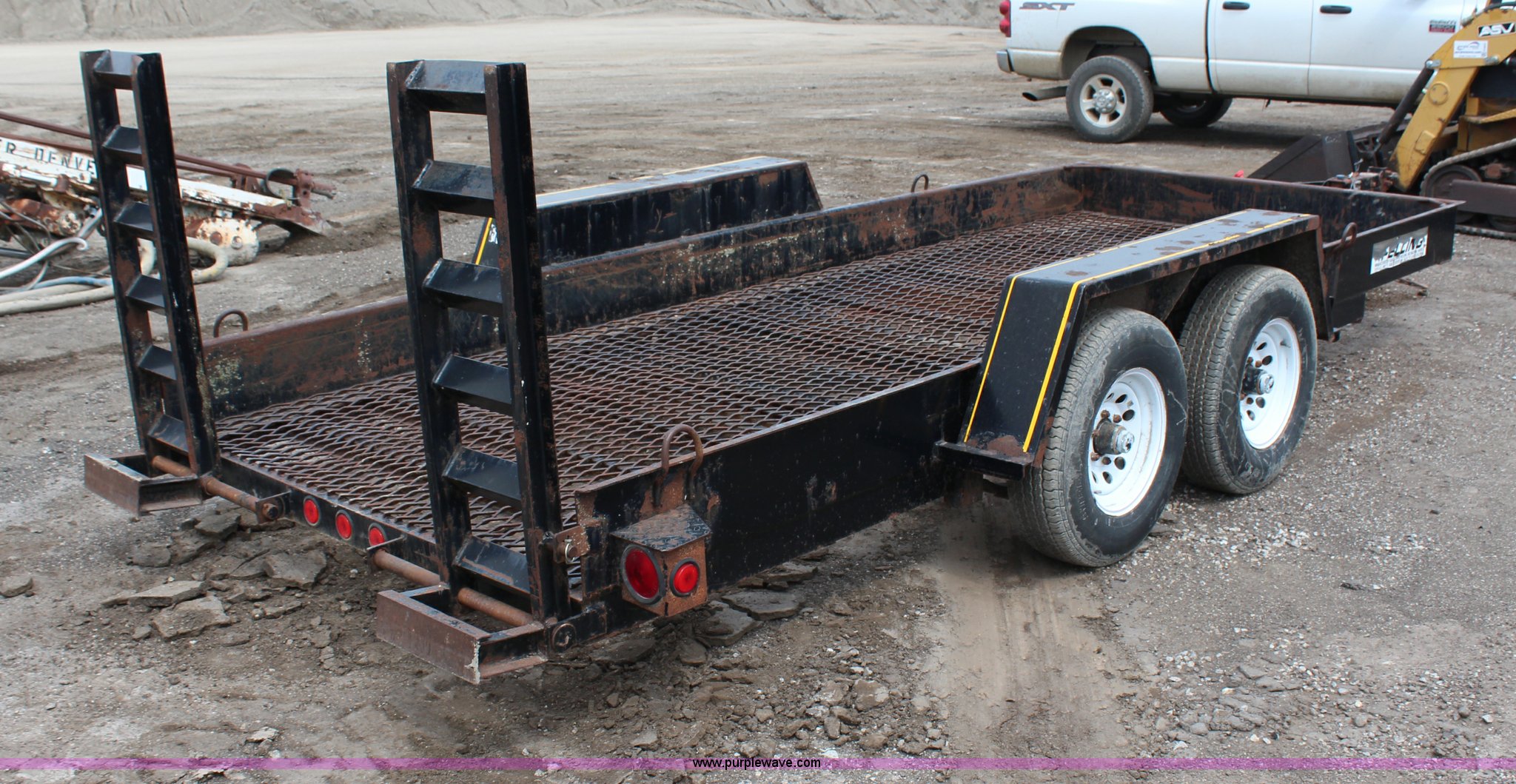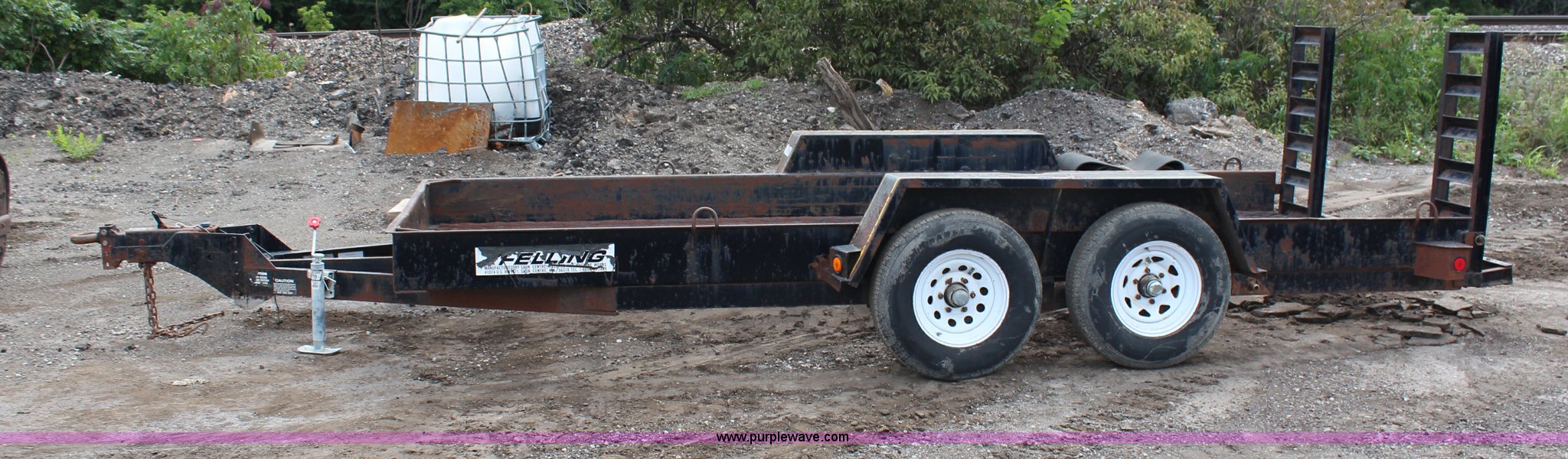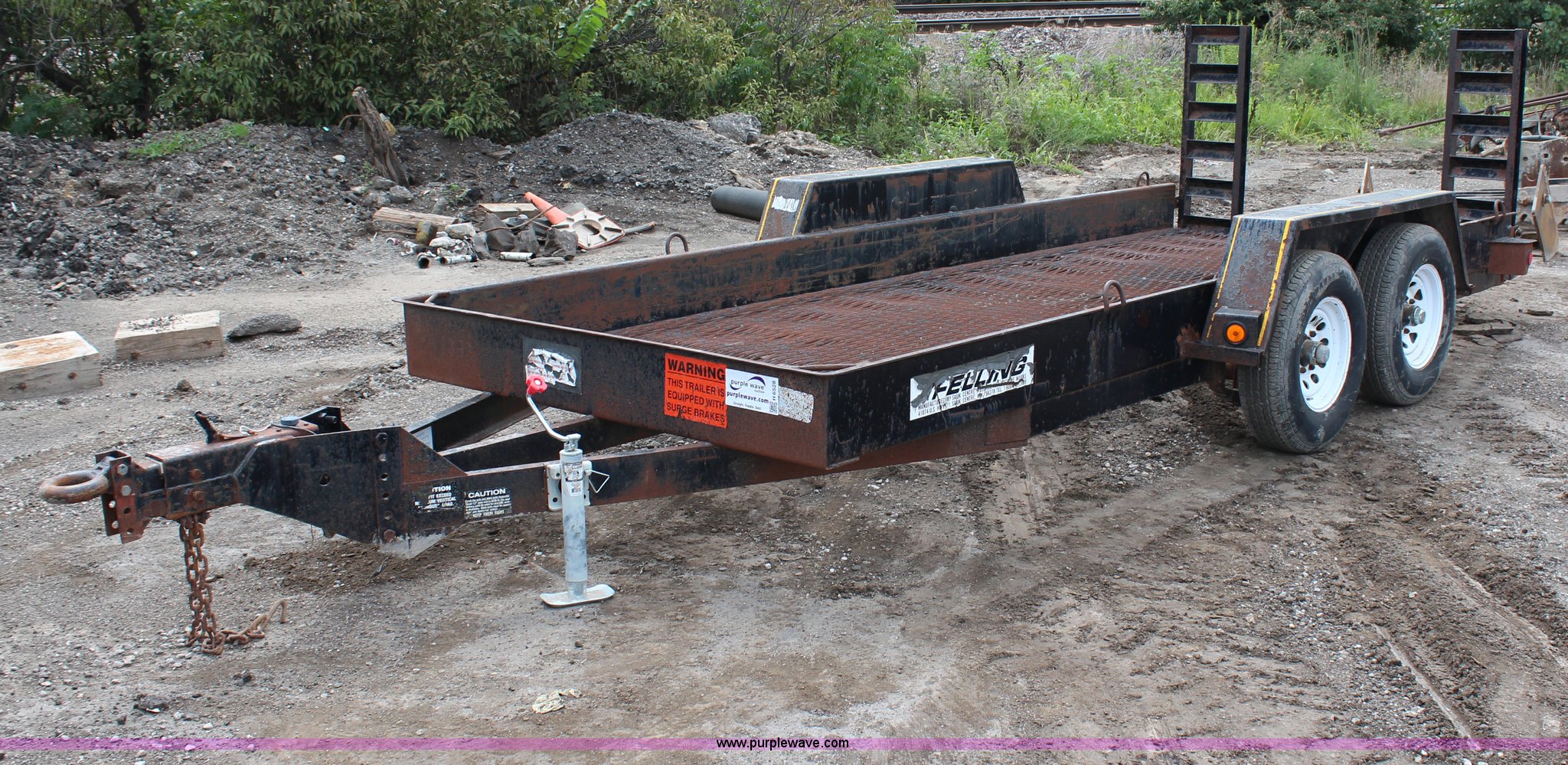 Purple Wave is selling a used Equip. Trailer in Kansas. This item is a 1996 Felling double axle trailer with the following: 16'L x 74"W, 4' ramps, Pintle hitch, Surge brakes, 225/75R15 tires, GVWR 12,000 lbs, GAWR 6,000 lbs