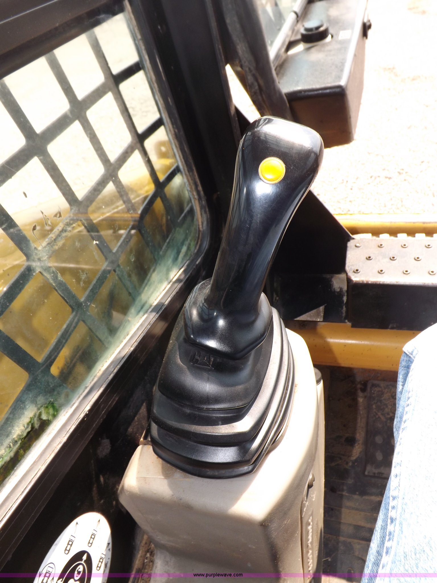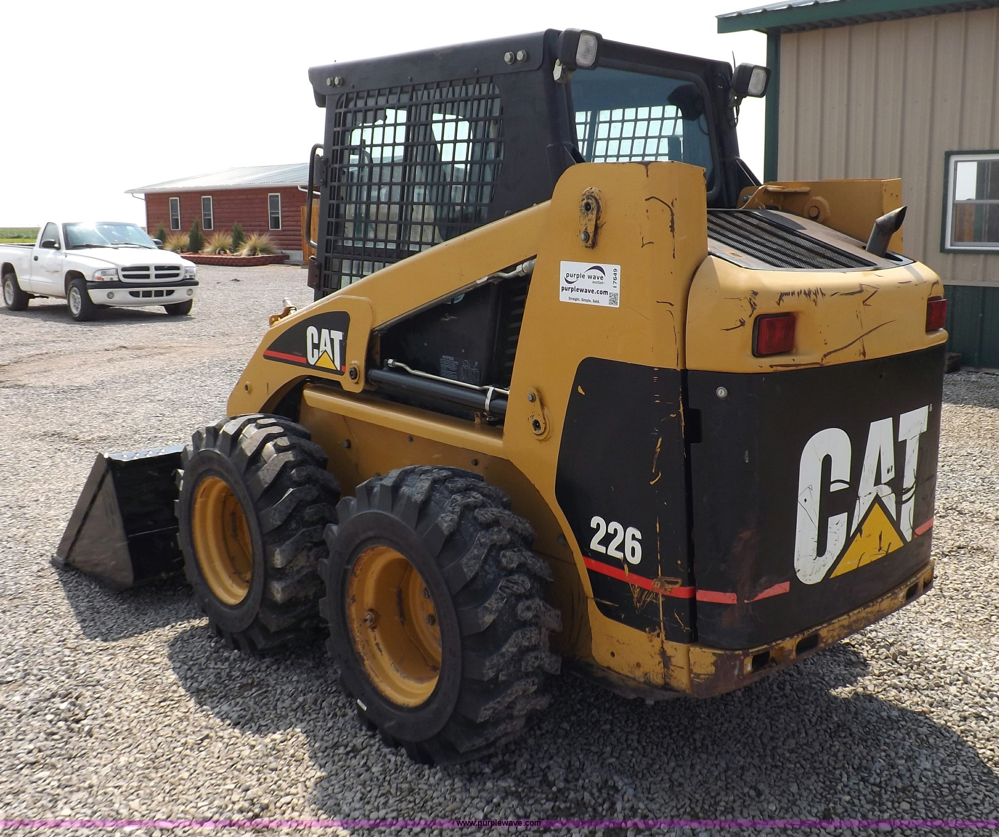 Purple Wave is selling a used Skid Steer Loader in Kansas. This item is a 2004 Caterpillar 226 skid steer with the following: 3,640 hours on meter, Perkins CAT 2.8L four cylinder diesel engine, Enclosed cab, AC and heat, Windshield wipers, Hand and foot throttle, Quick attach bucket release, 6'W bucket, Bolt-on cutting edge, Front and rear work lights, Auxiliary hydraulics, Block heater, 12-16.5 tires, Front glass broken, Auxiliary hydraulic line kinked, Seat torn, Serial CAT00226E5FZ10873