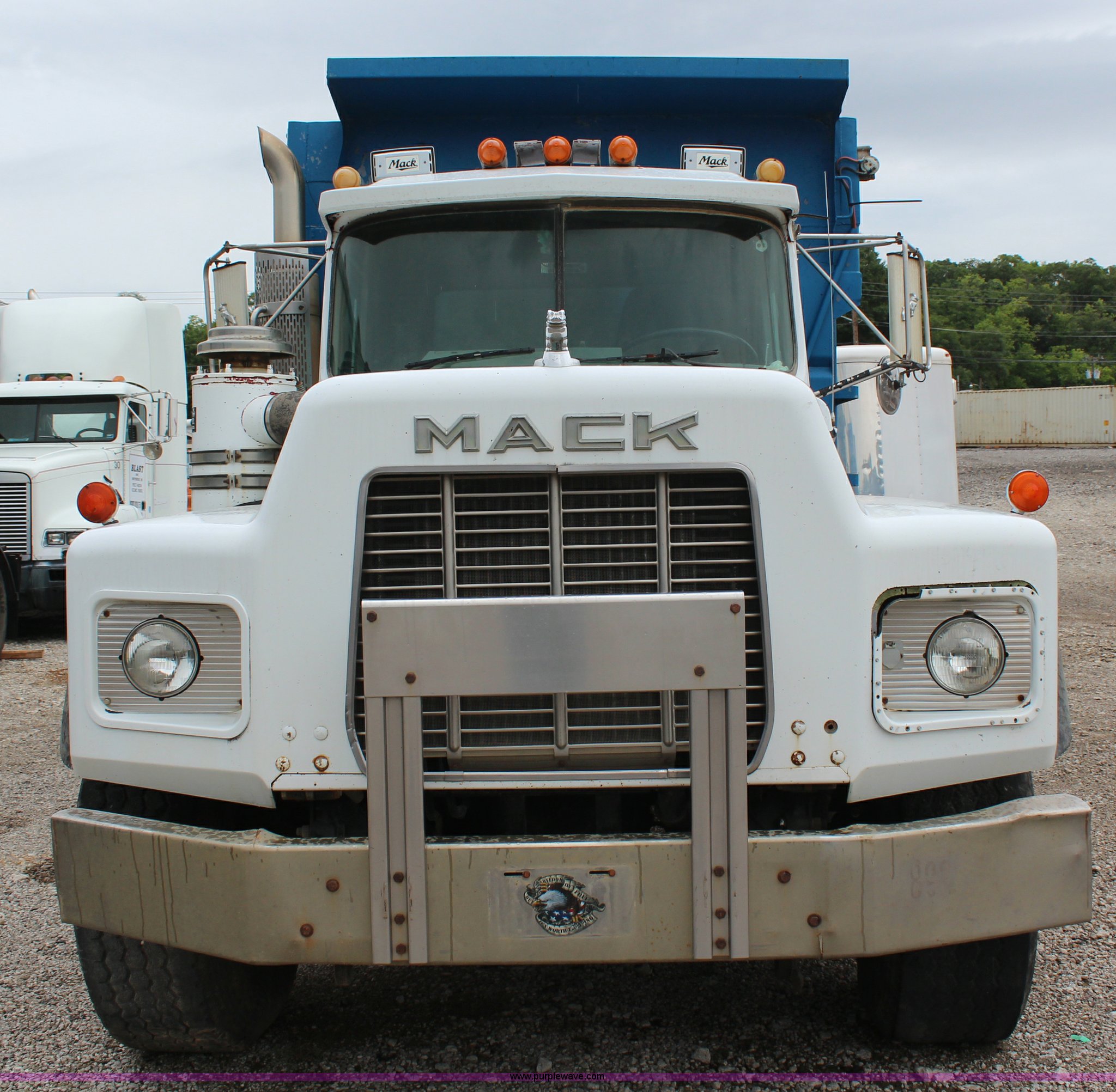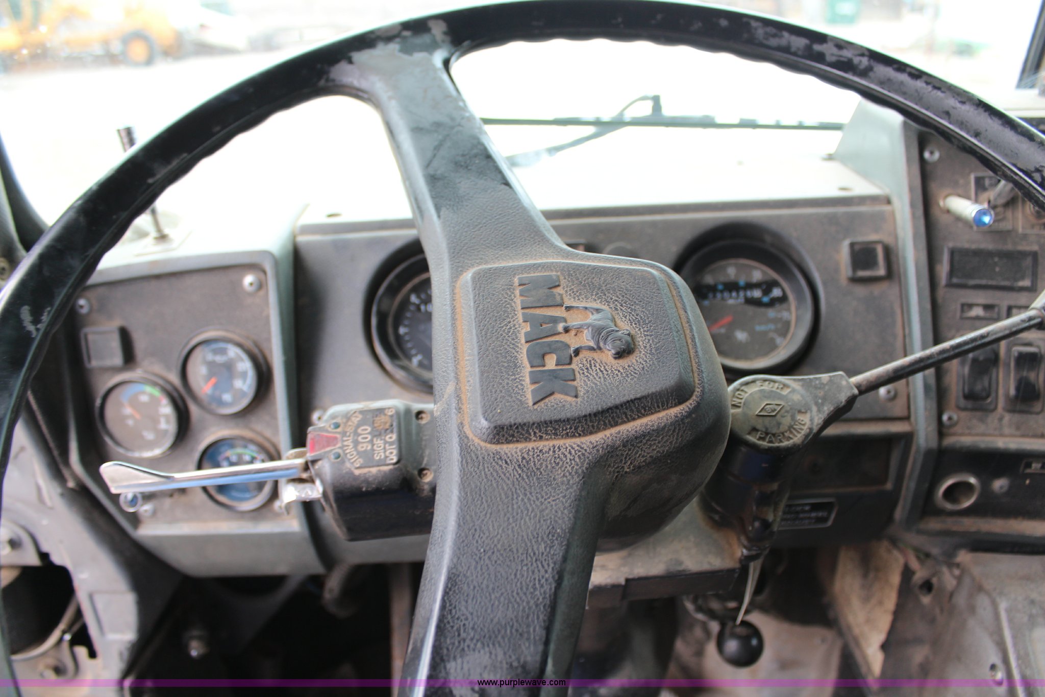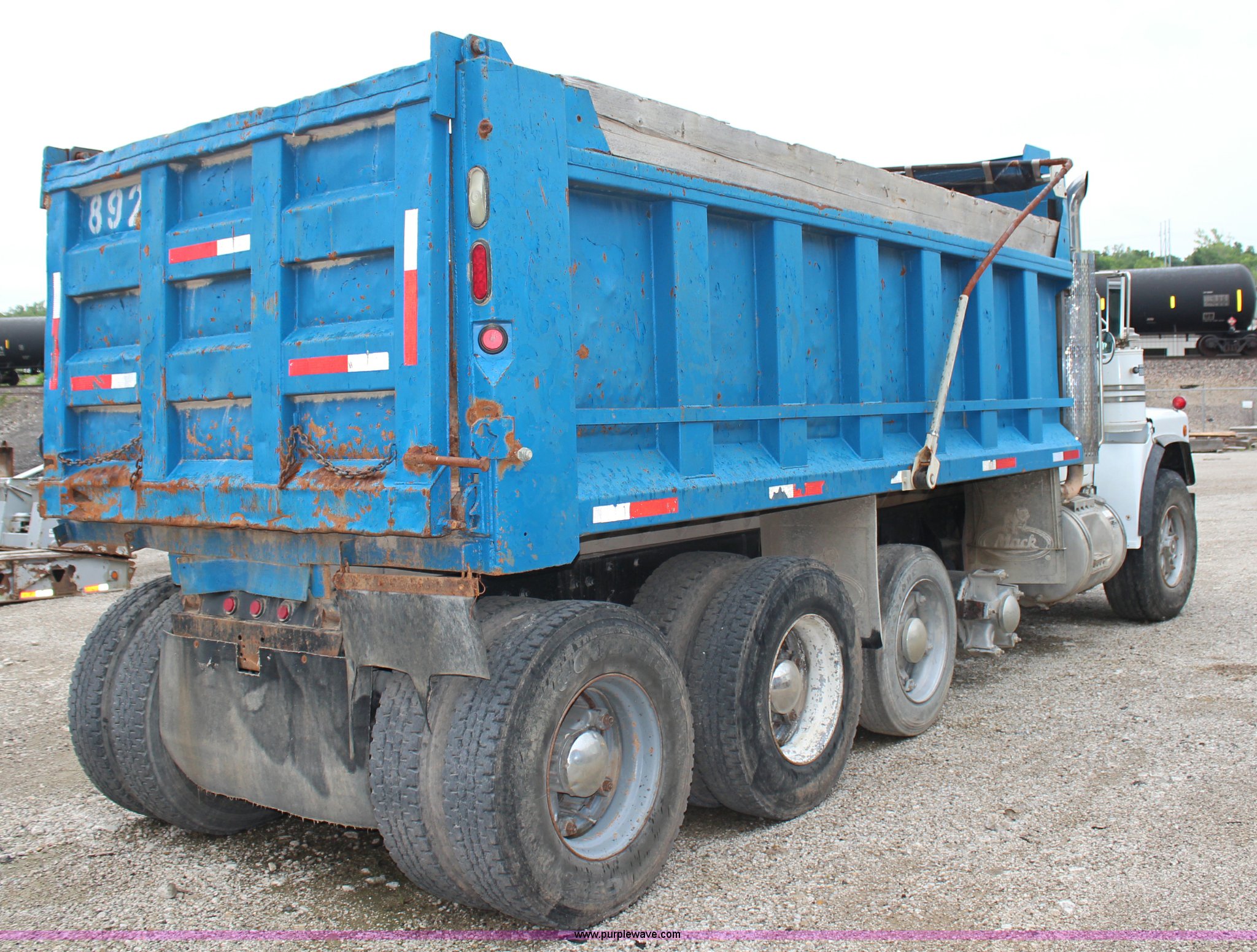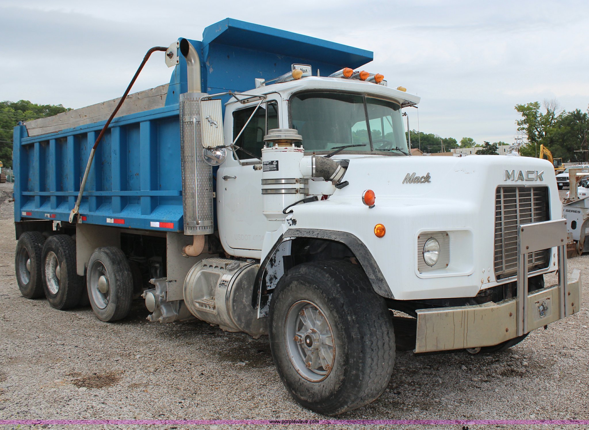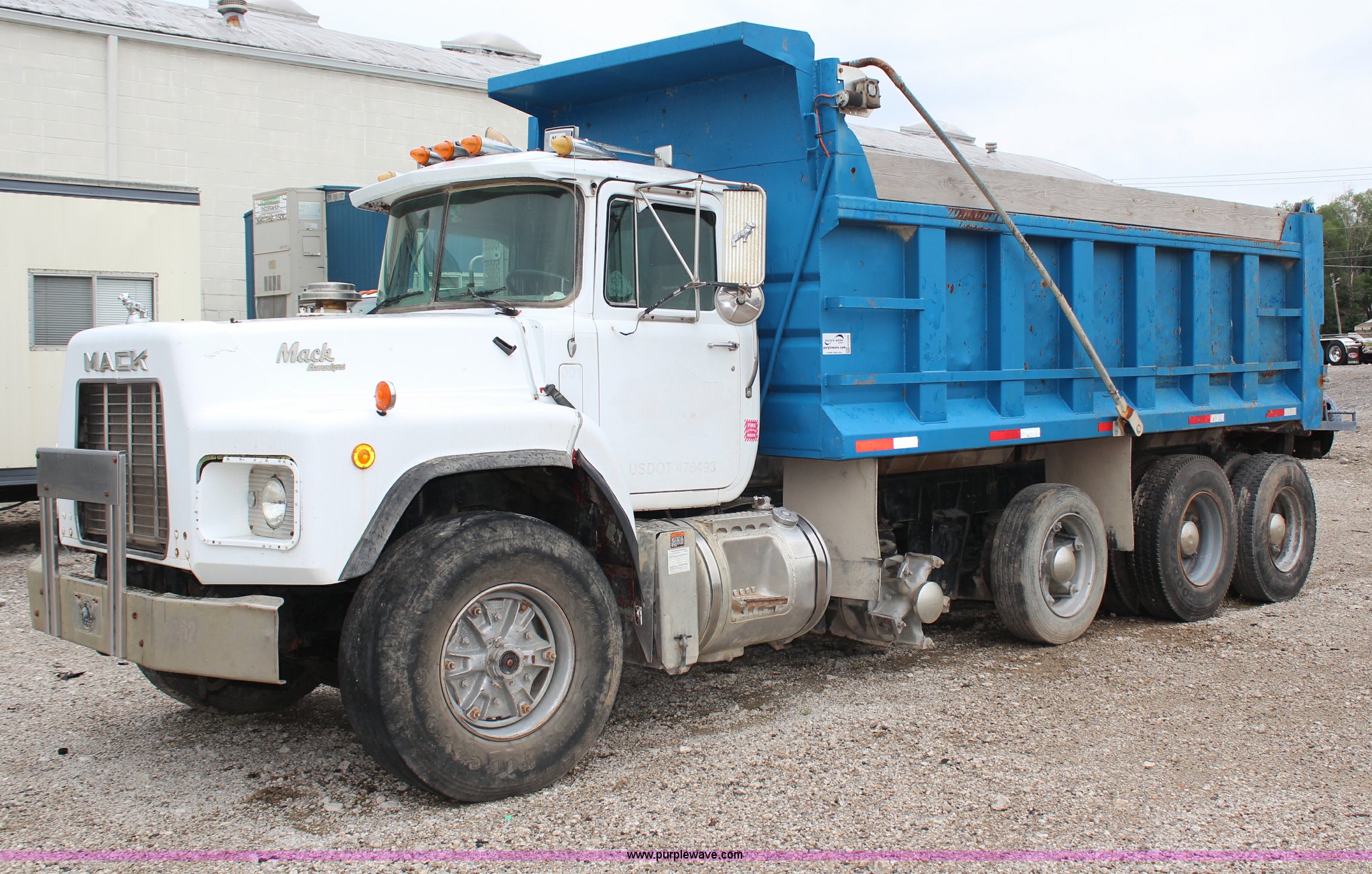 Purple Wave is selling a used Construction Dump Truck in Kansas. This item is a 1992 Mack RD688S quad axle dump truck with the following: 230,426 miles on odometer, 10,879 hours on meter, Mack E7-400 12.0L L6 diesel engine, 400 HP, Eaton Fuller 13 speed manual transmission, Twin screw, AC and heat, AM/FM/cassette, Air suspension seat, 17'L dump bed, Air operated end gate, Single ram hoist, Electric roll over tarp, Exterior visor, Chrome bumper, Air up, air down pusher axles, Front pusher axle steerable, PTO, Dual 59 gallon fuel tanks, Spring suspension, Air brakes, Jake brake, 425/65R22.5 front tires, 225/70R22.5 pusher axle tires, 11R22.5 rear tires, GVWR 78,000 lbs, FAWR 18,000 lbs, IAWR 19,000 lbs, RAWR 19,000 lbs, 12,000 lbs pusher axles, Front pusher axle missing tires, Left headlight is loose, Cosmetic damage, Dead batteries