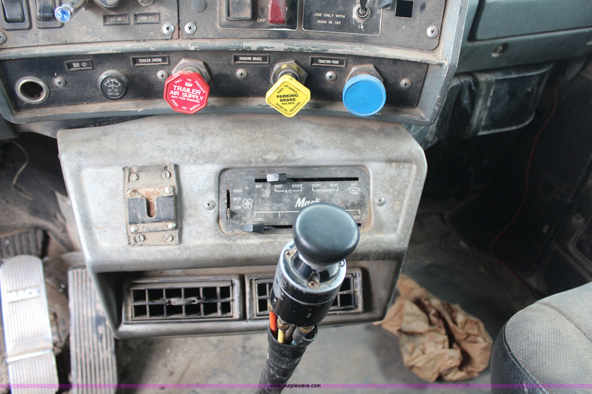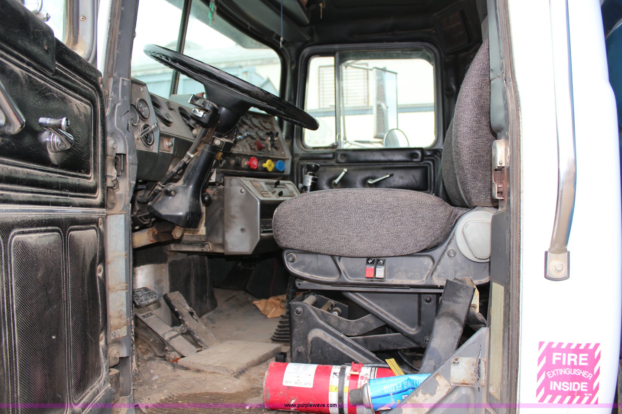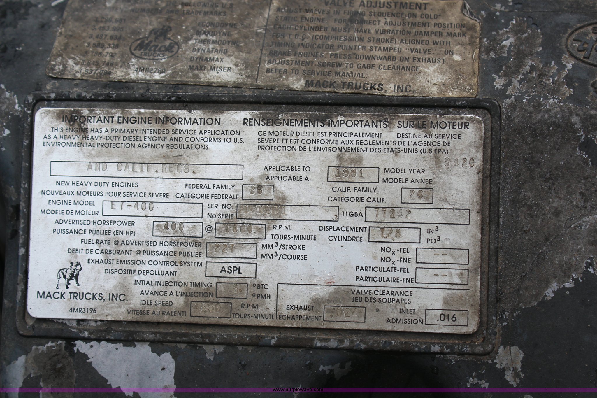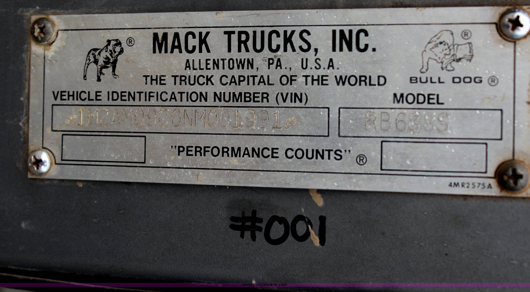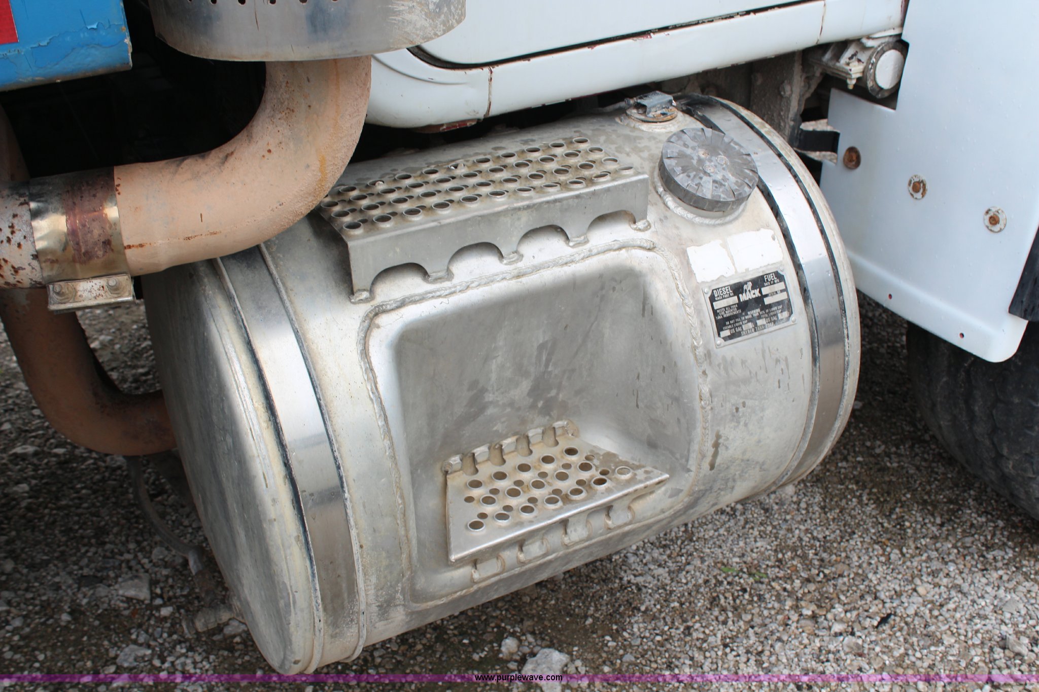 Purple Wave is selling a used Construction Dump Truck in Kansas. This item is a 1992 Mack RD688S quad axle dump truck with the following: 230,426 miles on odometer, 10,879 hours on meter, Mack E7-400 12.0L L6 diesel engine, 400 HP, Eaton Fuller 13 speed manual transmission, Twin screw, AC and heat, AM/FM/cassette, Air suspension seat, 17'L dump bed, Air operated end gate, Single ram hoist, Electric roll over tarp, Exterior visor, Chrome bumper, Air up, air down pusher axles, Front pusher axle steerable, PTO, Dual 59 gallon fuel tanks, Spring suspension, Air brakes, Jake brake, 425/65R22.5 front tires, 225/70R22.5 pusher axle tires, 11R22.5 rear tires, GVWR 78,000 lbs, FAWR 18,000 lbs, IAWR 19,000 lbs, RAWR 19,000 lbs, 12,000 lbs pusher axles, Front pusher axle missing tires, Left headlight is loose, Cosmetic damage, Dead batteries