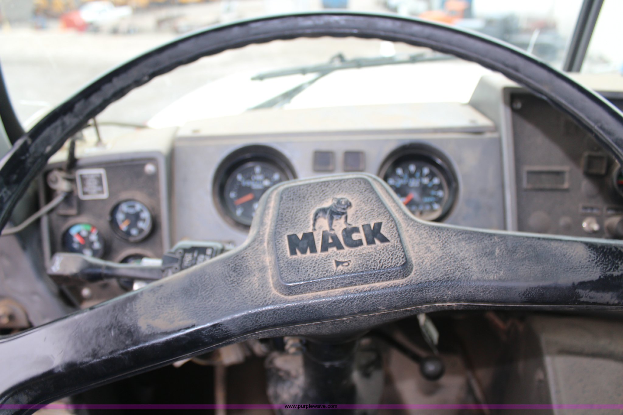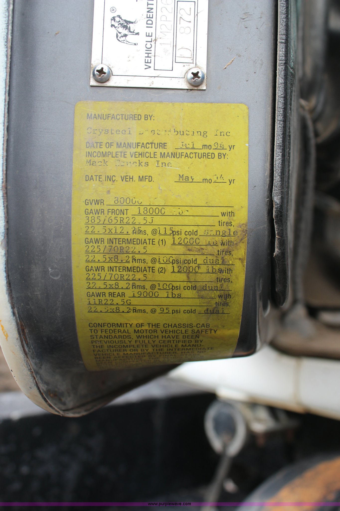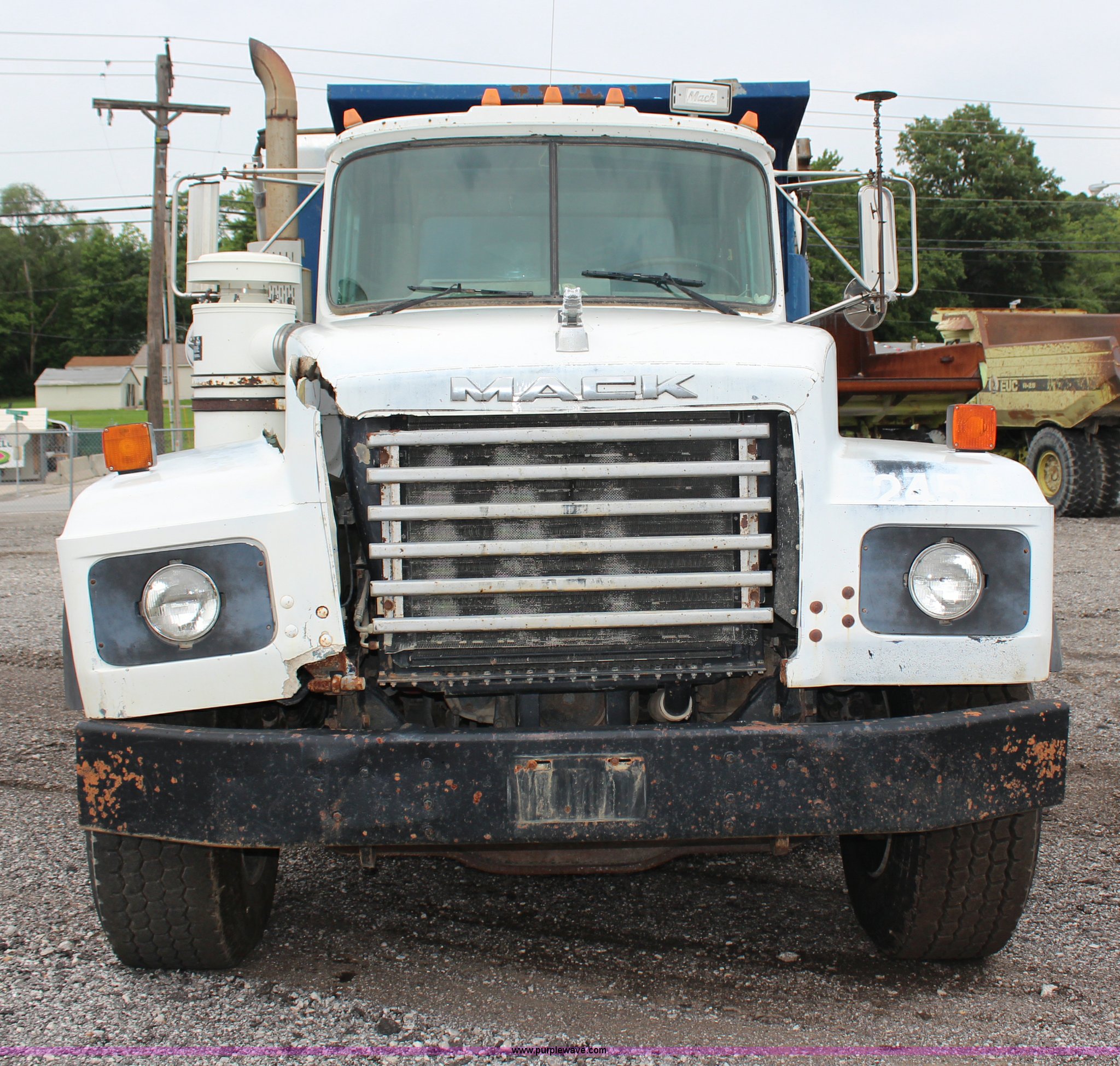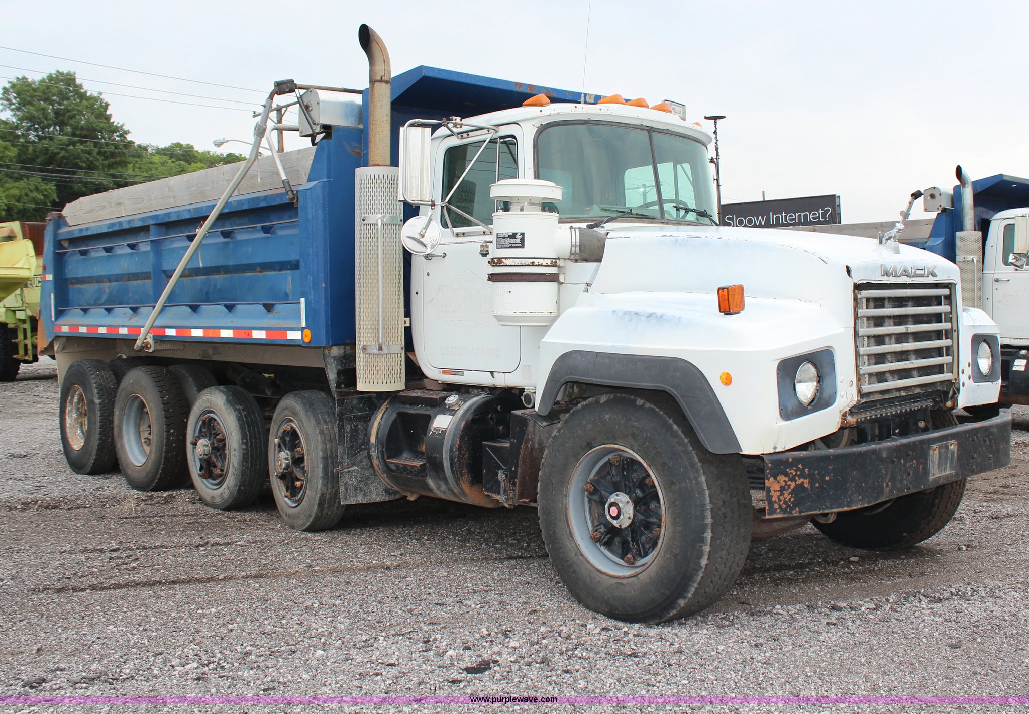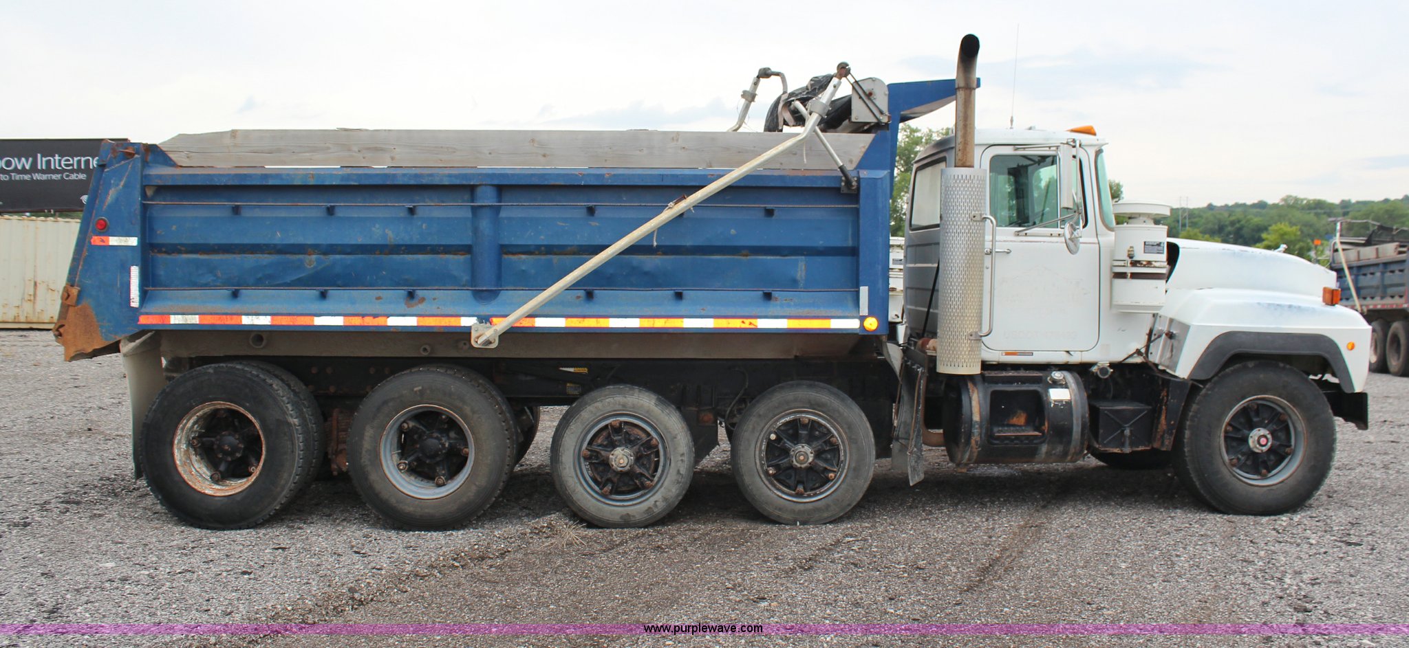 Purple Wave is selling a used Construction Dump Truck in Kansas. This item is a 1994 Mack RS688S quad axle dump truck with the following: 407,831 miles on odometer, 25,571 hours on meter, Mack E7-350 12.0L L6 diesel engine, Eaton Fuller eight speed manual transmission, Twin screw, AC and heat, AM/FM/cassette, Air suspension seat, 17'L dump bed, Air operated end gate, Single ram hoist, Electric roll over tarp, Air up, air down pusher axles, Front pusher axle is steerable, Dual 59 gallon fuel tanks, PTO, Spring suspension, Air brakes, 425/65R22.5 front tires, 225/70R22.5 pusher tires, 11R22.5 rear tires, GVWR 78,000 lbs, FAWR 18,000 lbs, IAWR 19,000 lbs, RAWR 19,000 lbs, Dual 12,000 lbs pusher axles, Hood damage, Tarp damage