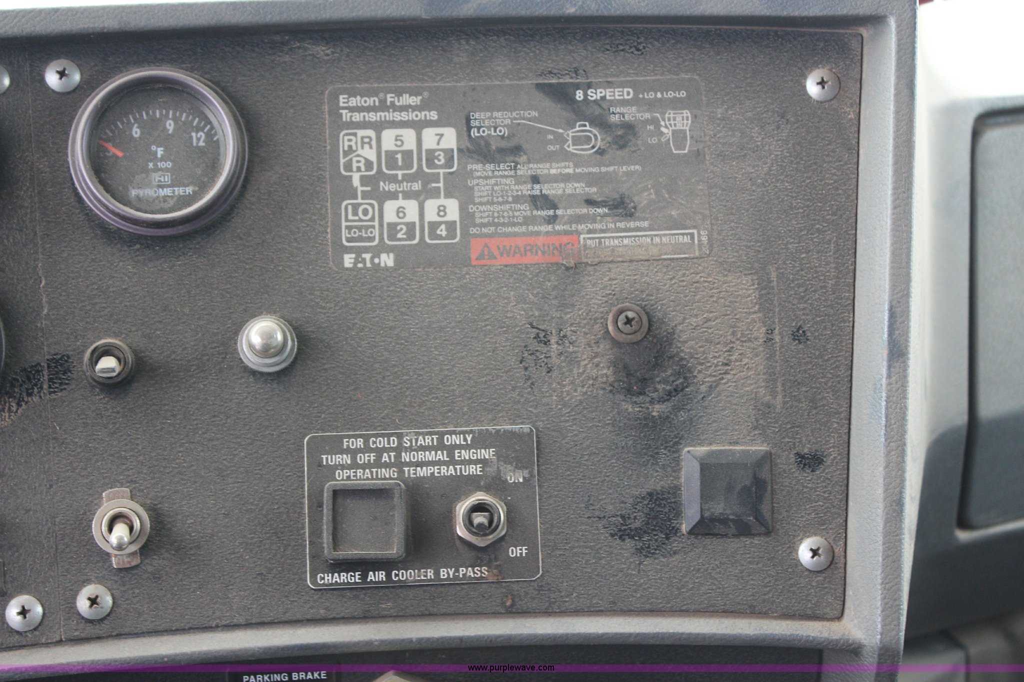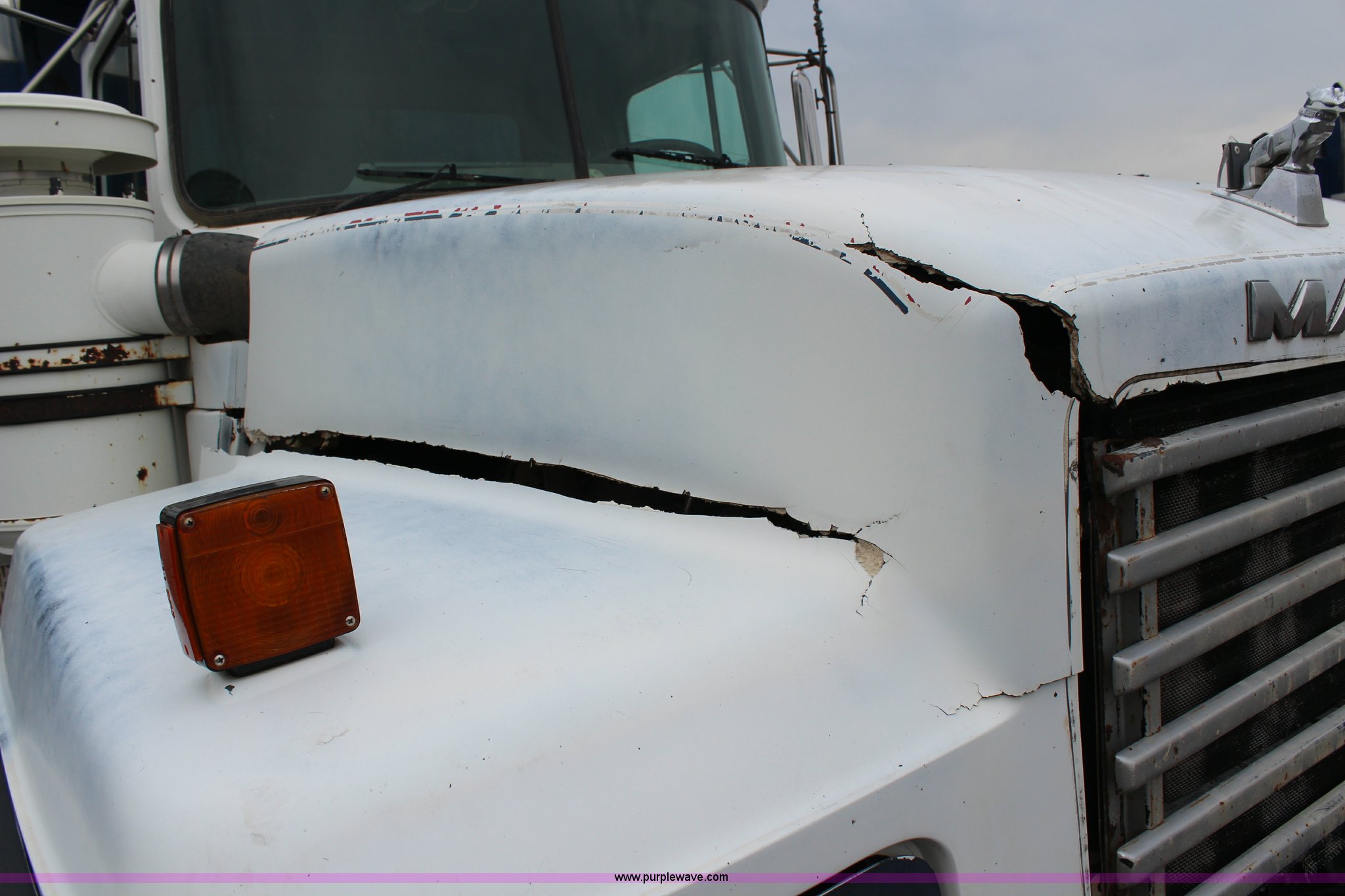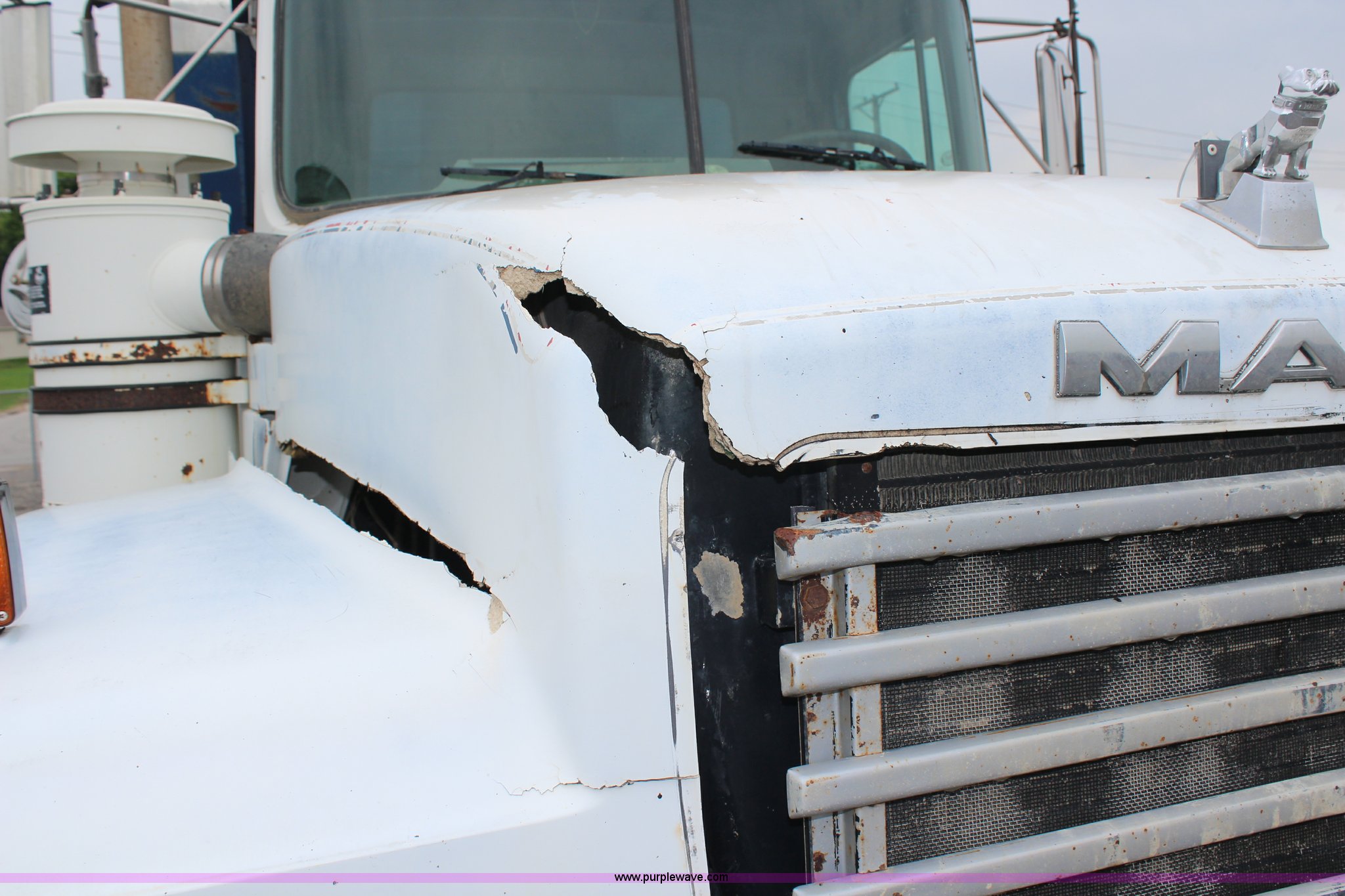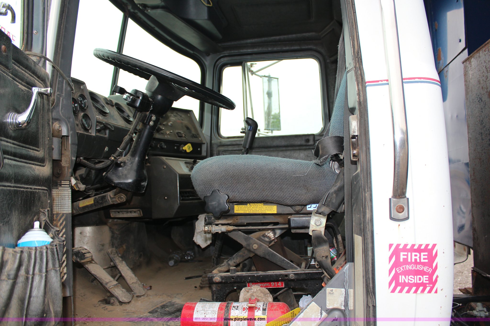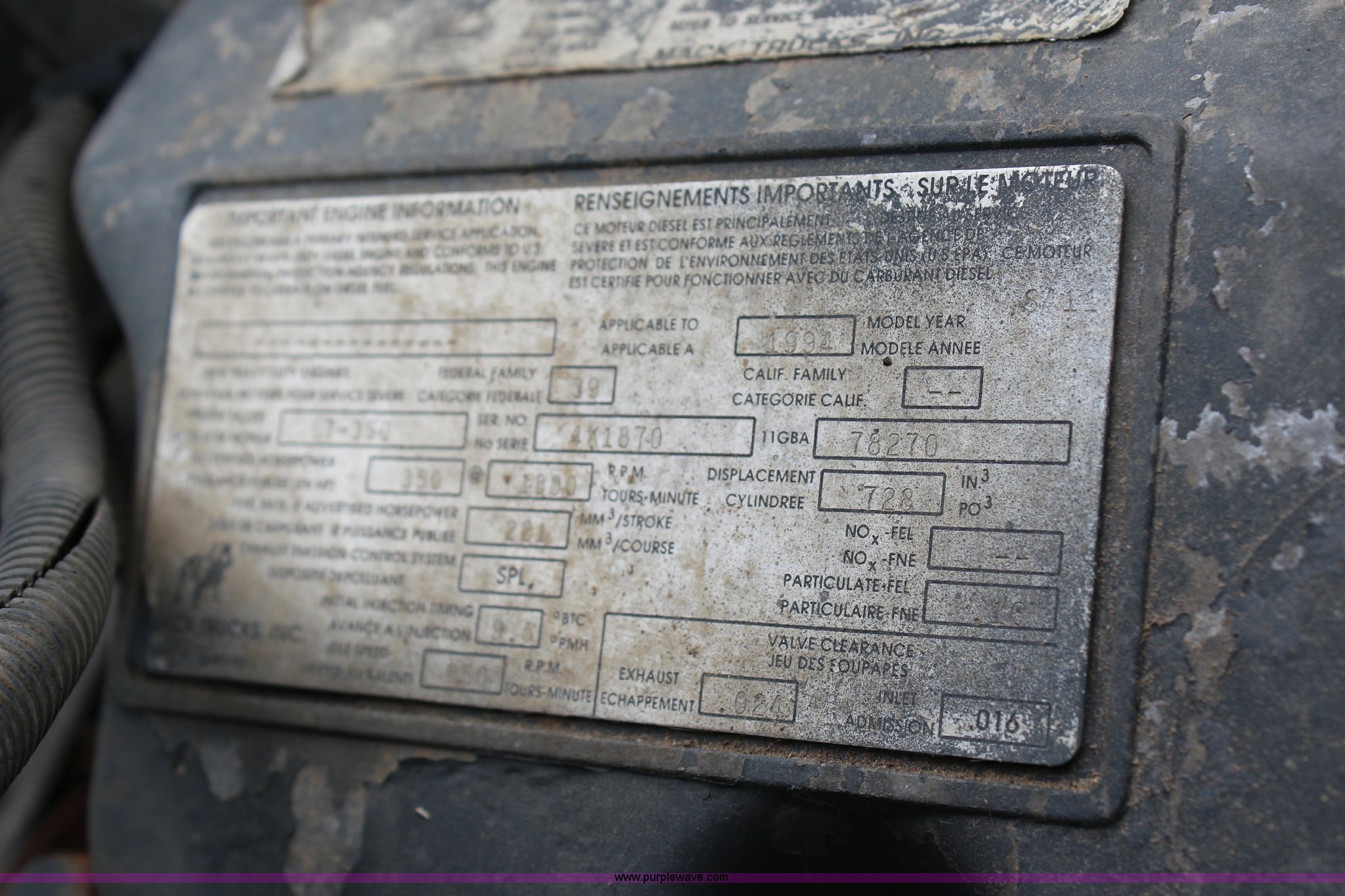 Purple Wave is selling a used Construction Dump Truck in Kansas. This item is a 1994 Mack RS688S quad axle dump truck with the following: 407,831 miles on odometer, 25,571 hours on meter, Mack E7-350 12.0L L6 diesel engine, Eaton Fuller eight speed manual transmission, Twin screw, AC and heat, AM/FM/cassette, Air suspension seat, 17'L dump bed, Air operated end gate, Single ram hoist, Electric roll over tarp, Air up, air down pusher axles, Front pusher axle is steerable, Dual 59 gallon fuel tanks, PTO, Spring suspension, Air brakes, 425/65R22.5 front tires, 225/70R22.5 pusher tires, 11R22.5 rear tires, GVWR 78,000 lbs, FAWR 18,000 lbs, IAWR 19,000 lbs, RAWR 19,000 lbs, Dual 12,000 lbs pusher axles, Hood damage, Tarp damage