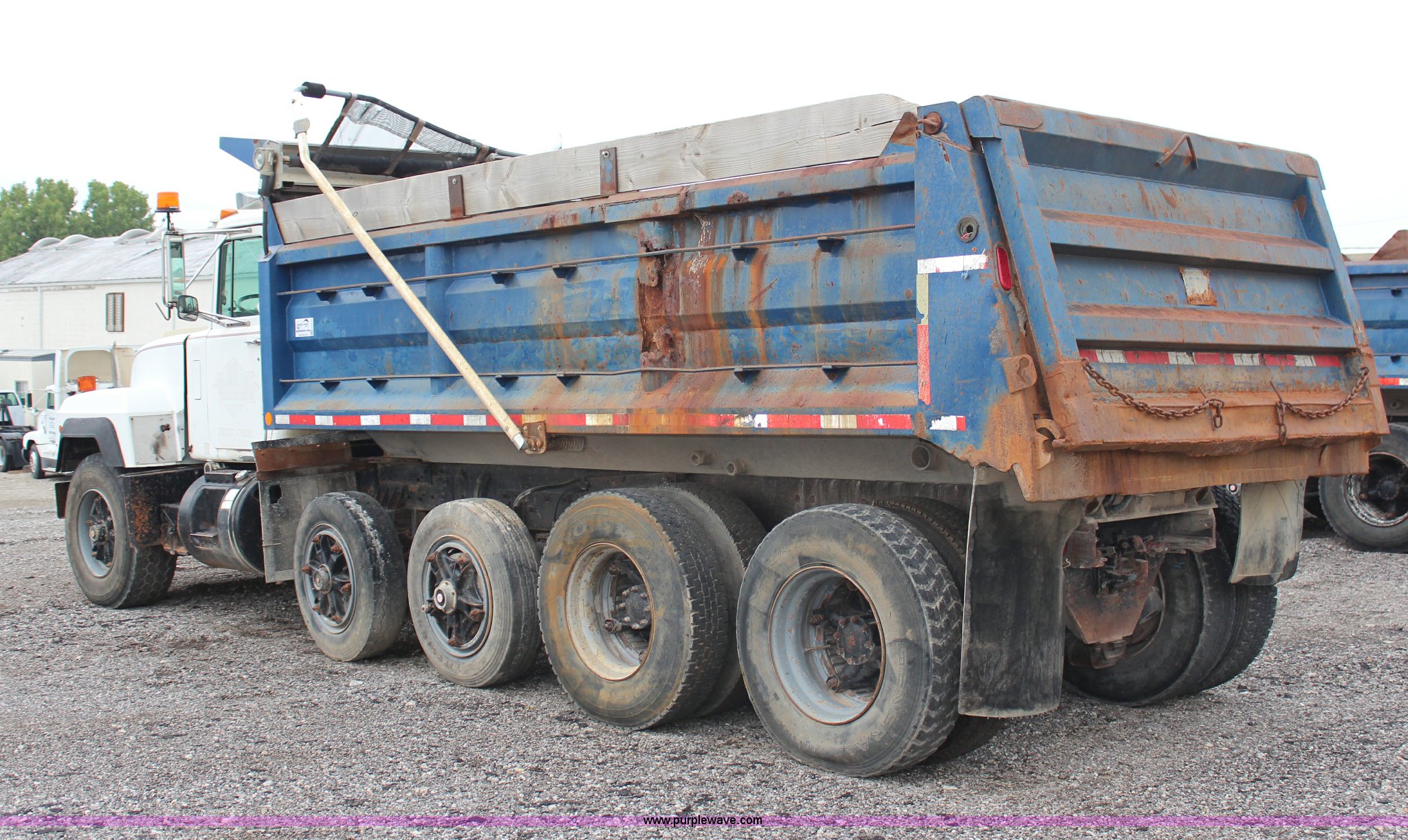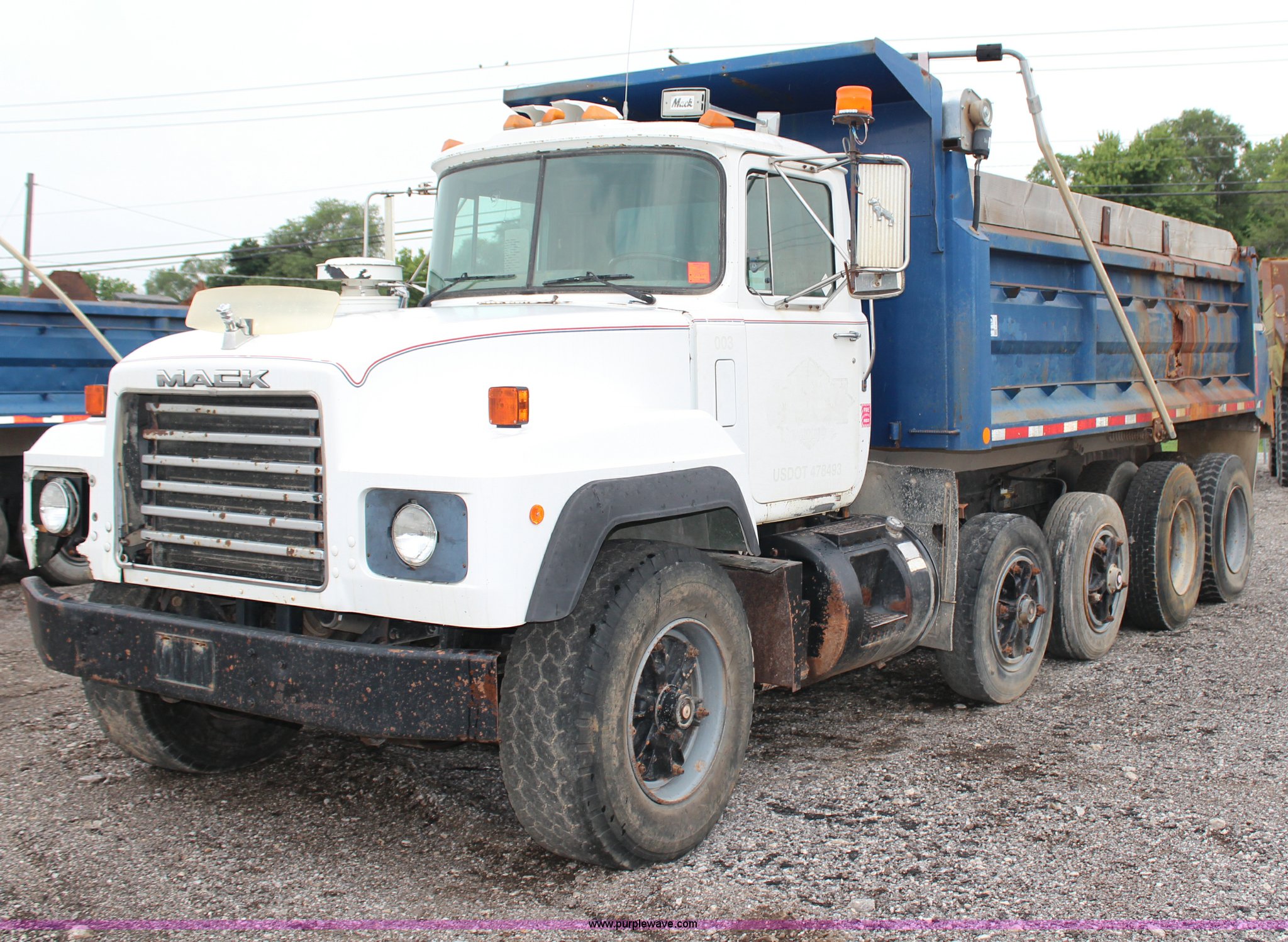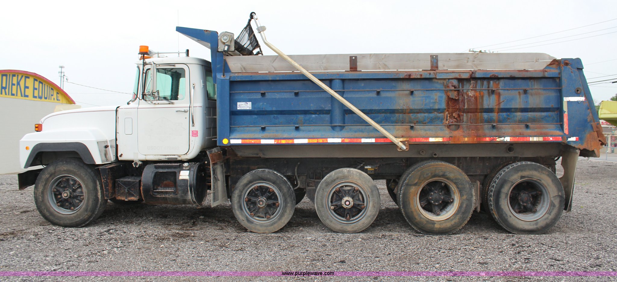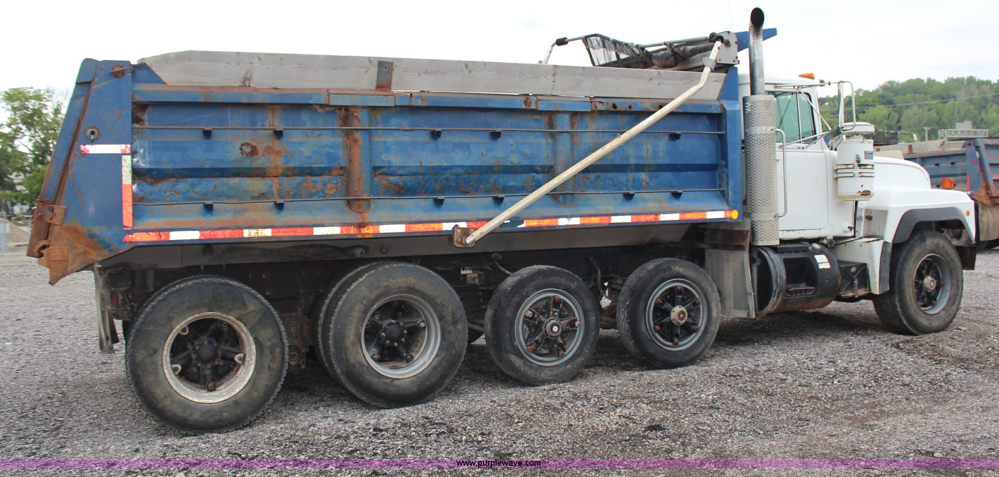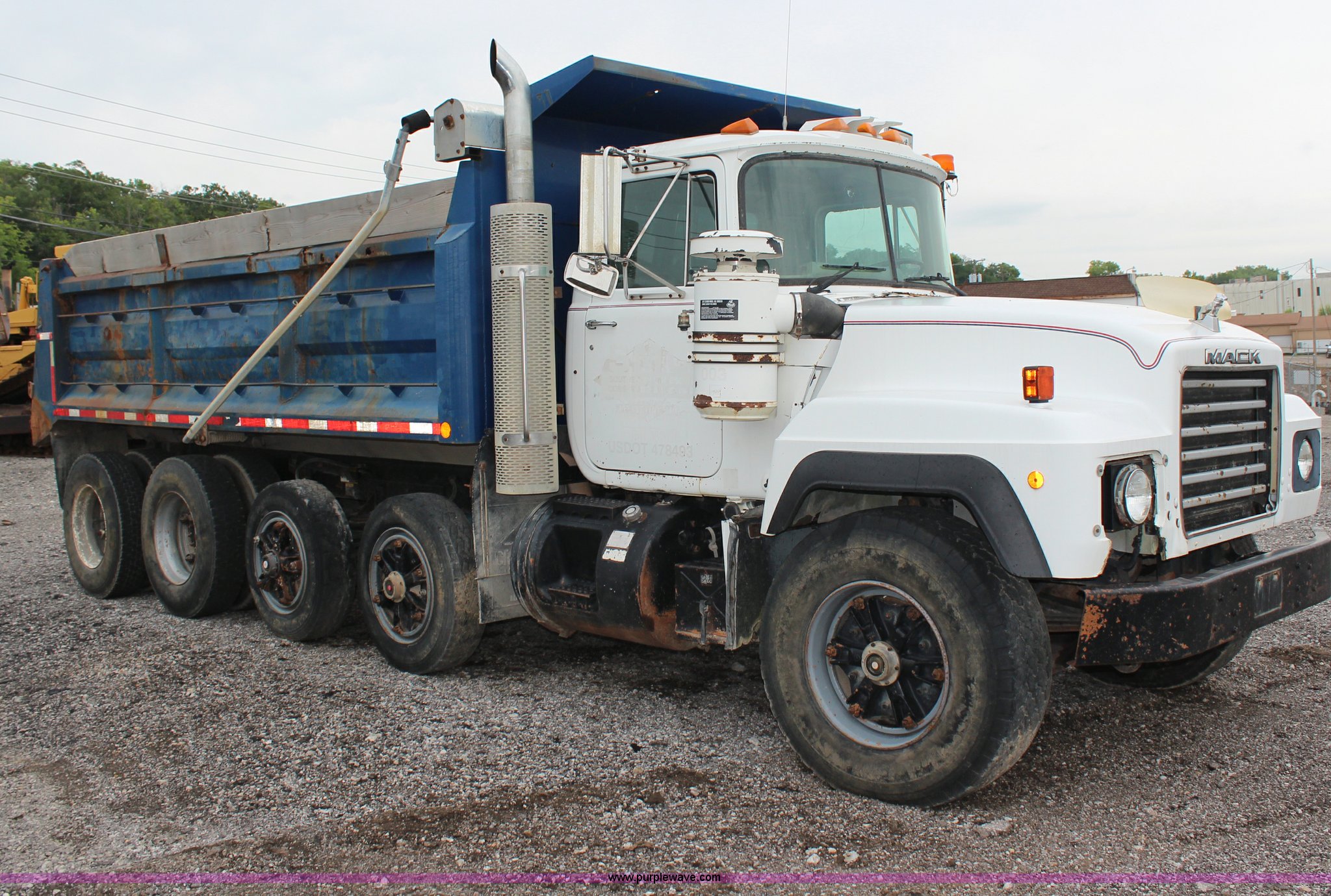 Purple Wave is selling a used Construction Dump Truck in Kansas. This item is a 1994 Mack RS688S quad axle dump truck with the following: 171,928 miles on odometer, 25,924 hours on meter, Mack E7-350 12L L6 diesel engine, 350 HP, Eaton Fuller eight speed manual transmission, Twin screw, AC and heat, AM/FM/cassette, Air suspension seat, 17'L dump bed, Air operated end gate, Electric roll over tarp, Single ram hoist, PTO, Dual 59 gallon fuel tanks, Pintle hitch, Air up, air down pusher axles, Front pusher axle is steerable, Spring suspension, Air brakes, 425/65R22.5 front tires, 225/70R22.5 pusher axle tires, 11R22.5 rear tires, GVWR 78,000 lbs, FAWR 18,000 lbs, IAWR 19,000 lbs, RAWR 19,000 lbs, Dual 12,000 lbs pusher axles, Hood damage, Bed rust