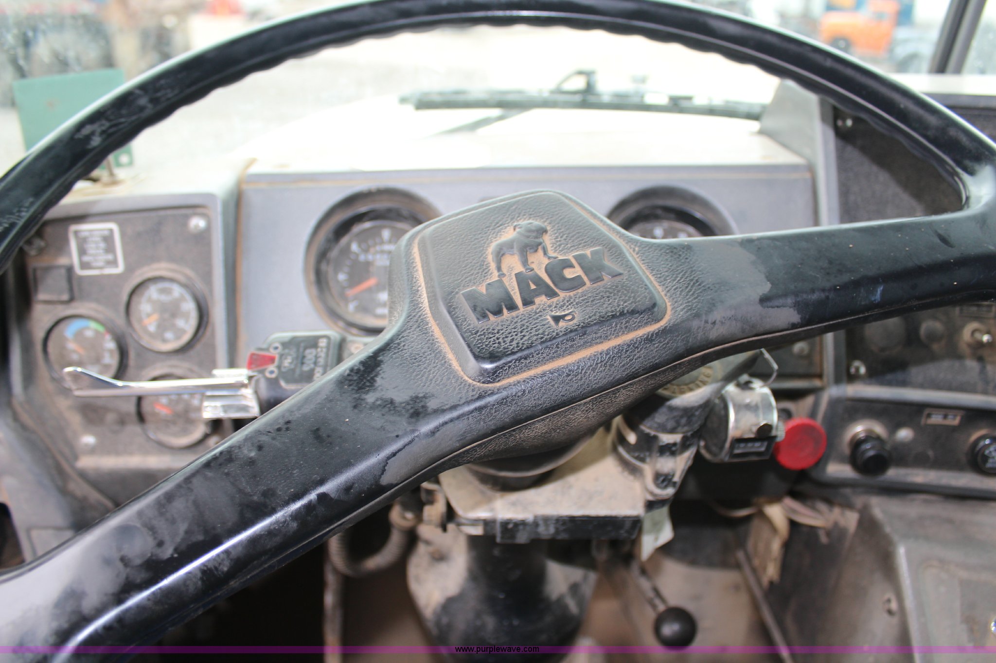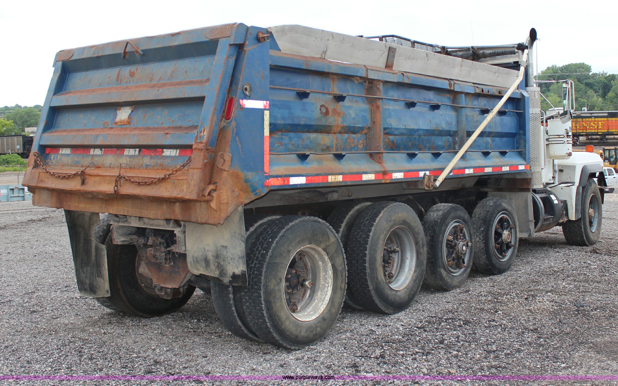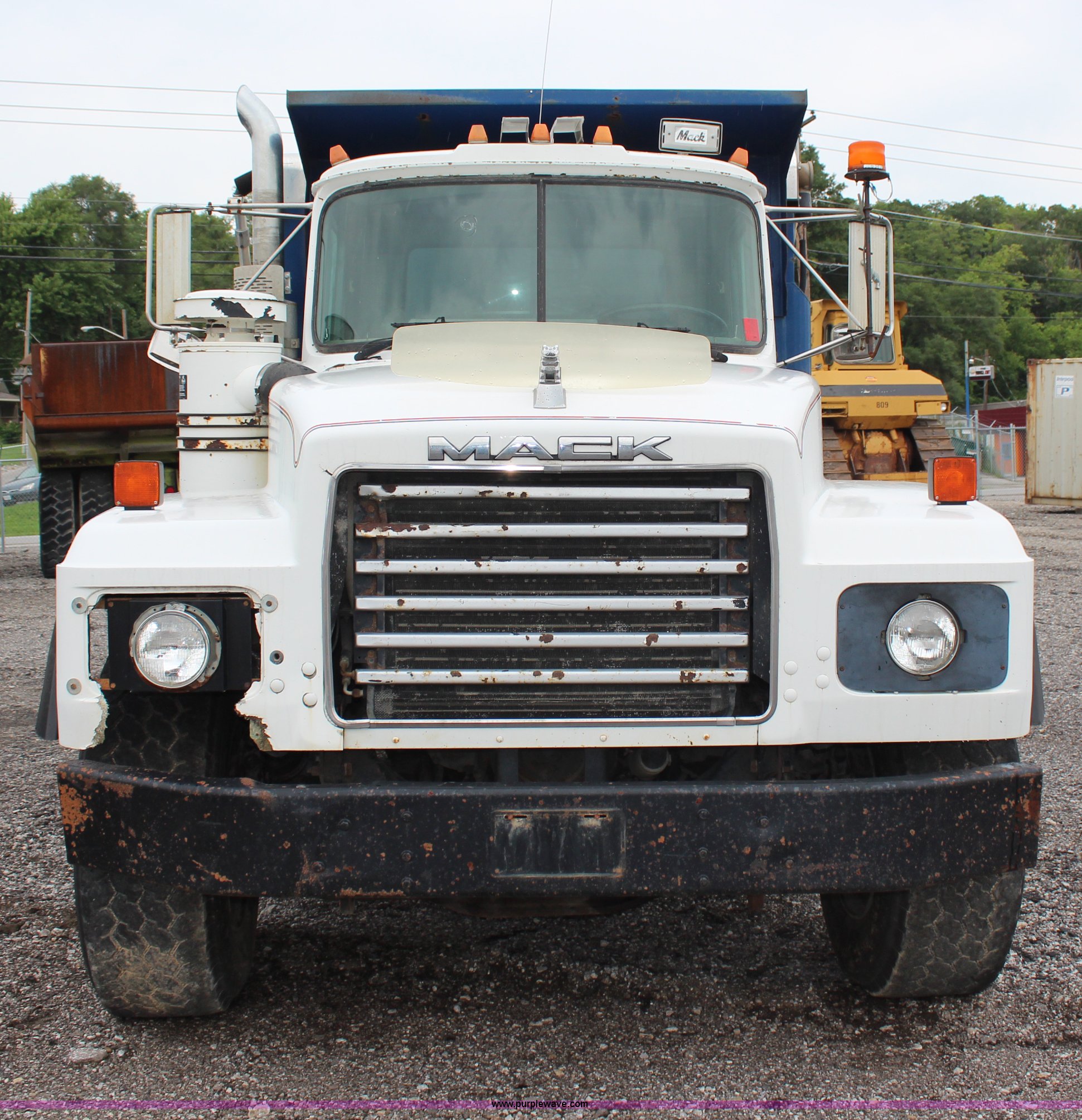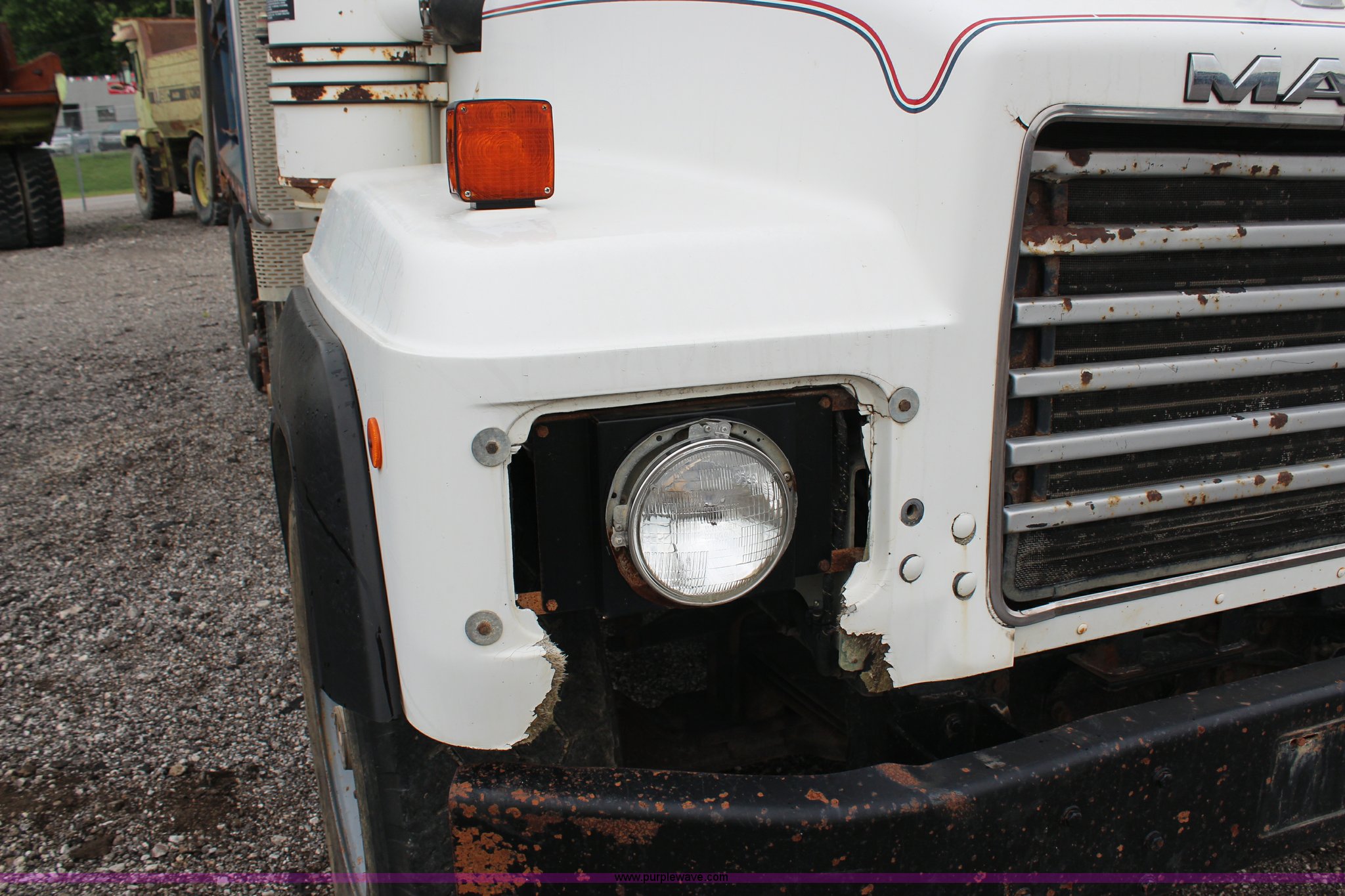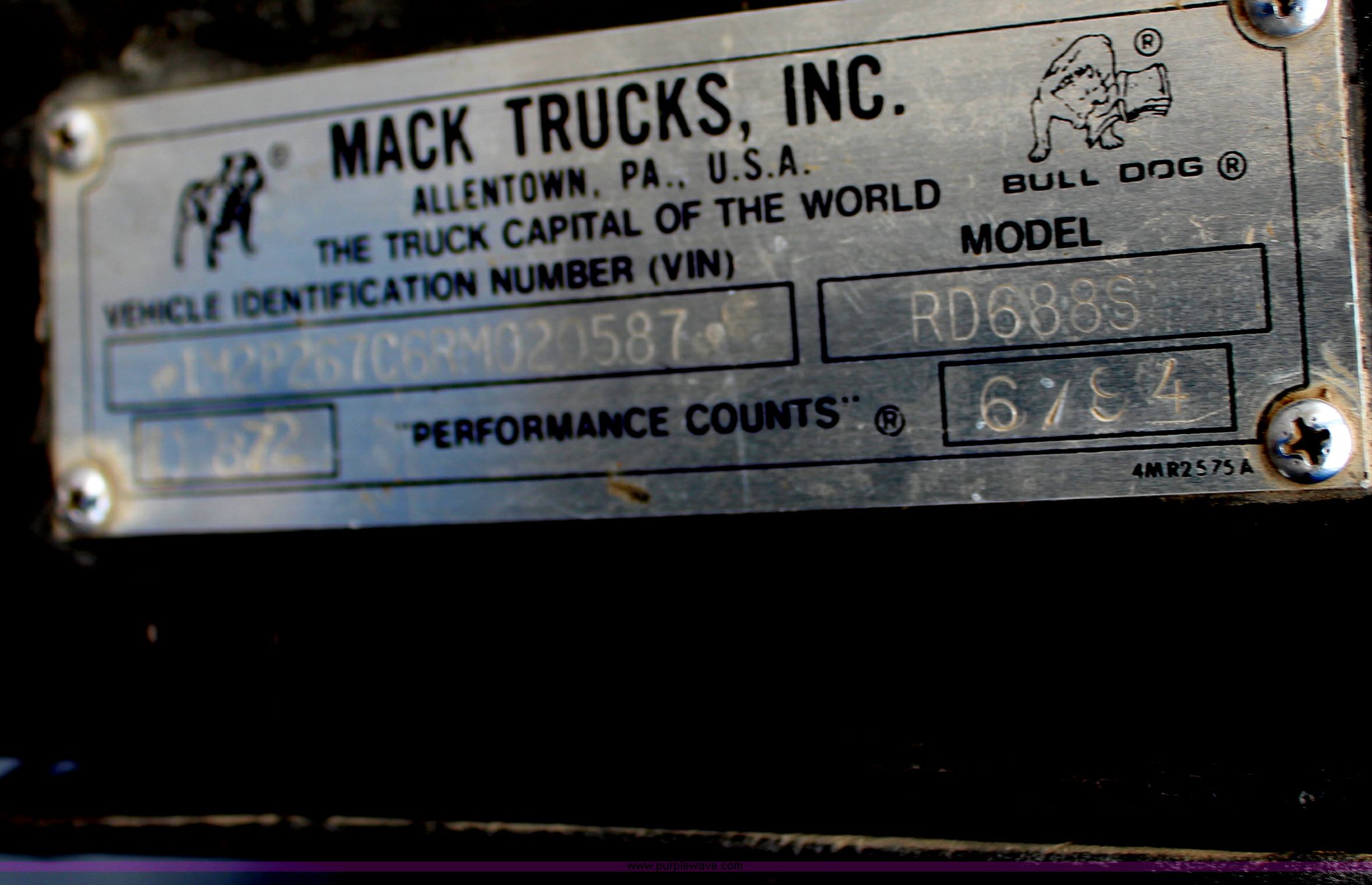 Purple Wave is selling a used Construction Dump Truck in Kansas. This item is a 1994 Mack RS688S quad axle dump truck with the following: 171,928 miles on odometer, 25,924 hours on meter, Mack E7-350 12L L6 diesel engine, 350 HP, Eaton Fuller eight speed manual transmission, Twin screw, AC and heat, AM/FM/cassette, Air suspension seat, 17'L dump bed, Air operated end gate, Electric roll over tarp, Single ram hoist, PTO, Dual 59 gallon fuel tanks, Pintle hitch, Air up, air down pusher axles, Front pusher axle is steerable, Spring suspension, Air brakes, 425/65R22.5 front tires, 225/70R22.5 pusher axle tires, 11R22.5 rear tires, GVWR 78,000 lbs, FAWR 18,000 lbs, IAWR 19,000 lbs, RAWR 19,000 lbs, Dual 12,000 lbs pusher axles, Hood damage, Bed rust