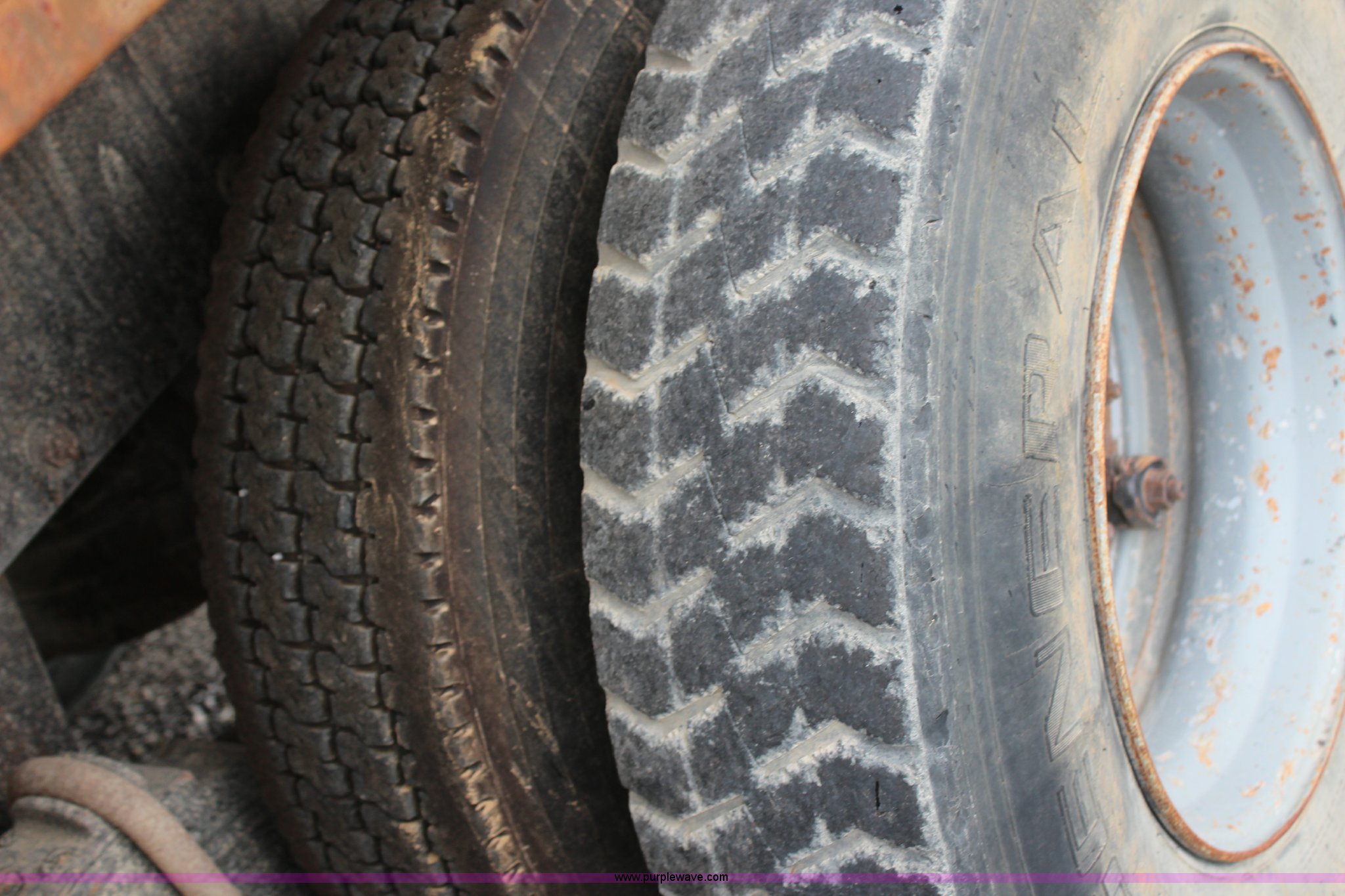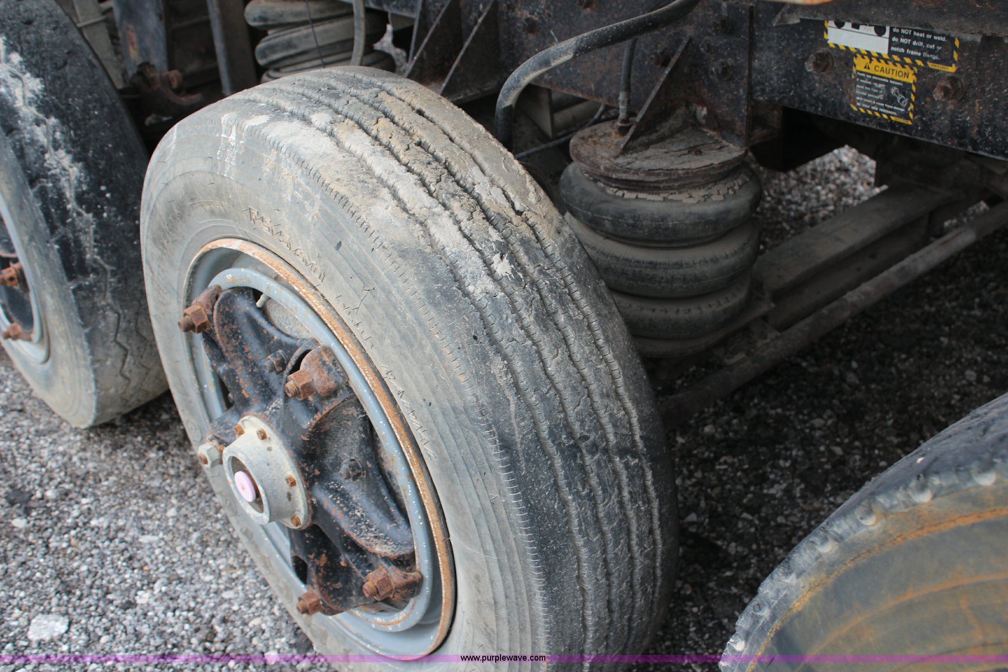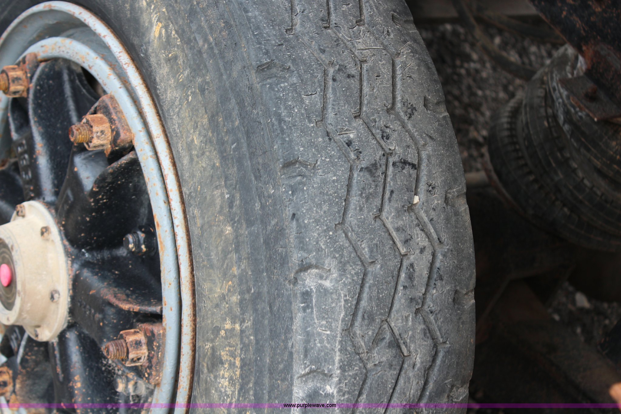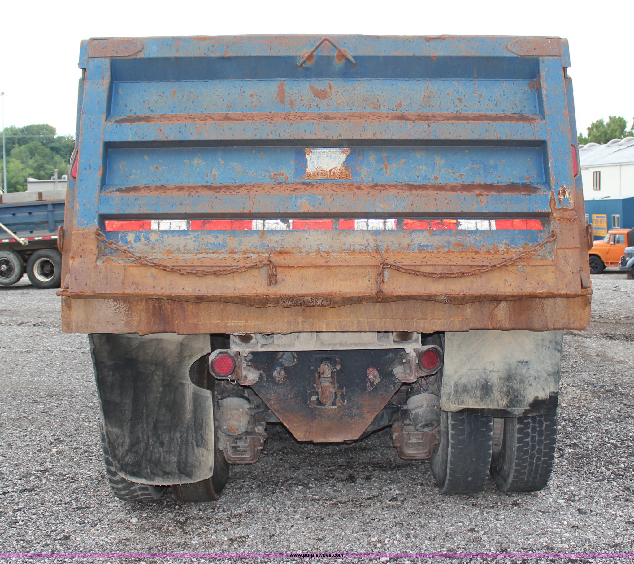 Purple Wave is selling a used Construction Dump Truck in Kansas. This item is a 1994 Mack RS688S quad axle dump truck with the following: 171,928 miles on odometer, 25,924 hours on meter, Mack E7-350 12L L6 diesel engine, 350 HP, Eaton Fuller eight speed manual transmission, Twin screw, AC and heat, AM/FM/cassette, Air suspension seat, 17'L dump bed, Air operated end gate, Electric roll over tarp, Single ram hoist, PTO, Dual 59 gallon fuel tanks, Pintle hitch, Air up, air down pusher axles, Front pusher axle is steerable, Spring suspension, Air brakes, 425/65R22.5 front tires, 225/70R22.5 pusher axle tires, 11R22.5 rear tires, GVWR 78,000 lbs, FAWR 18,000 lbs, IAWR 19,000 lbs, RAWR 19,000 lbs, Dual 12,000 lbs pusher axles, Hood damage, Bed rust