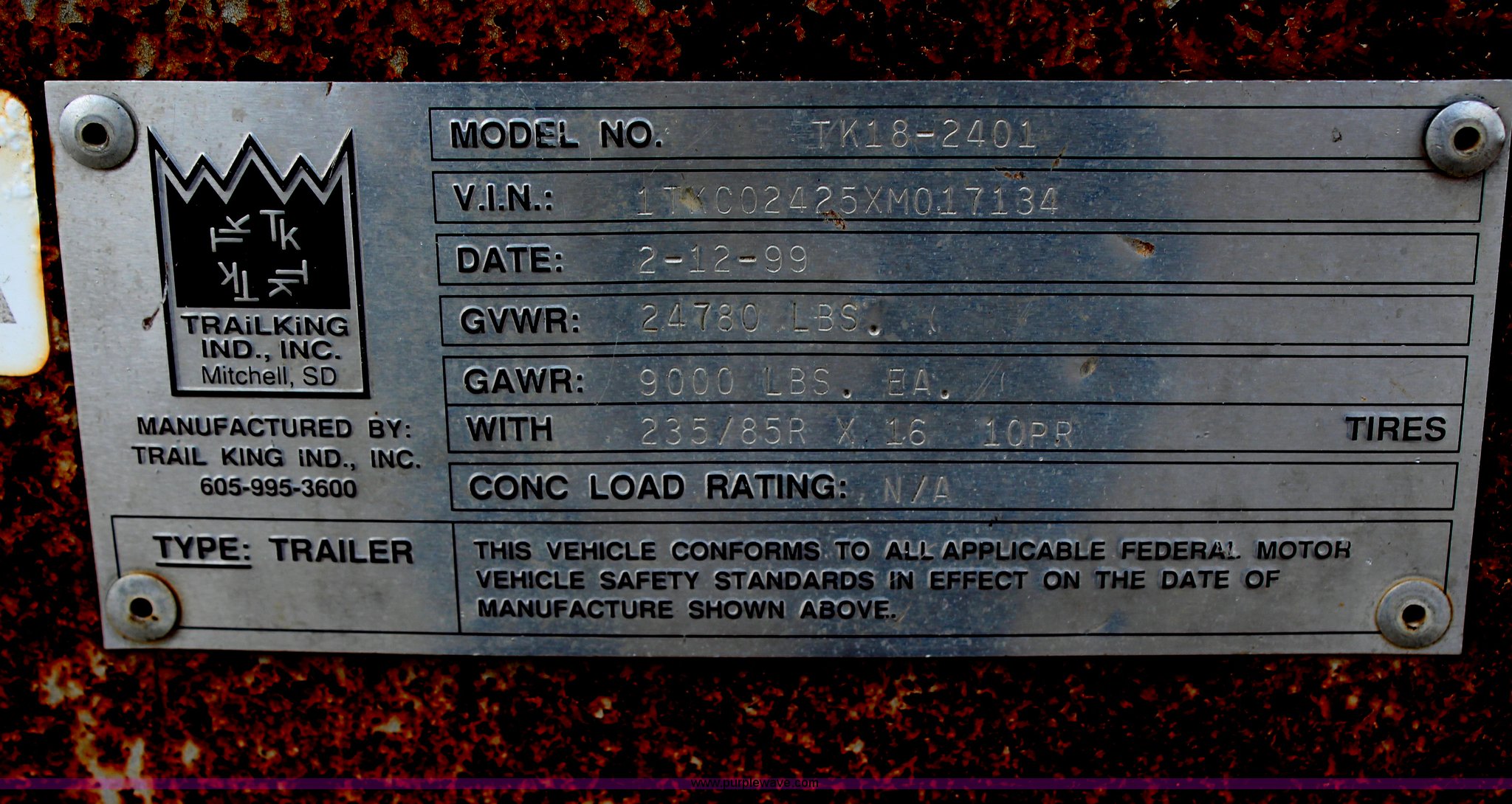 Purple Wave is selling a used Equip. Trailer in Kansas. This item is a 1999 Trail King double axle gooseneck trailer with the following: Model TK18-2401, 24'L x 96"W, 19'L deck, 5' dovetail, 5' ramps, 235/85R16 tires, GVWR 24,780 lbs, FAWR 9,000 lbs