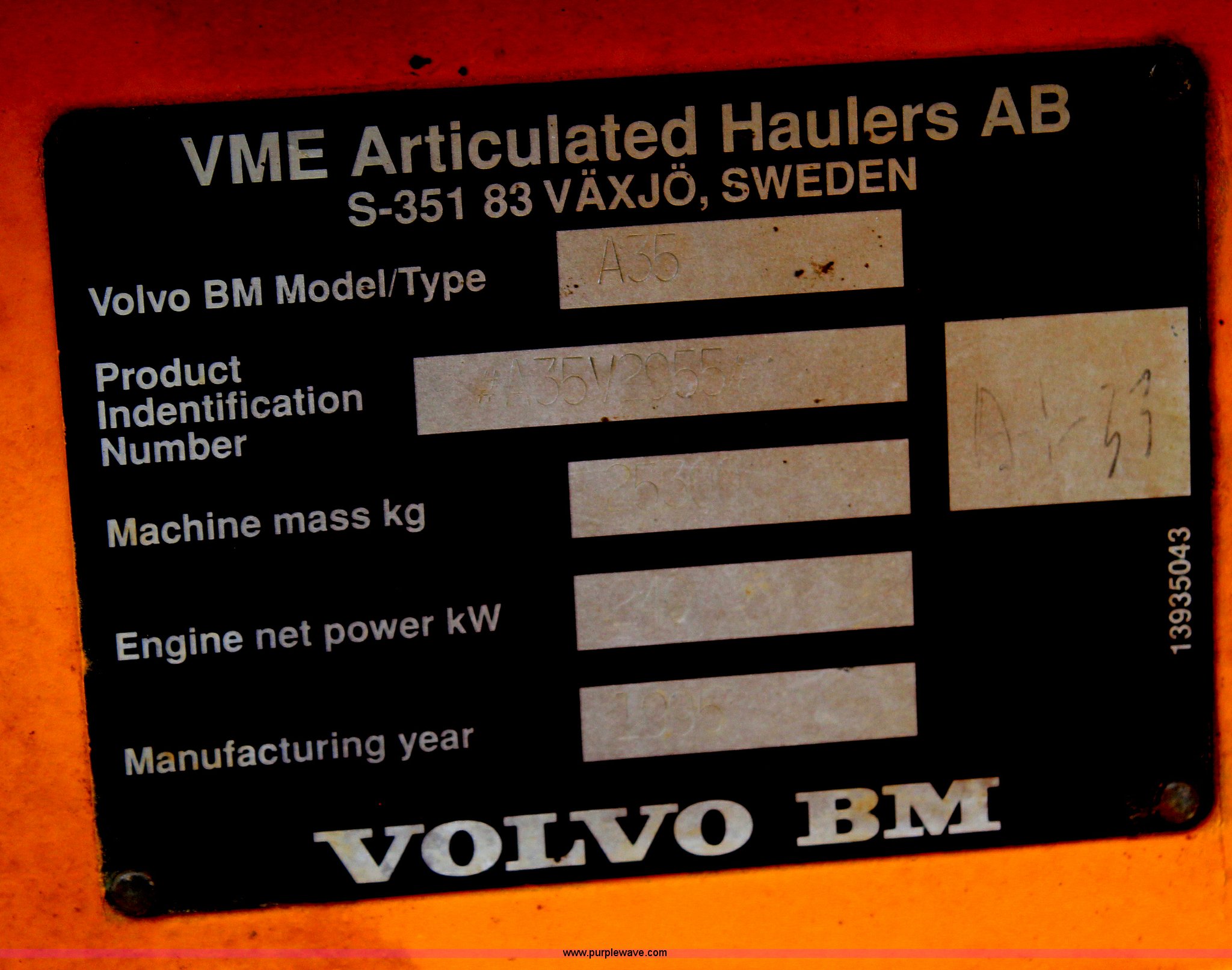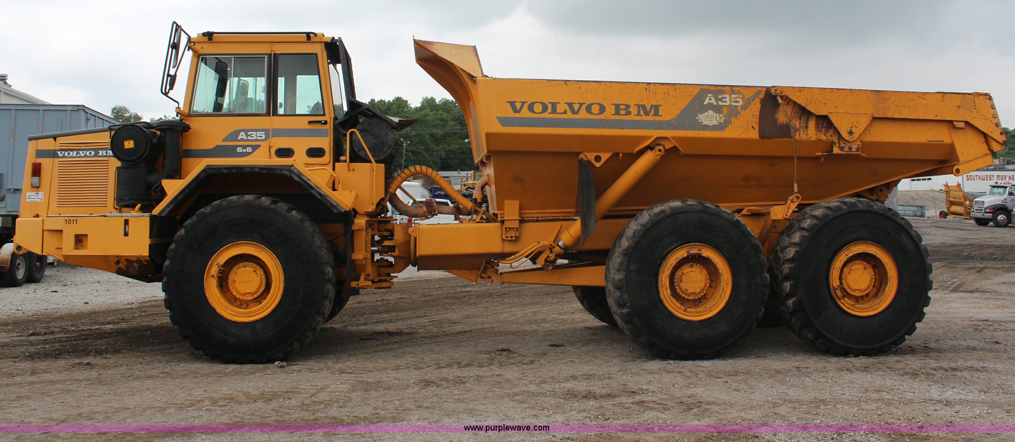 Purple Wave is selling a used Articulated Haul Truck in Kansas. This item is a 1995 Volvo BMA35 articulated haul truck with the following: 16,251 hours on meter, 28,001 km on meter, Volvo six cylinder diesel engine, 320 HP, Automatic transmission, Six wheel drive, AC and heat, Tailgate, 26.5R25 tires, 55,750 lbs. base operating weight, Crack in windshield, Head gasket leaking coolant, Serial A35V2955