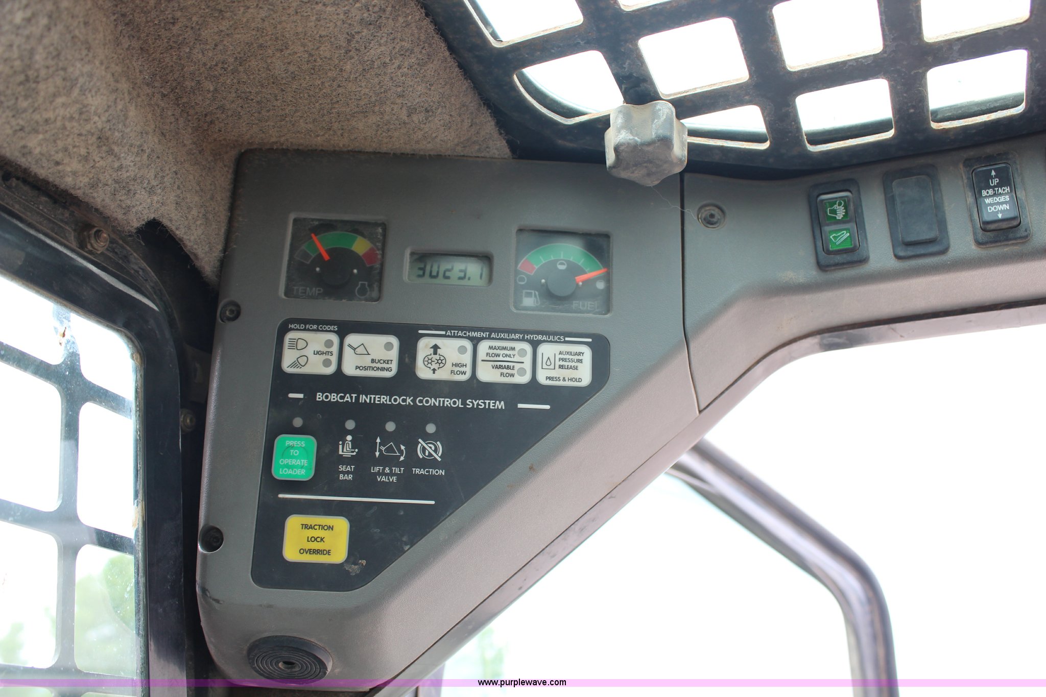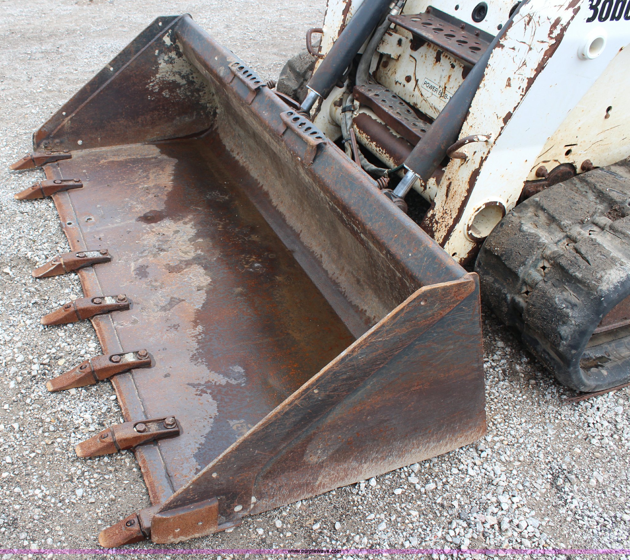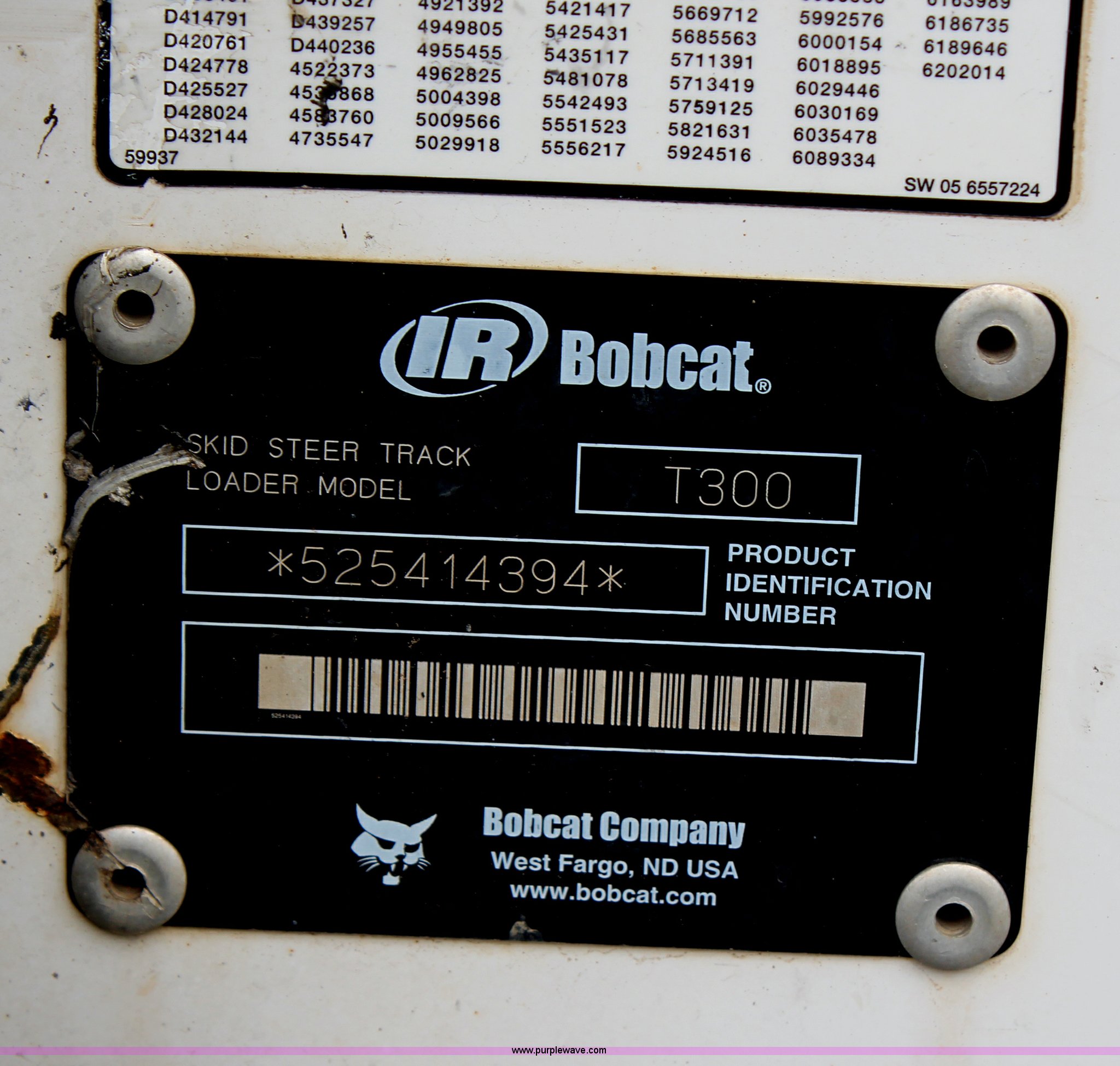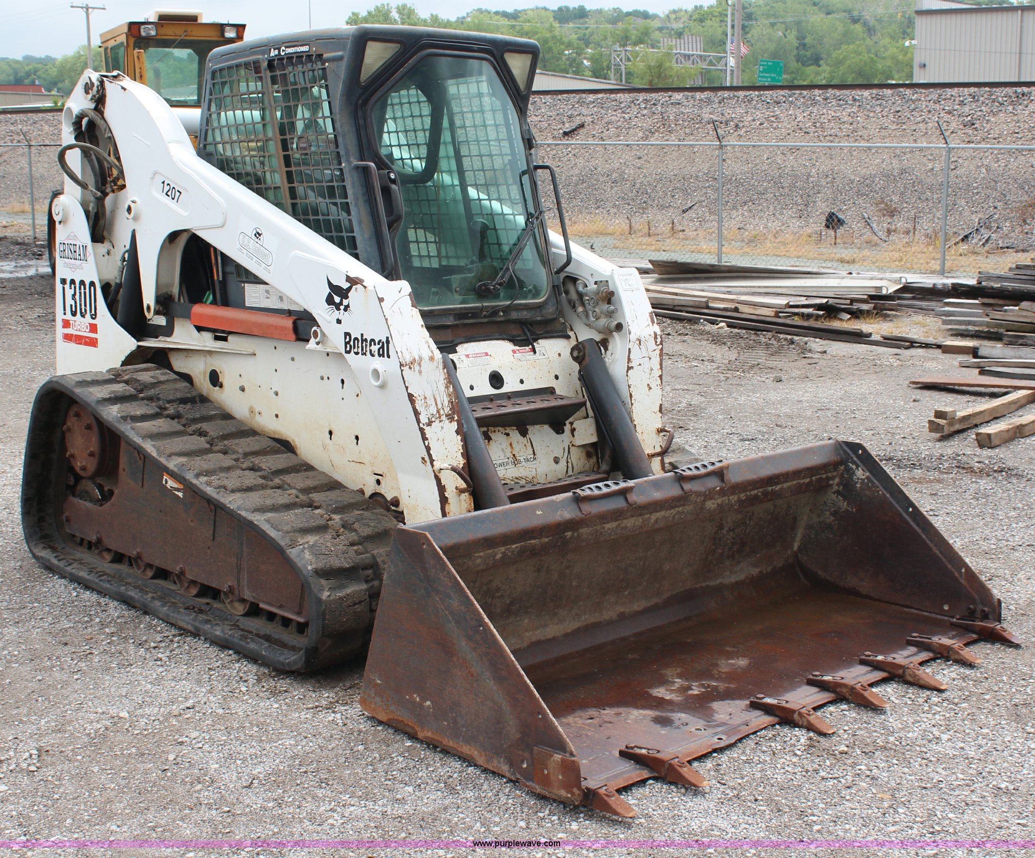 Purple Wave is selling a used Tracked Skid Steer Loader in Kansas. This item is a 2005 Bobcat T300 track skid steer with the following: 3,023 hours on meter, Kubota four cylinder turbo diesel engine, Foot and hand controls, AC and heat, AM/FM, 80" toothed bucket, Auxiliary hydraulics, 18" tracks, 9,702 lbs. base operating weight, Engine door is bent, Left track idler bearing needs replaced, Serial 525414394
