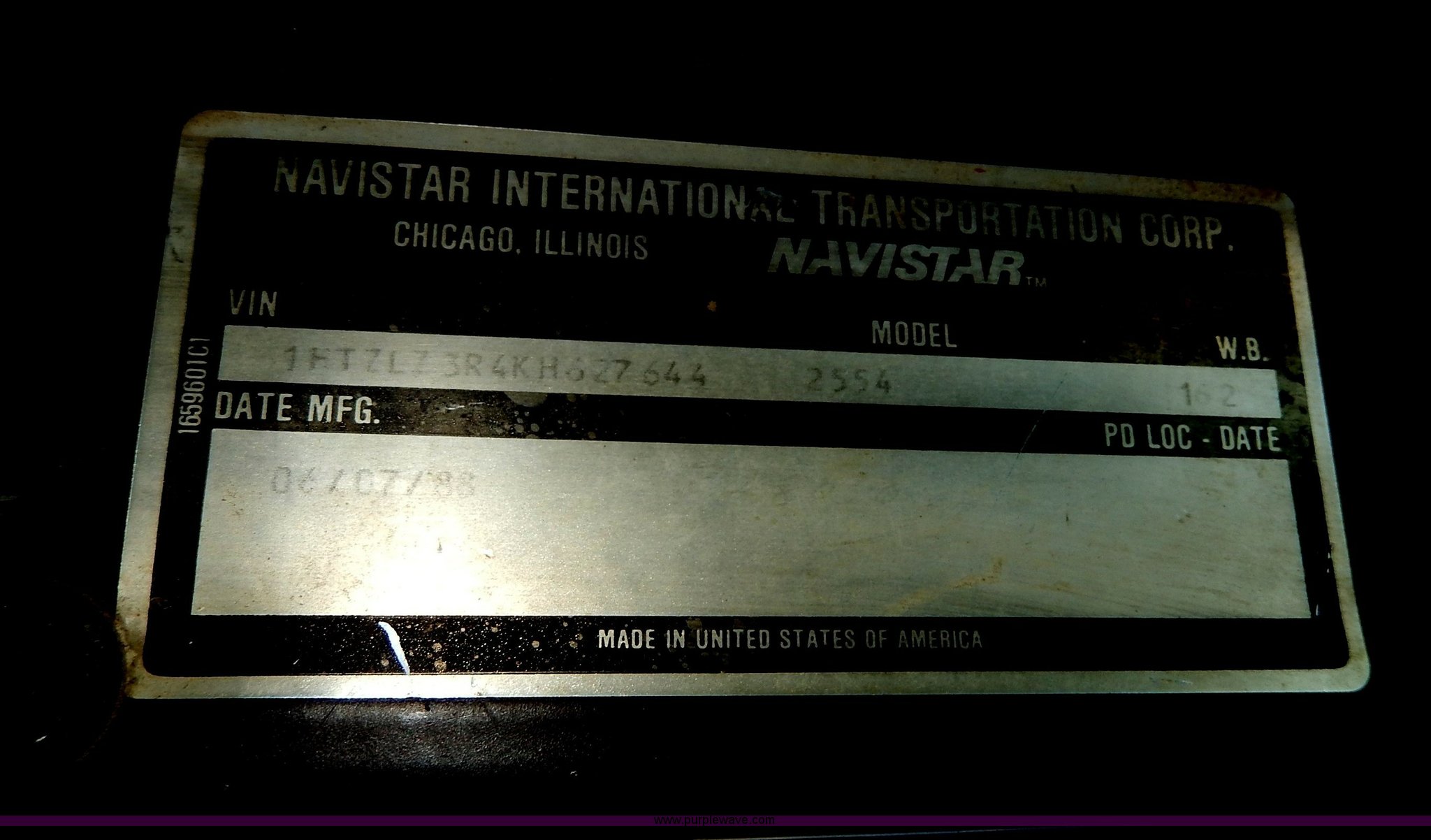1989 International S2500 dump truck. 93,464 miles on odometer, International DT466 7.6L L6 diesel engine, Automatic transmission, Heat, AM/FM, Air horn, 10' x 8' bed Manual end gate, Rollover tarp Damaged, Block heater, Plow and spreader controls, Trailer wiring, Pintle hitch, Rear hydraulic hookups, 50 gallon fuel tank, Front mount PTO, Spring suspension, Air brakes, 11.00-20 tires, GVWR 30,000 lbs, Body rust. 1HTZLZ3R4KH627644. Olathe, KS 66061
