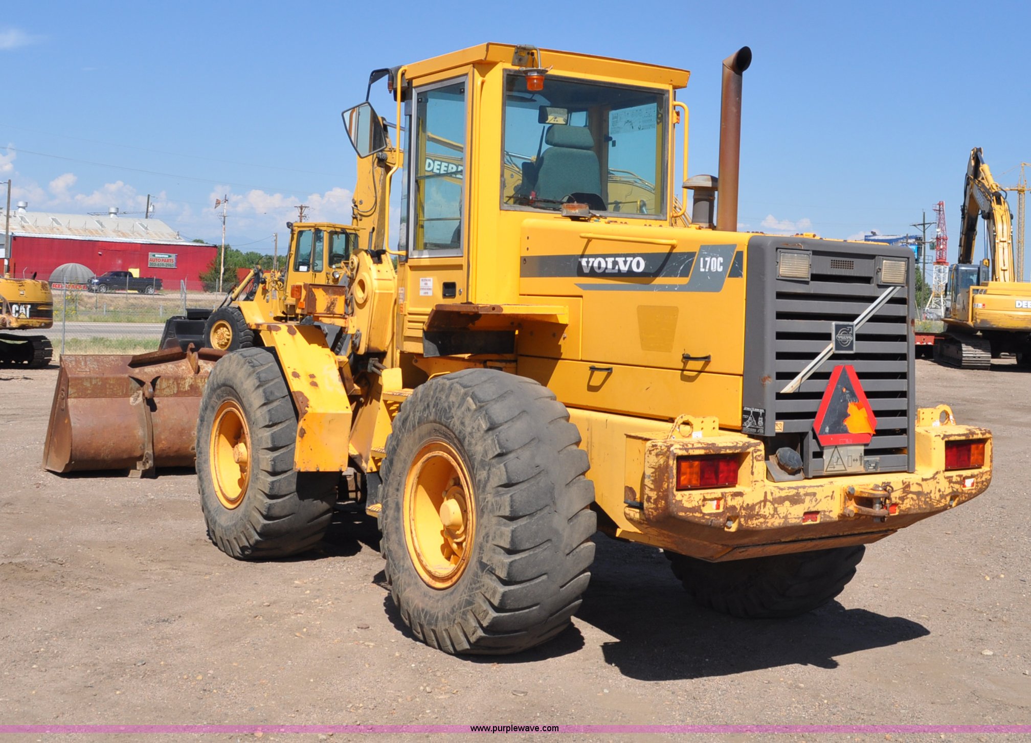 Purple Wave is selling a used Wheel Loader in Colorado. This item is a 1997 Volvo L70C wheel loader with the following: 18,316 hours on meter, Volvo TD63KDE six cylinder turbo diesel engine, Serial 134678, Four speed powershift transmission, AC and heat, Suspension seat, 8' pin-on bucket, Bolt-on cutting edge, 4' x 5" pallet forks, 5'W spread, Hydraulic quick coupler, Counter weights, 20.5x25L tires, 23,990 lbs. base operating weight, Serial 470CV14178