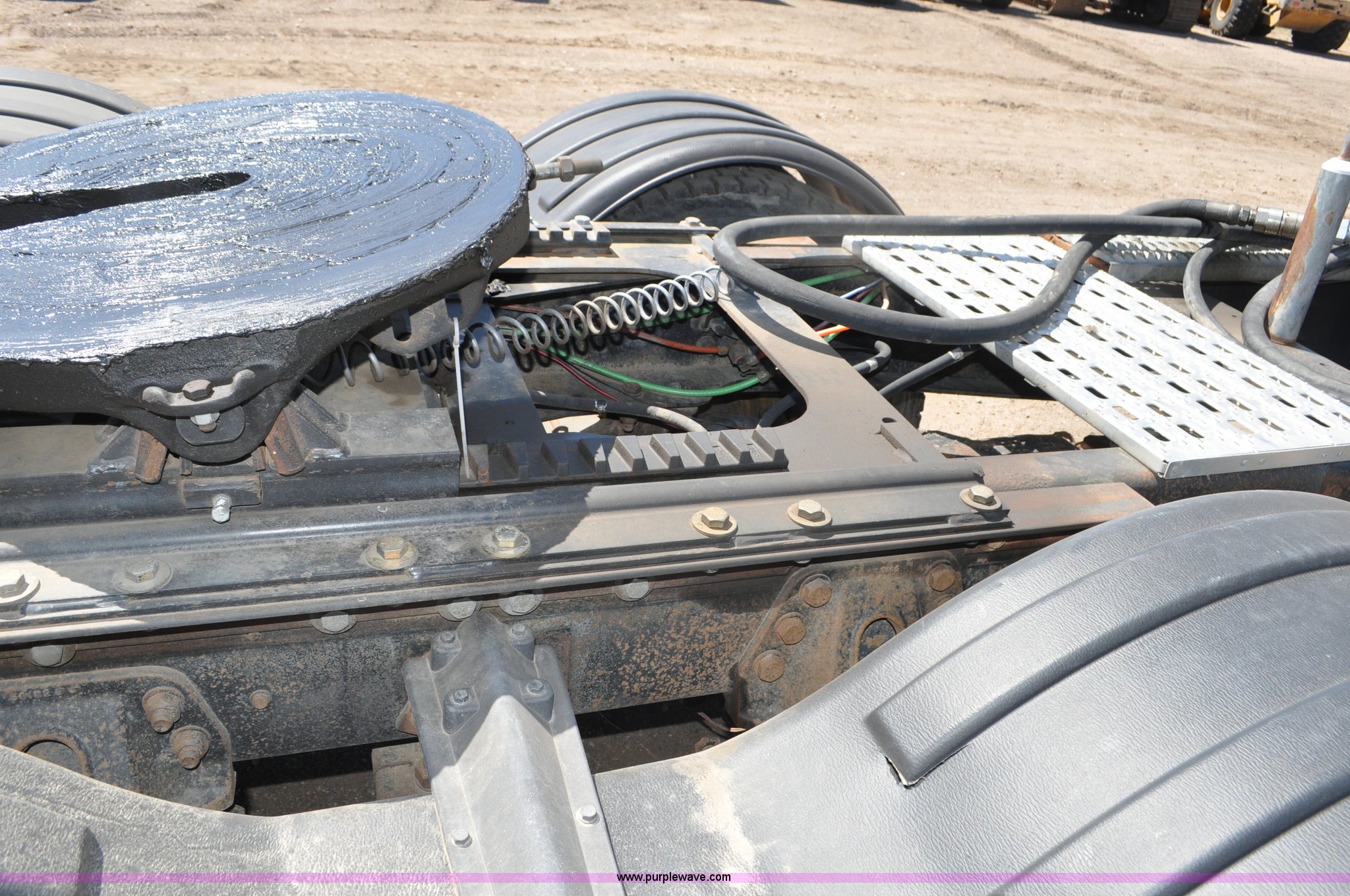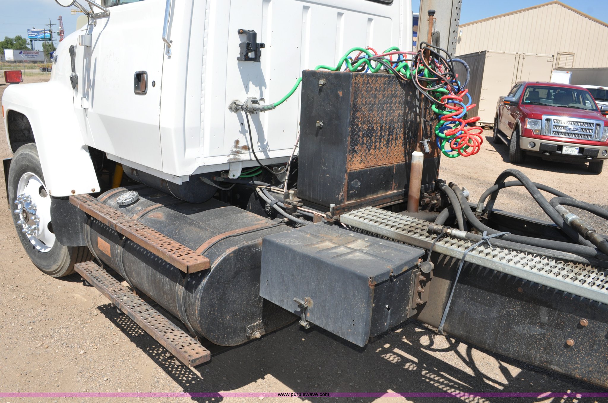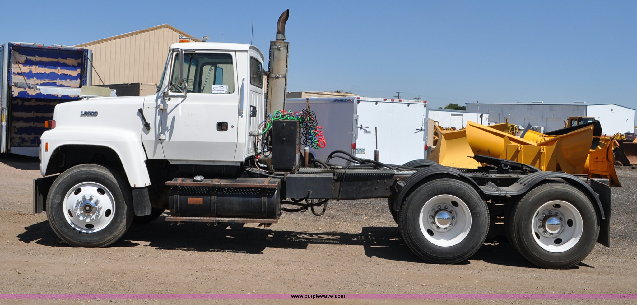 Purple Wave is selling a used Truck Tractor in Colorado. This item is a 1997 Ford LT9000 semi truck with the following: 462,607 miles on odometer, Caterpillar 3406 14.6L L6 diesel engine, Eaton Fuller eight speed manual transmission, Twin screw, AC and heat, AM/FM, Air suspension seat, Heated mirrors, Chrome bumper, Block heater, Air slide fifth wheel, Single rear exhaust stack, Aluminum deck plate, Plastic full fenders, PTO, Dual line wet kit, Spring suspension, Air brakes, Nut wheel covers, 204" wheelbase, 11R24.5 tires, GVWR 60,000 lbs, Former Weld County truck