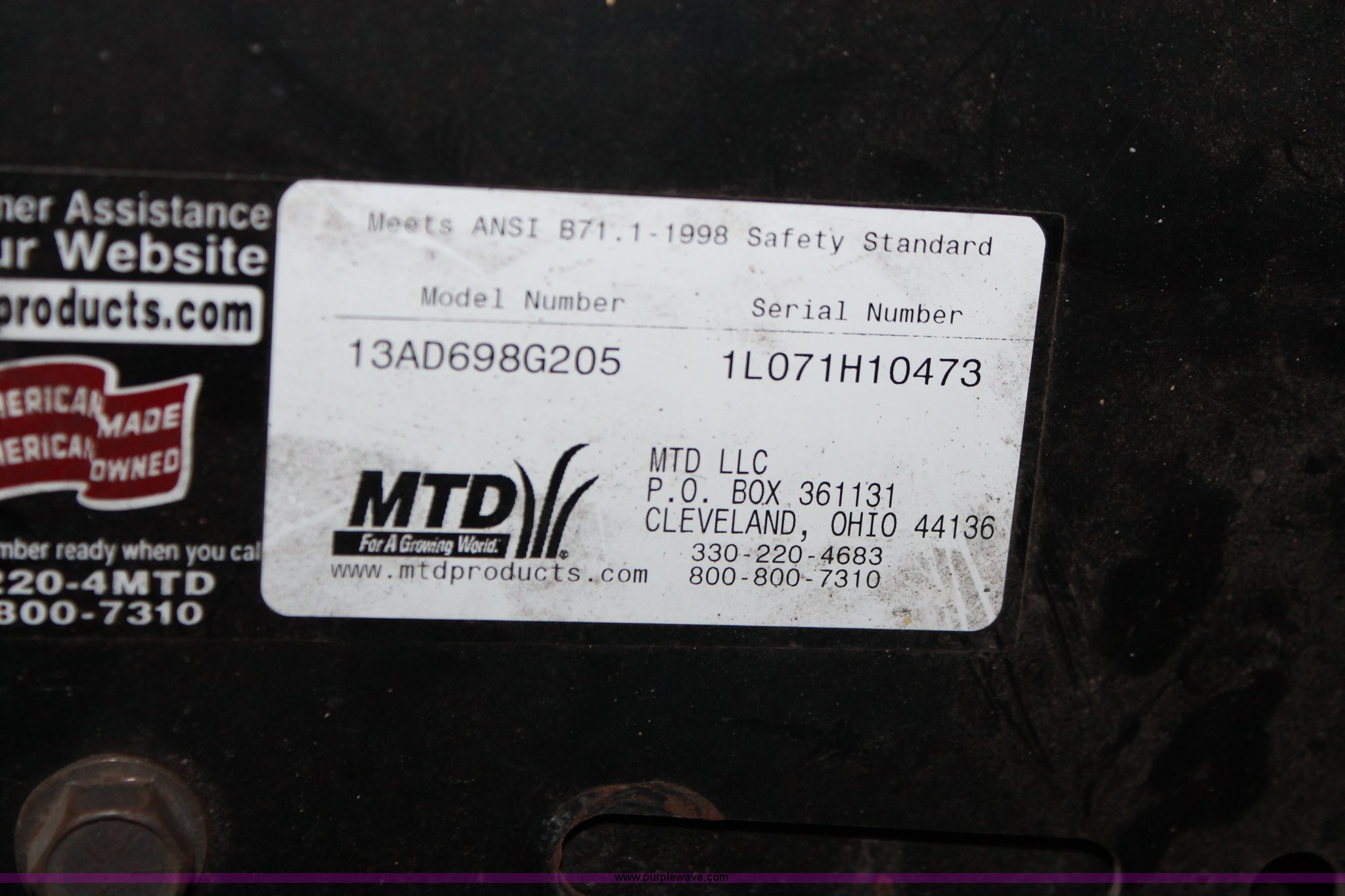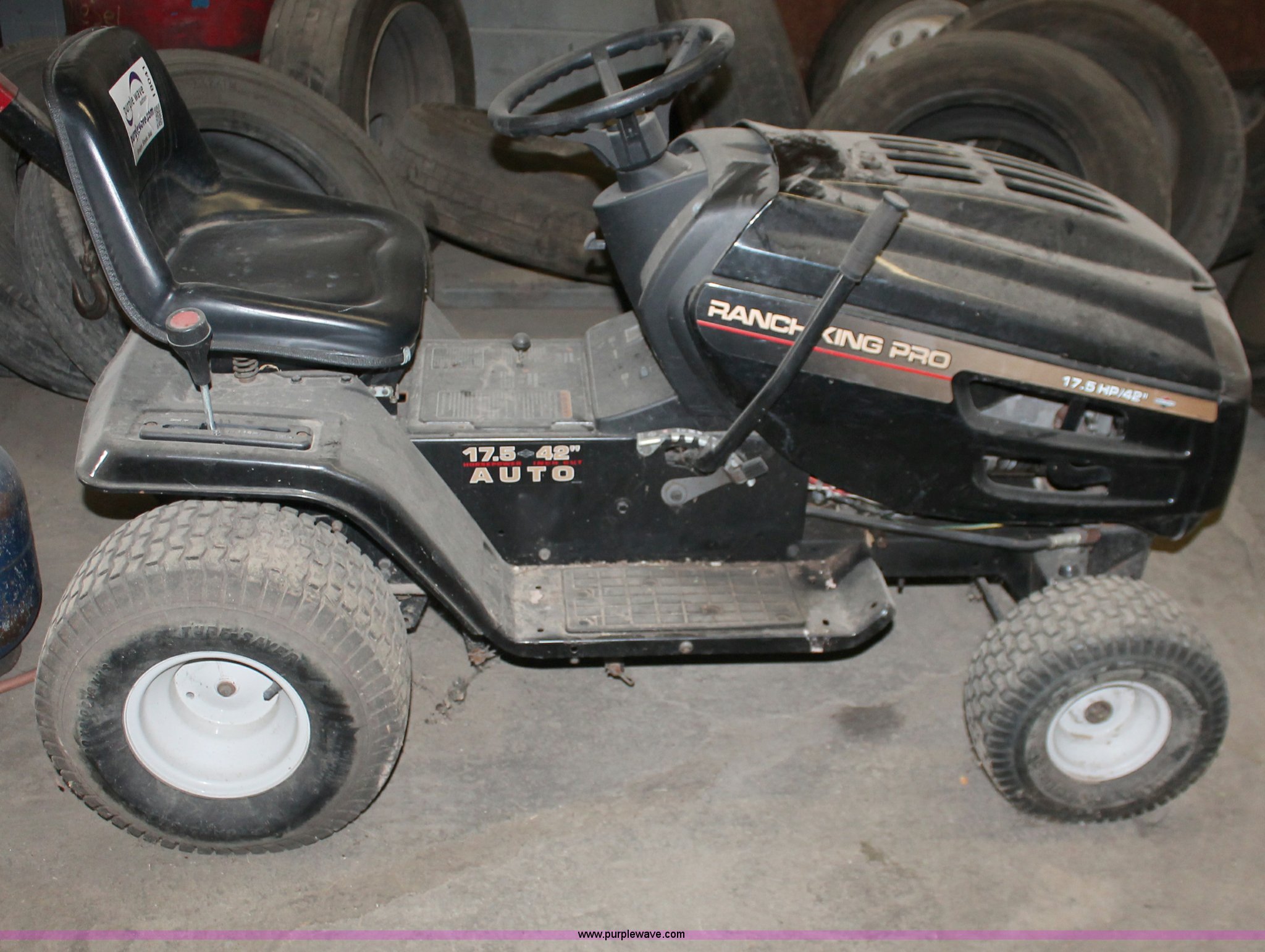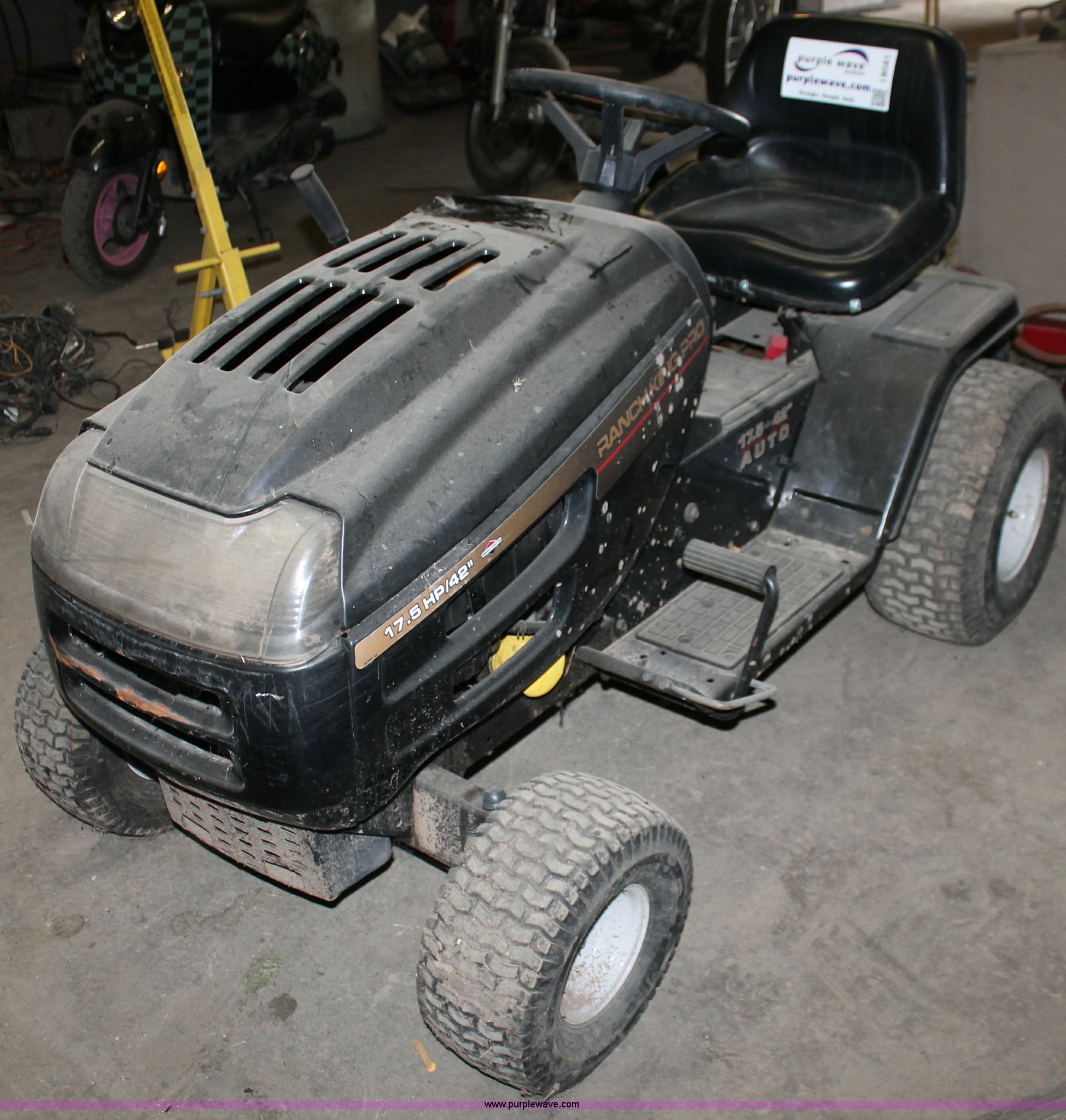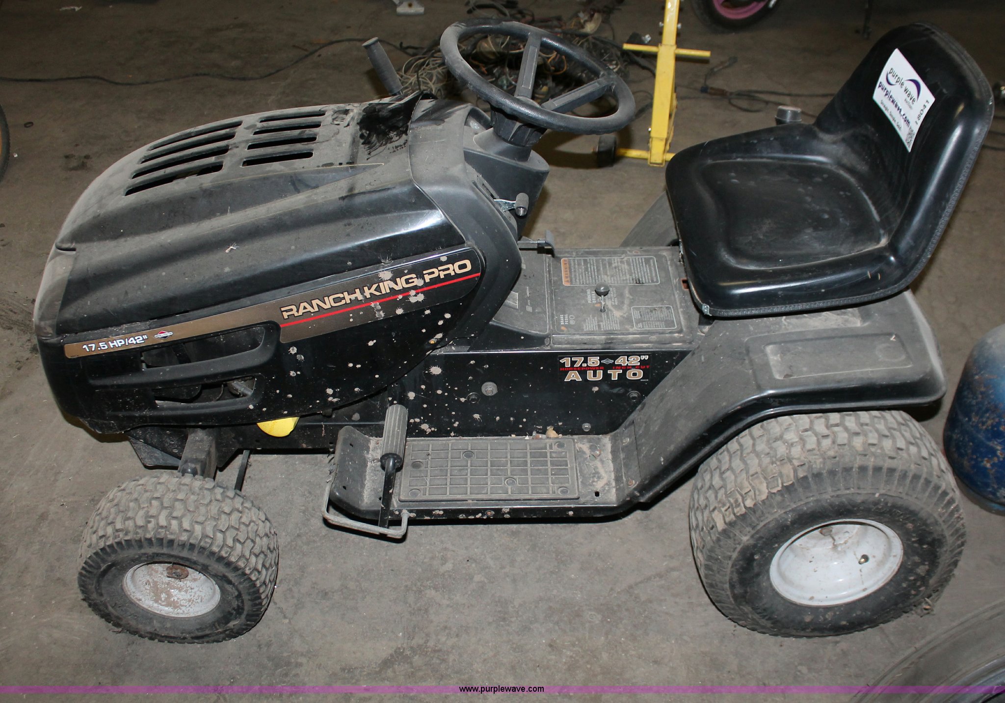 Purple Wave is selling a used Lawn and Garden in Kansas. This item is a MTD Ranchking Pro lawn mower with the following: Model 13AD698G205, 42" cut, Briggs & Stratton 17.5 HP gas engine, Hydrostatic transmission, Pin hitch, 15x6.00-6 front tires, 20x8.00-8 rear tires, Deck and belt detached, No keys, Unknown operating condition, Serial 1L071H10473, Case# 13C465968