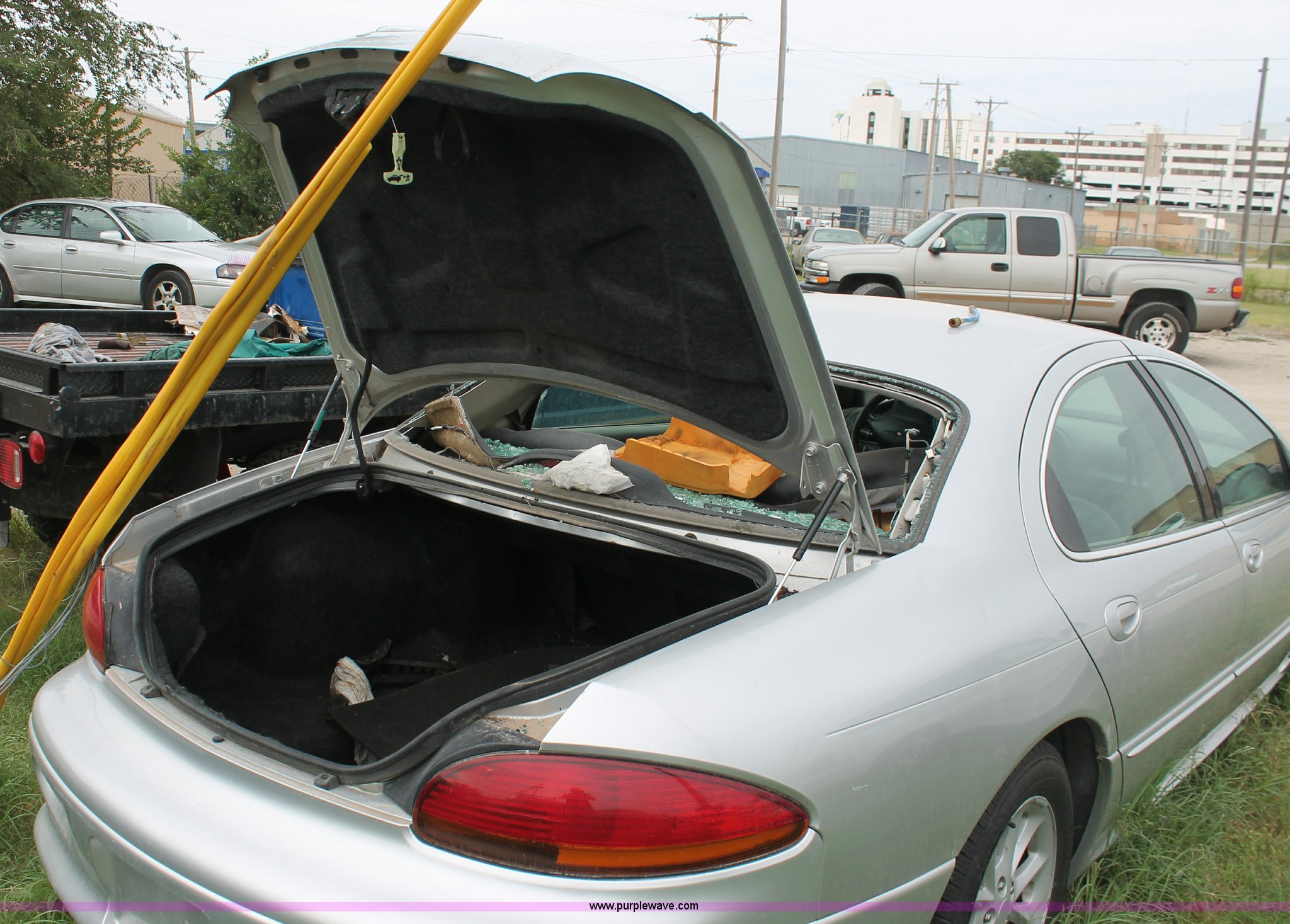 2001 Chrysler LHS. Unknown miles on odometer, 3.5L V6 SOHC 24V gas engine, Automatic transmission, AC and heat, Tilt, Cruise, AM/FM/CD/cassette, Power windows, locks, mirrors, and seats, Leather interior, Sunroof, Keys, P215/60R17 tires, Interior/exterior cosmetic damage, Broken rear glass, Trunk open, Hail damage, Exterior scratches, Dead battery, Case# 13C37639. Vehicle is abandoned. No additional information is available. Vehicle does not have keys unless notated otherwise in the item listing.. View City Of Wichita Terms for title acquisition and item removal requirements.. 2C3HC56G61H584708. Interstate Wrecker Service. 1028 N. Mosley. Wichita, KS 67214