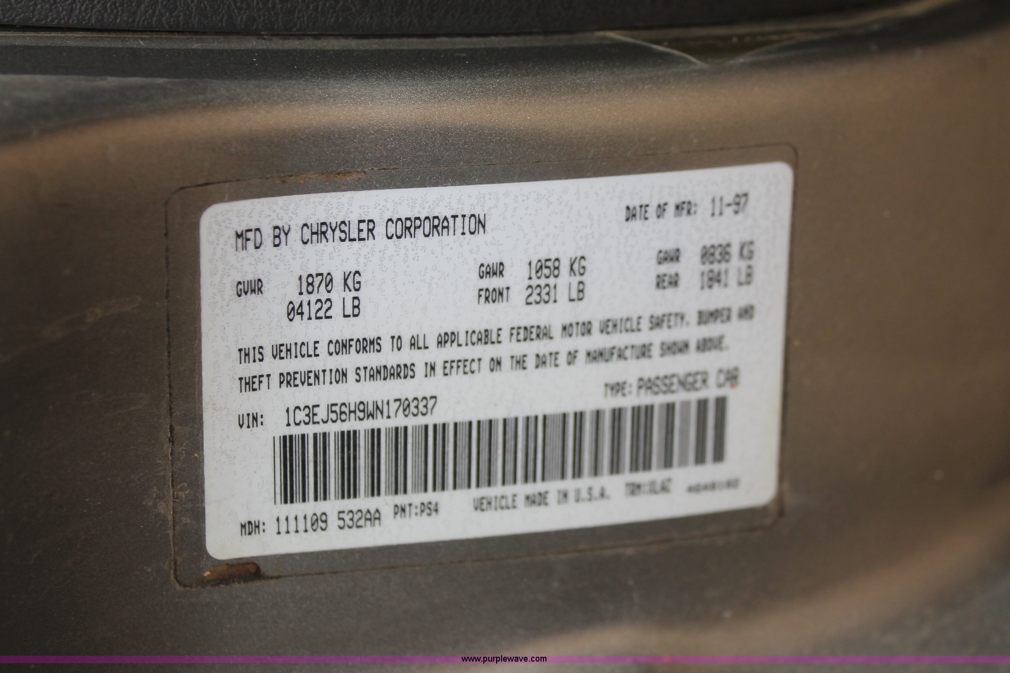 1998 Chrysler Cirrus LXi. Unknown miles on odometer, 2.5L V6 SOHC 24V gas engine, Automatic transmission, AC and heat, Tilt, Cruise, AM/FM/cassette, Power windows, locks, mirrors, and seats, Leather interior, P205/65R15 tires, Paint peeling, Hood dent, Passenger side damage, Passenger side mirror broken, Flat tire, Case# 13C48411. Vehicle is abandoned. No additional information is available. Vehicle does not have keys unless notated otherwise in the item listing.. View City Of Wichita Terms for title acquisition and item removal requirements.. 1C3EJ56H9WN170337. Arrow Wrecker Service. 531 E MacArthur. Wichita, KS 67216