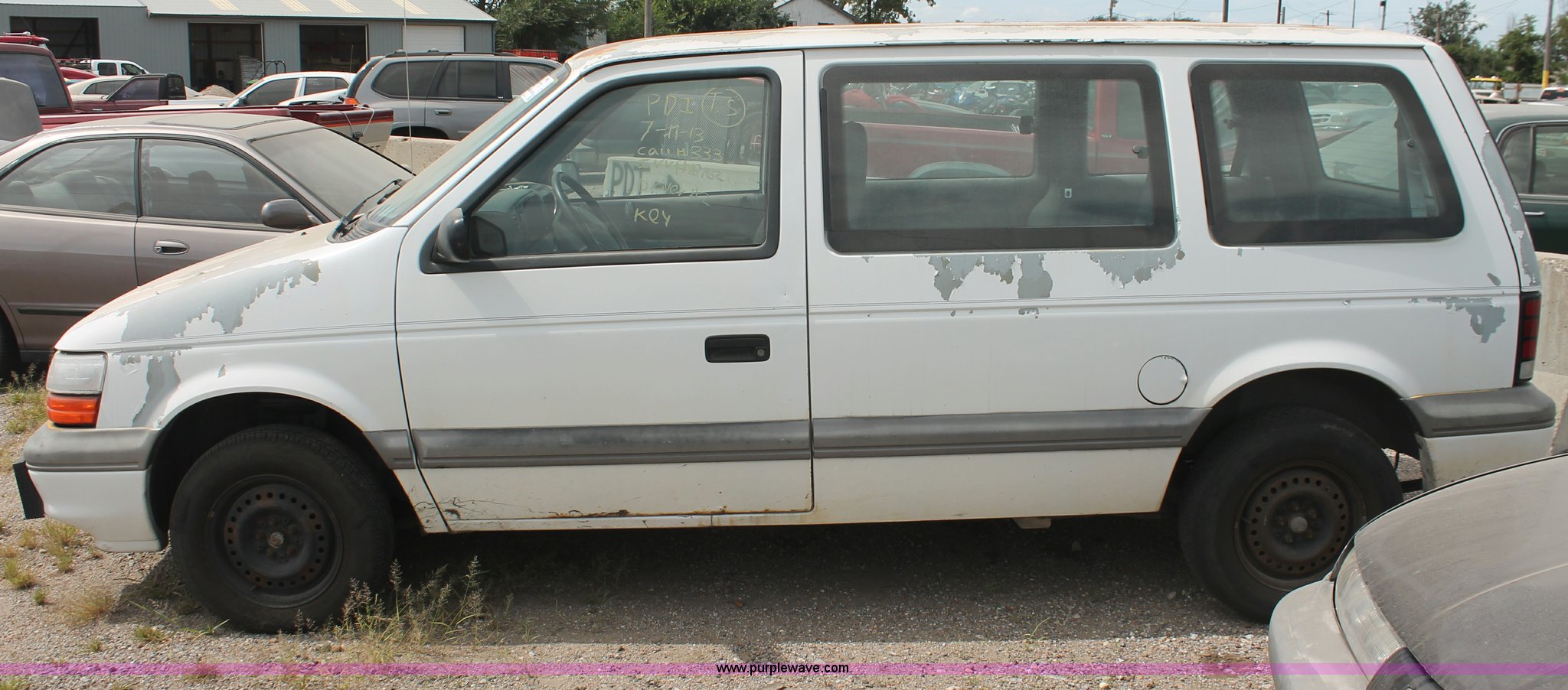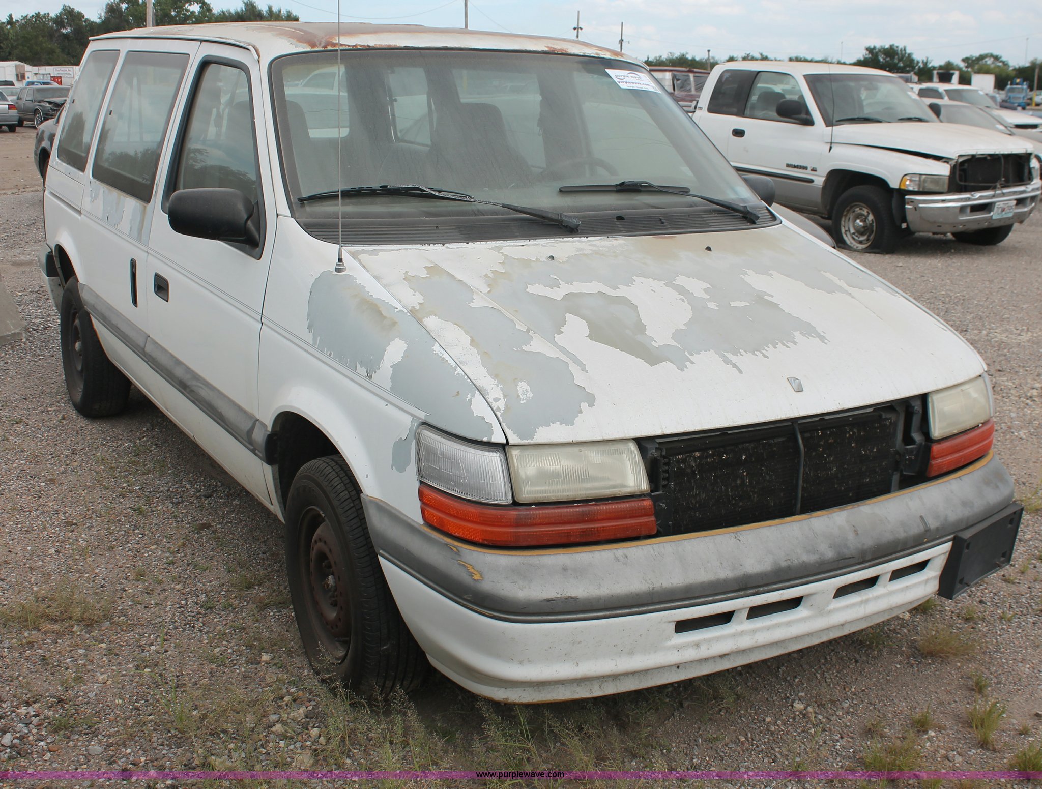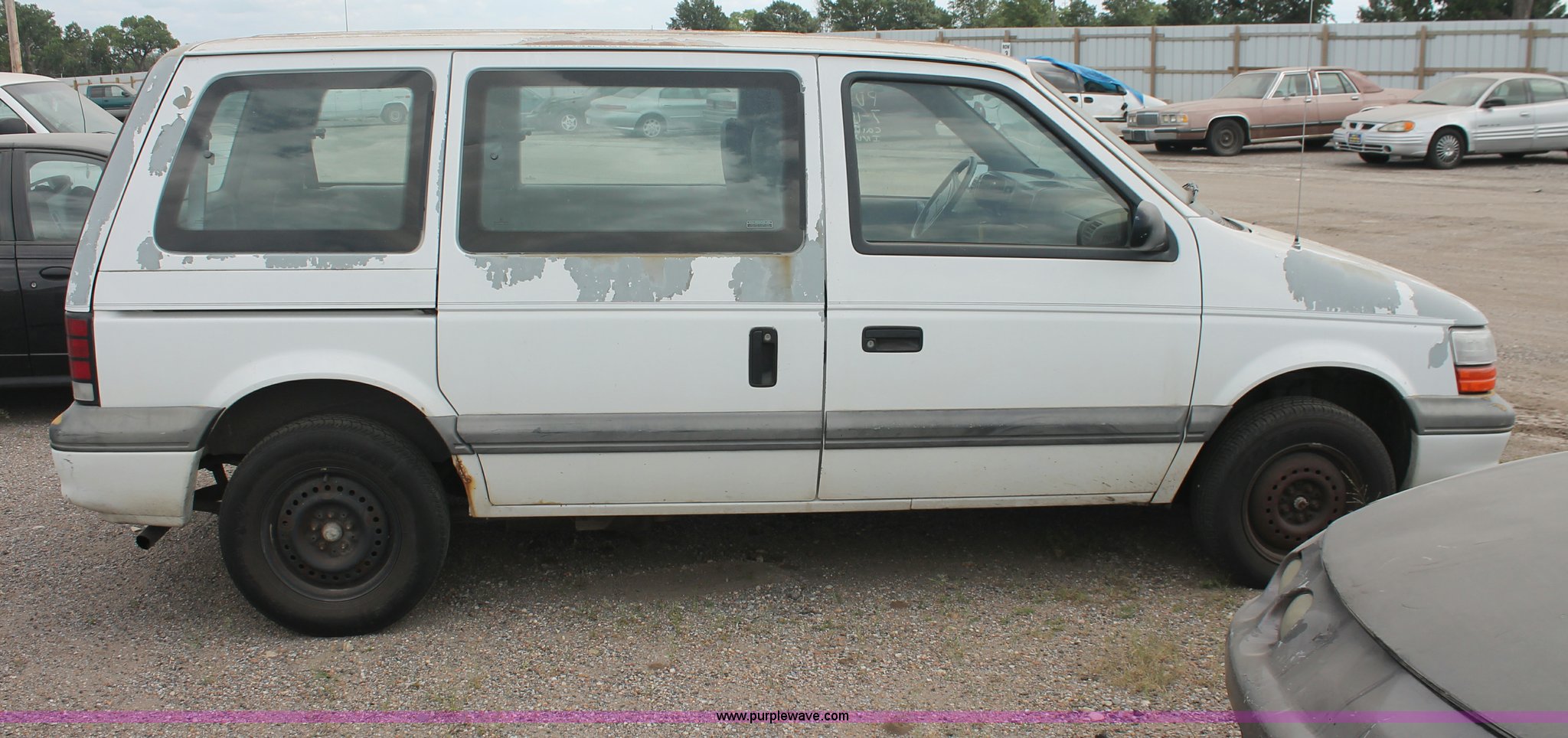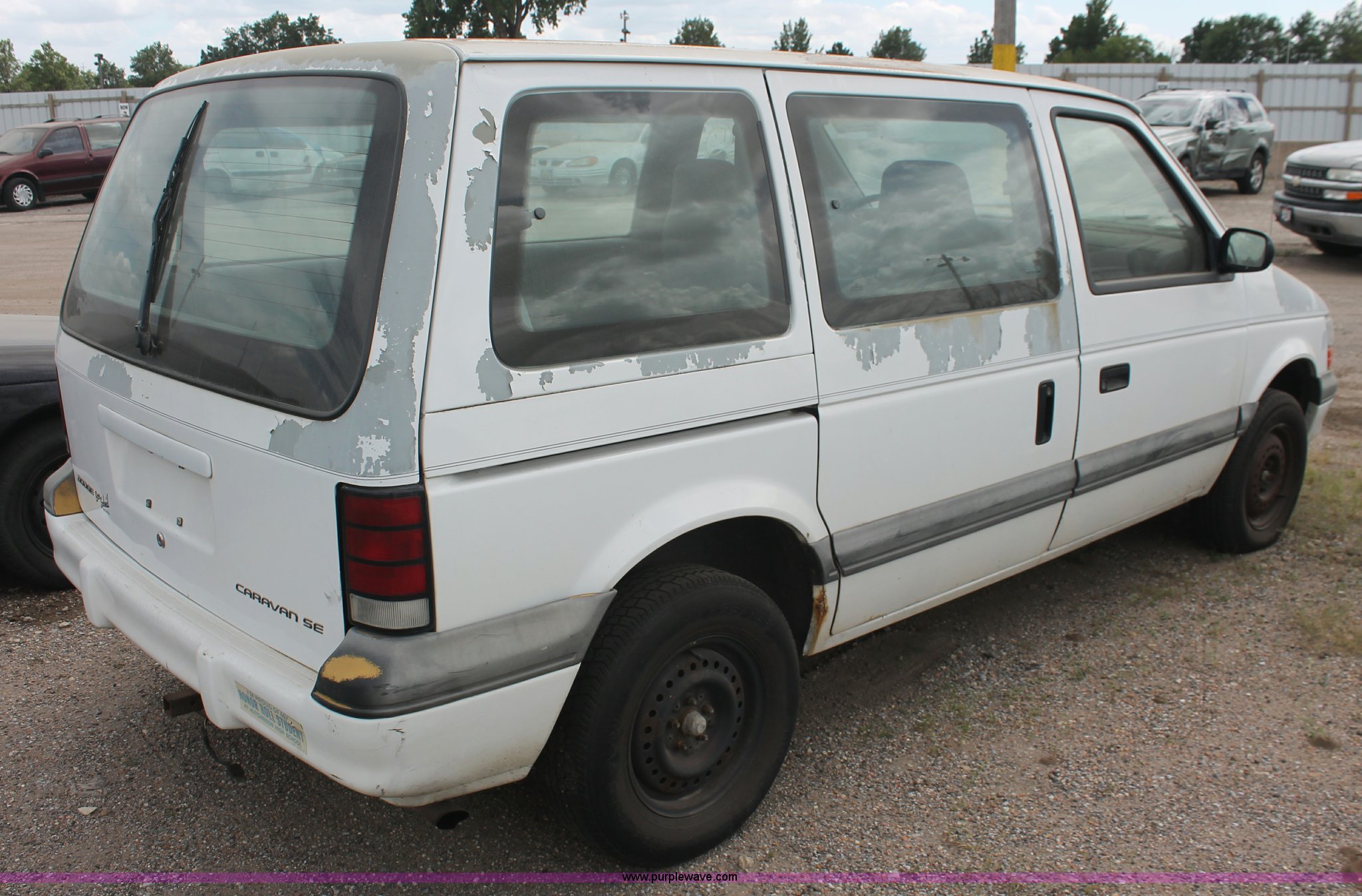 Purple Wave is selling a used Wrecked and Abandoned in Kansas. This item is a 1994 Dodge Caravan SE van with the following: 238,028 miles on odometer, 3.3L V6 OHV 12V gas engine, Automatic transmission, AC and heat, Tilt, Cruise, AM/FM/cassette, Power windows, locks, and mirrors, Cloth interior, Receiver hitch, Keys, Starts and idles, 185/70R14 tires, Paint peeling, Interior cosmetic damage, Windshield cracked, Rust, Case# 13C44827