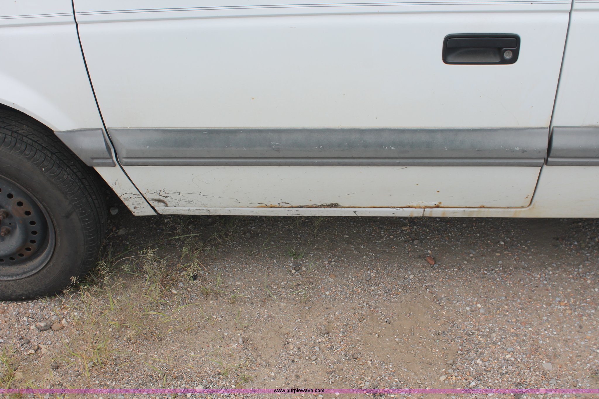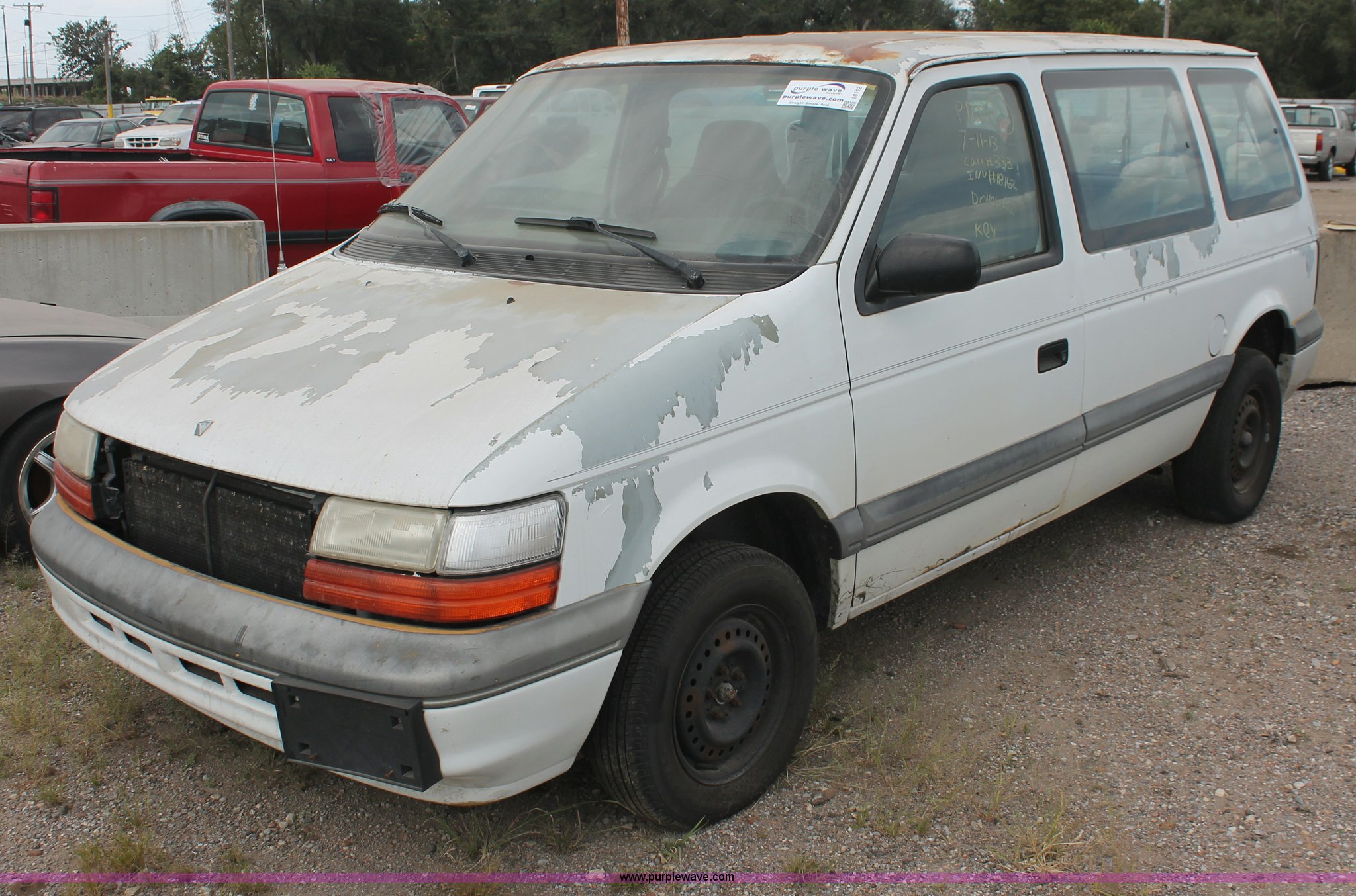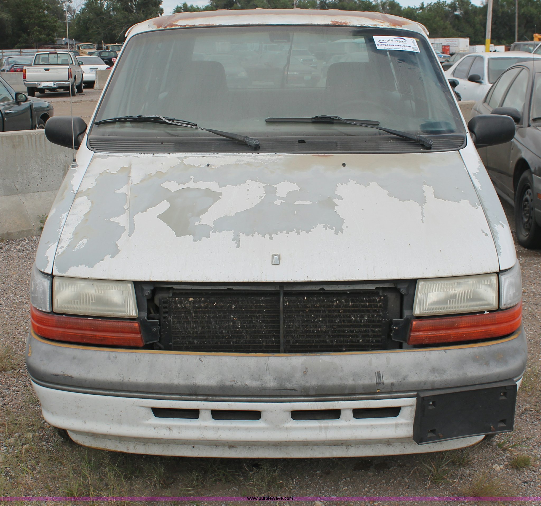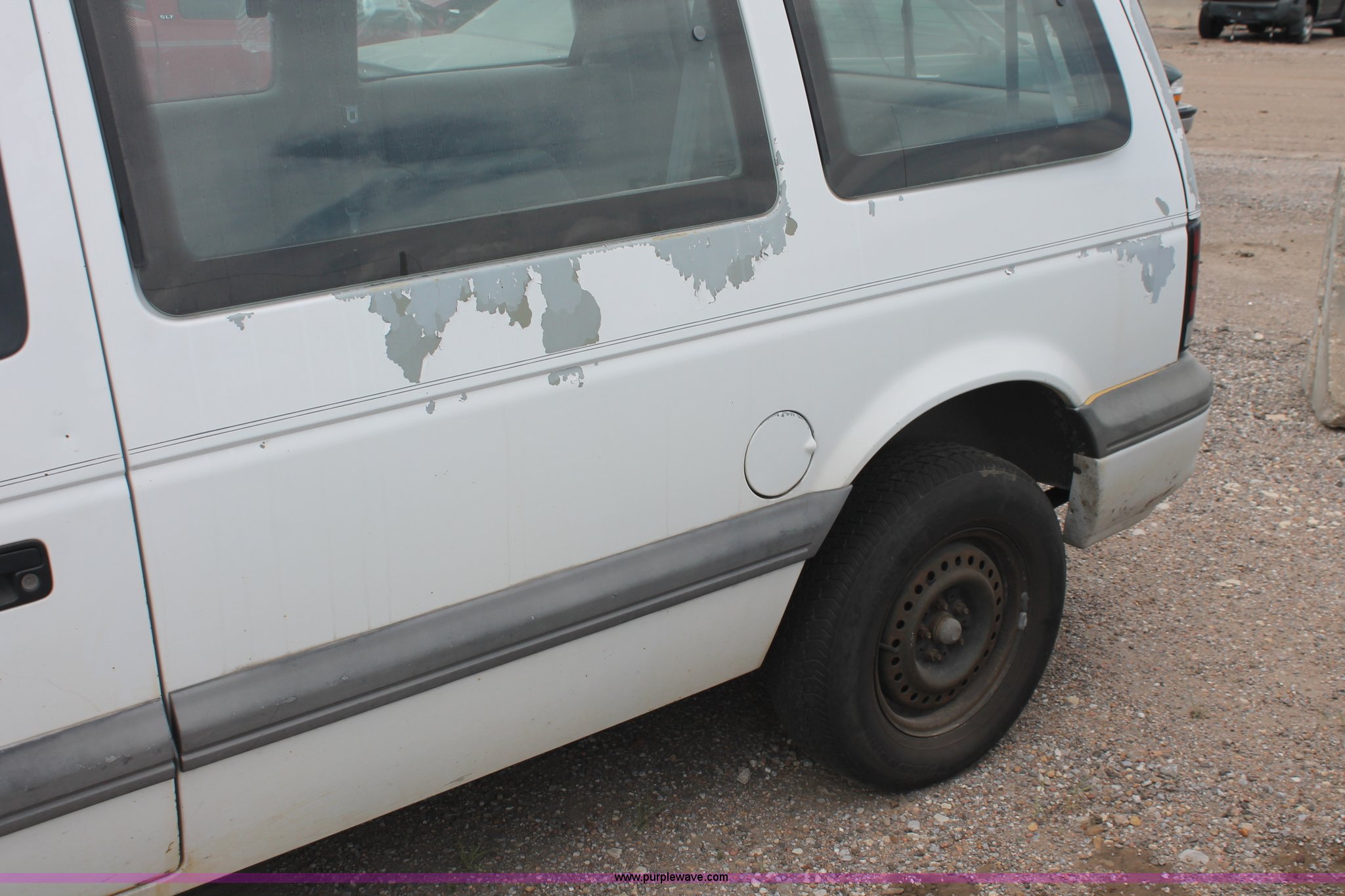 Purple Wave is selling a used Wrecked and Abandoned in Kansas. This item is a 1994 Dodge Caravan SE van with the following: 238,028 miles on odometer, 3.3L V6 OHV 12V gas engine, Automatic transmission, AC and heat, Tilt, Cruise, AM/FM/cassette, Power windows, locks, and mirrors, Cloth interior, Receiver hitch, Keys, Starts and idles, 185/70R14 tires, Paint peeling, Interior cosmetic damage, Windshield cracked, Rust, Case# 13C44827