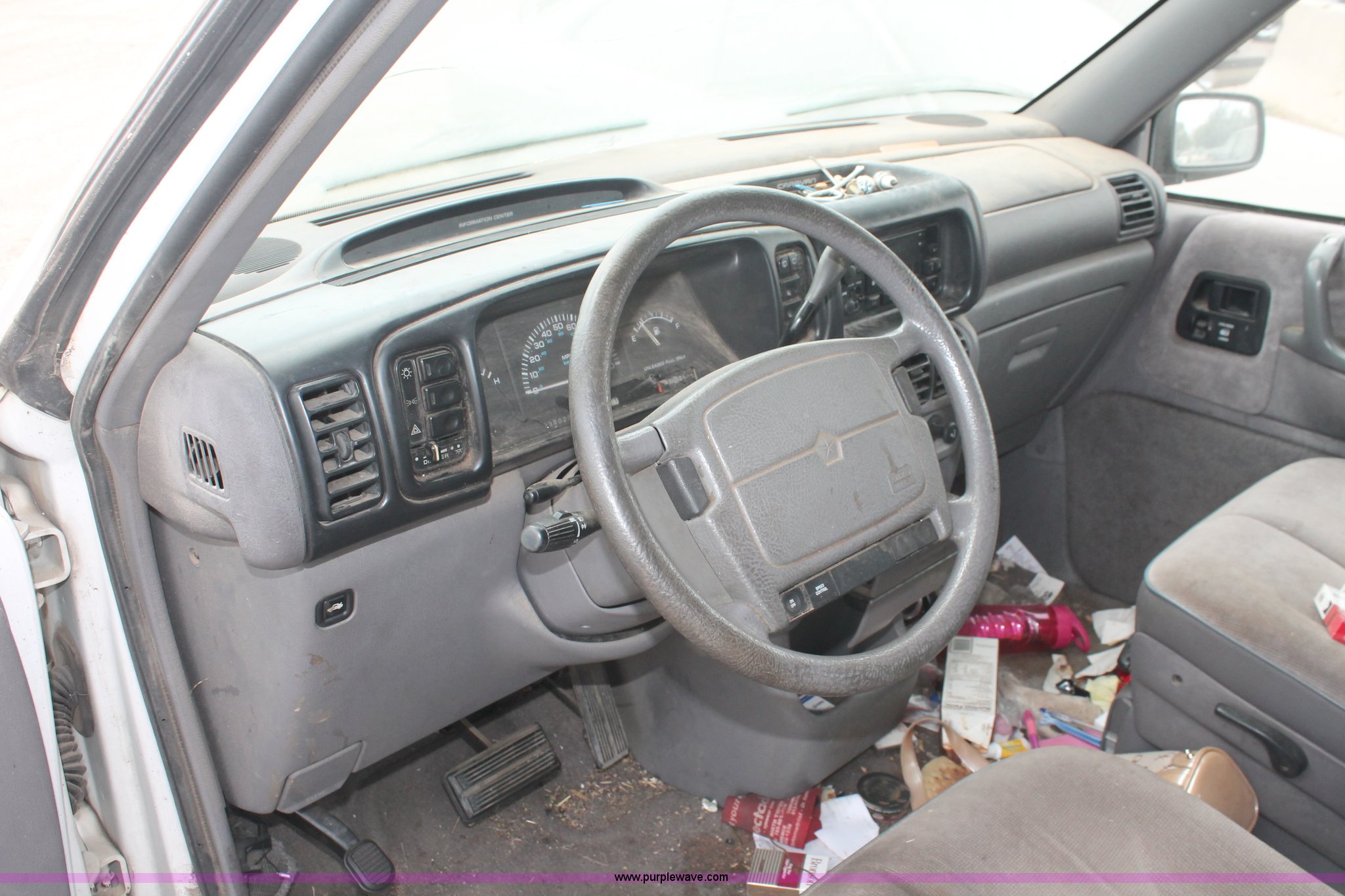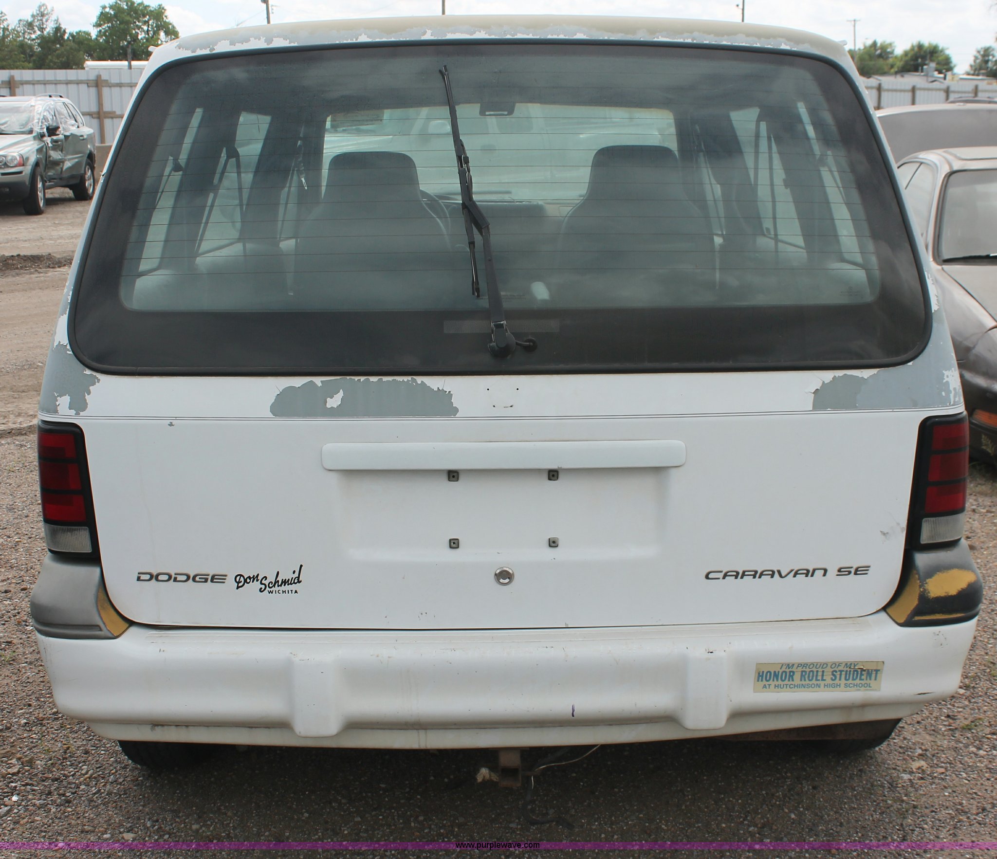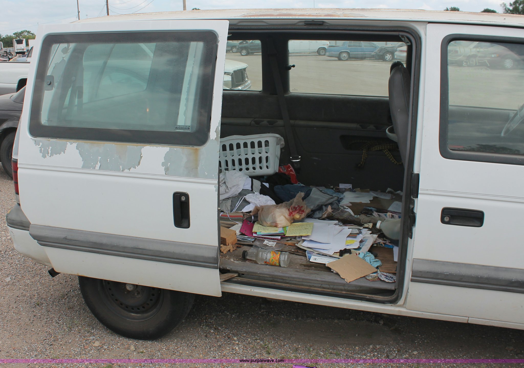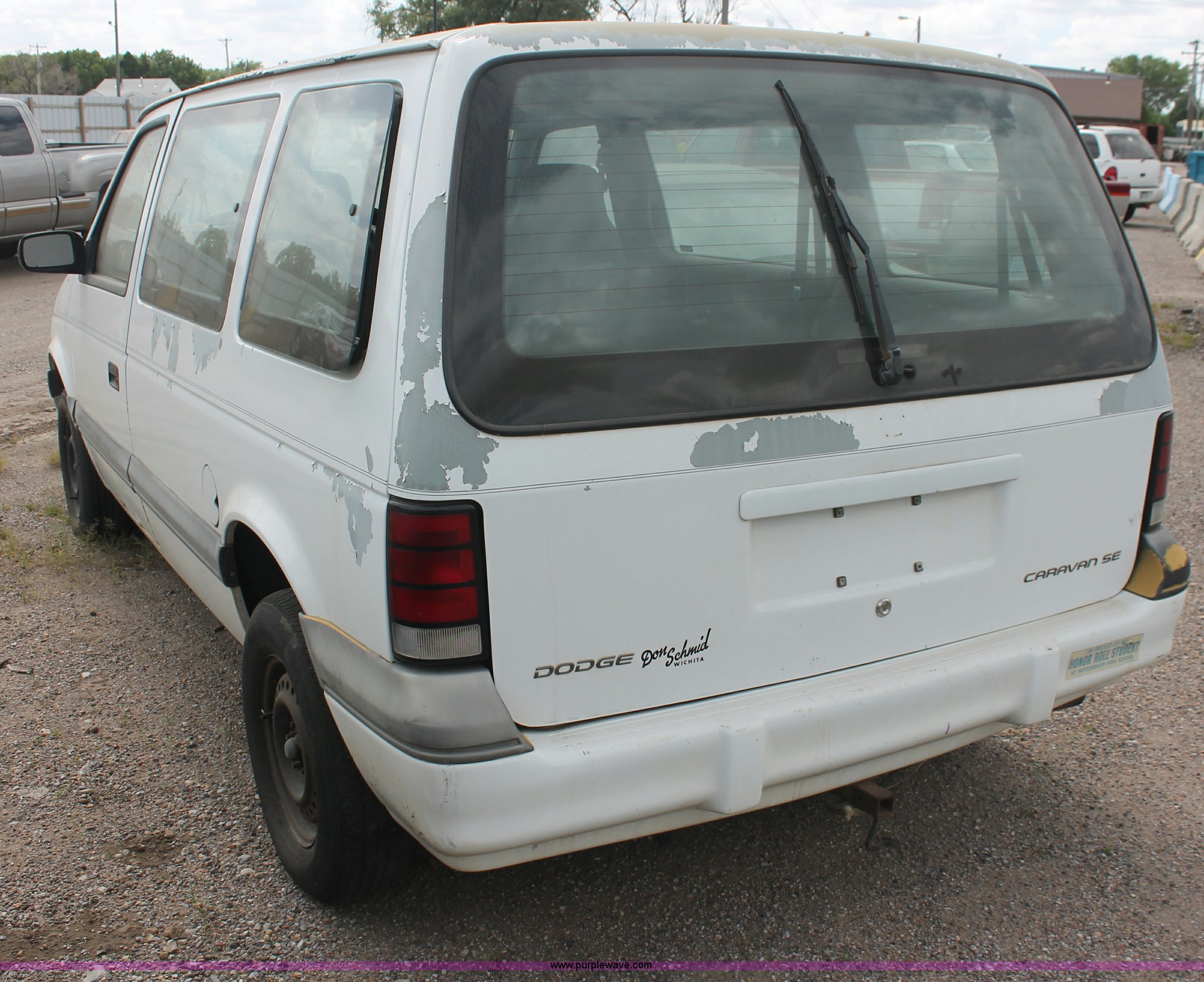 Purple Wave is selling a used Wrecked and Abandoned in Kansas. This item is a 1994 Dodge Caravan SE van with the following: 238,028 miles on odometer, 3.3L V6 OHV 12V gas engine, Automatic transmission, AC and heat, Tilt, Cruise, AM/FM/cassette, Power windows, locks, and mirrors, Cloth interior, Receiver hitch, Keys, Starts and idles, 185/70R14 tires, Paint peeling, Interior cosmetic damage, Windshield cracked, Rust, Case# 13C44827