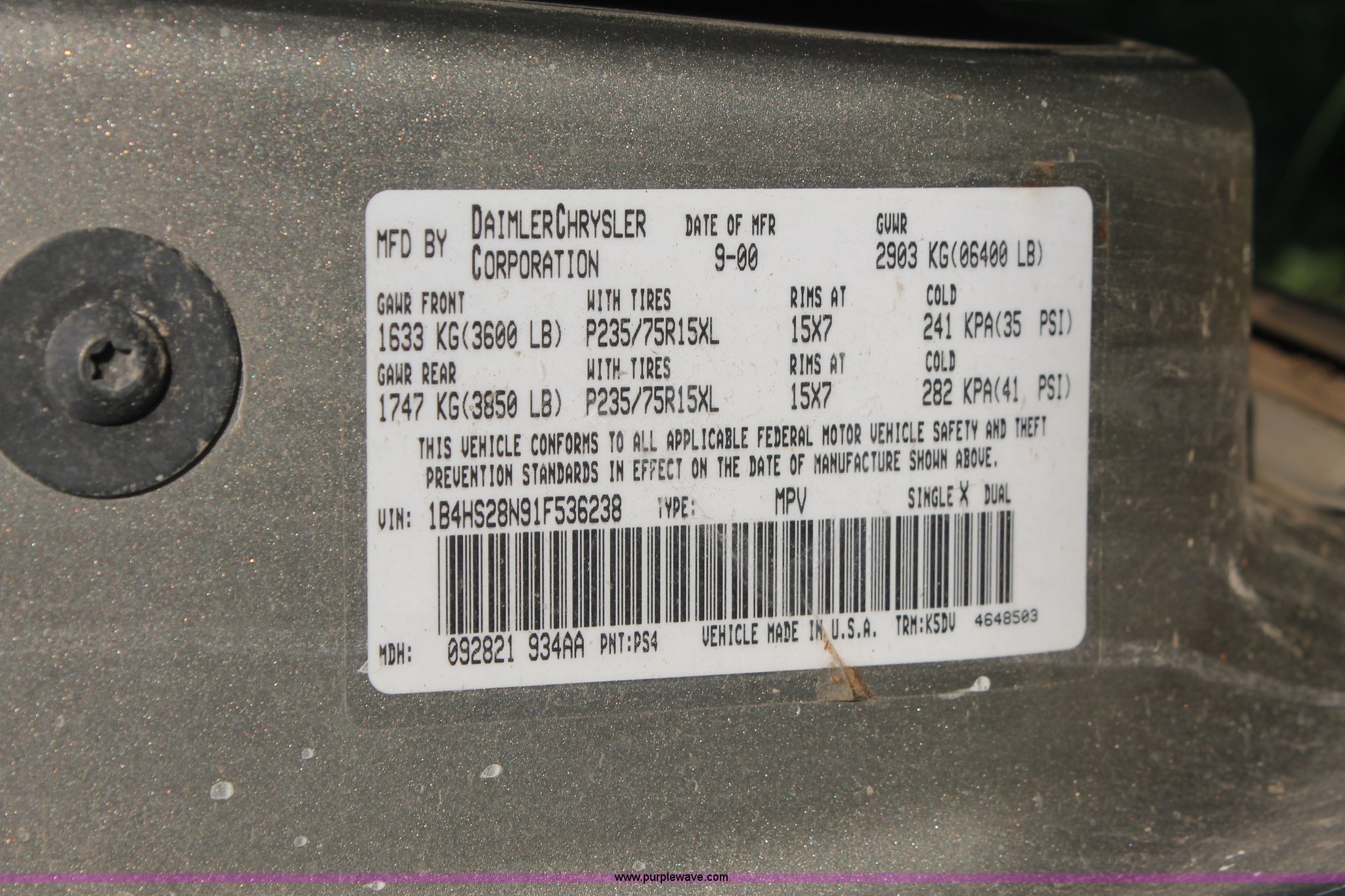 Purple Wave is selling a used Wrecked and Abandoned in Kansas. This item is a 2001 Dodge Durango SUV with the following: Unknown miles on odometer, 4.7L V8 SOHC 16V gas engine, Automatic transmission, Four wheel drive, AM/FM/CD/cassette, Power seats, 235/75R15 tires, Front bumper in cab, Missing driver's side mirror and exterior door handle, Paint abrasion, Case# 13C45770