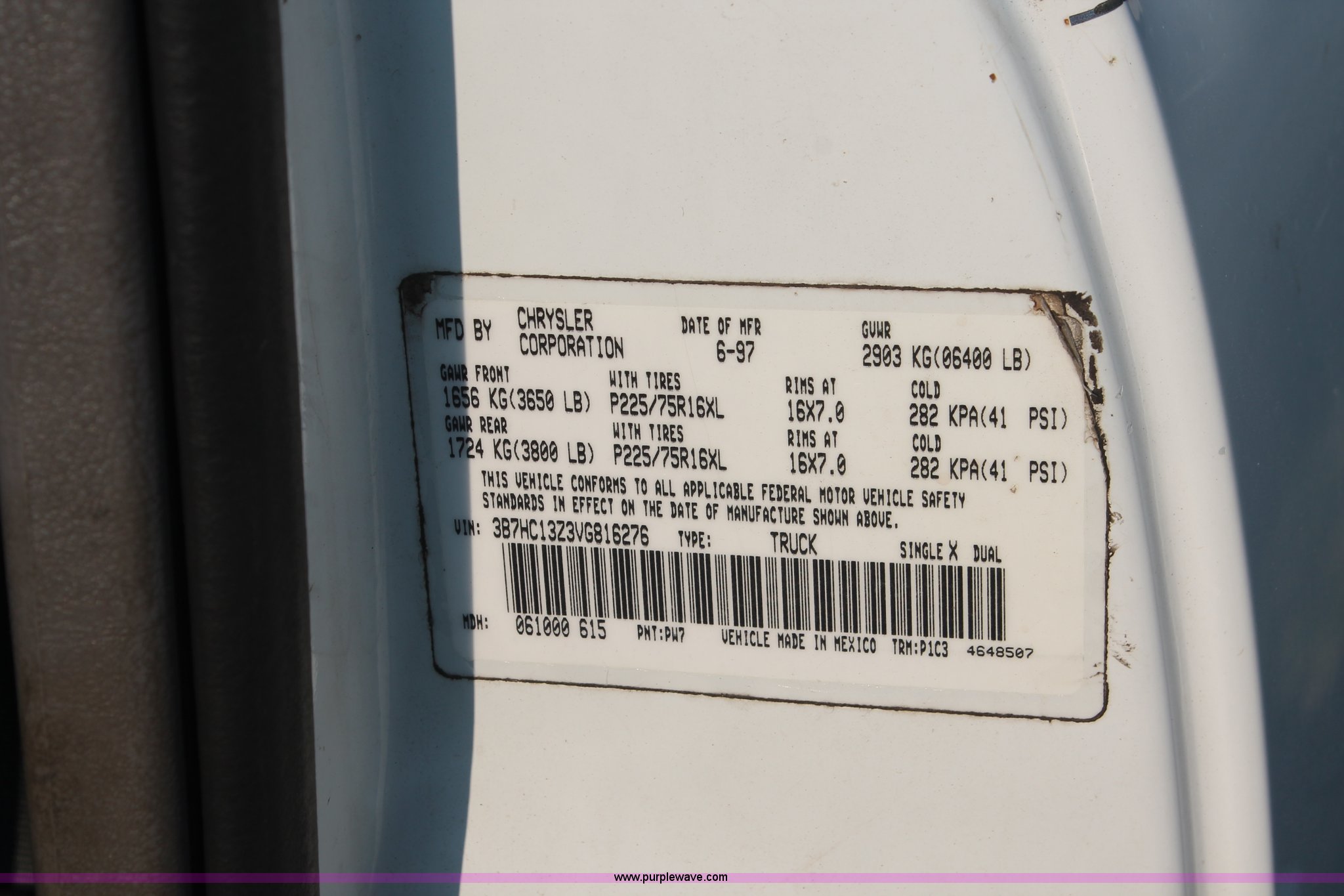 1997 Dodge Ram 1500 SLT Club Cab pickup truck. 228,805 miles on odometer, 5.9L V8 OHV 16V gas engine, Automatic transmission, 2" ball receiver hitch, P265/70R16 tires, Paint peeling, Case# 13C035982. Vehicle is abandoned. No additional information is available. Vehicle does not have keys unless notated otherwise in the item listing.. View City Of Wichita Terms for title acquisition and item removal requirements.. 3B7HC13Z3VG816276. Interstate Wrecker Service. 1028 N. Mosley. Wichita, KS 67214