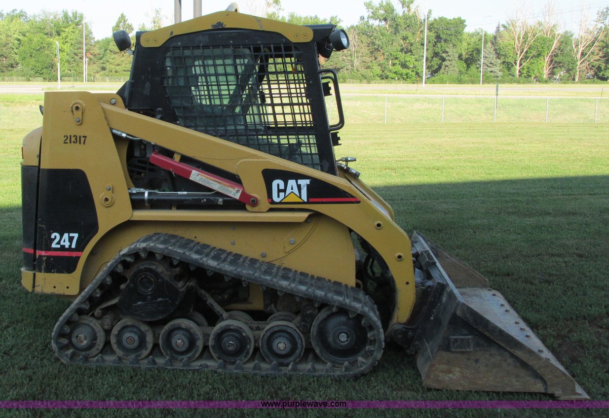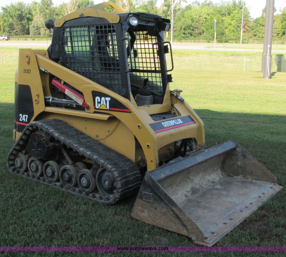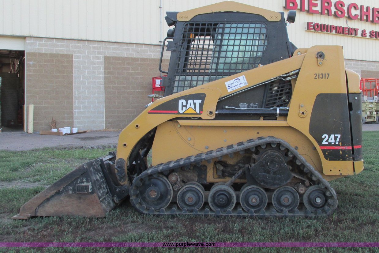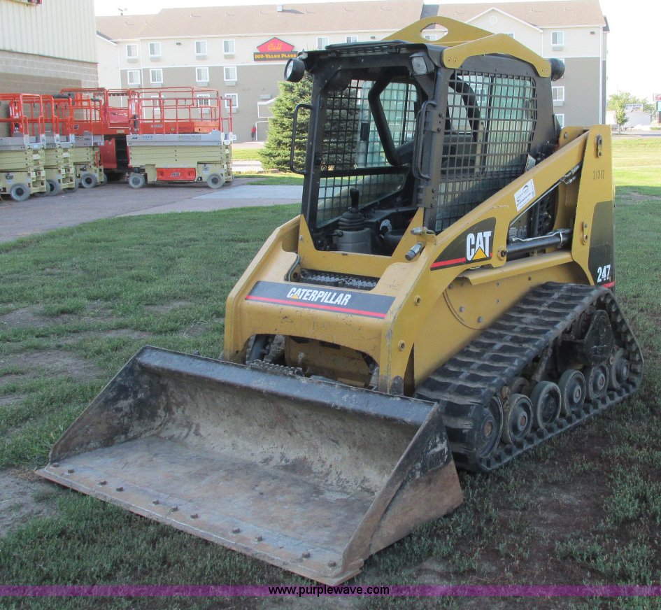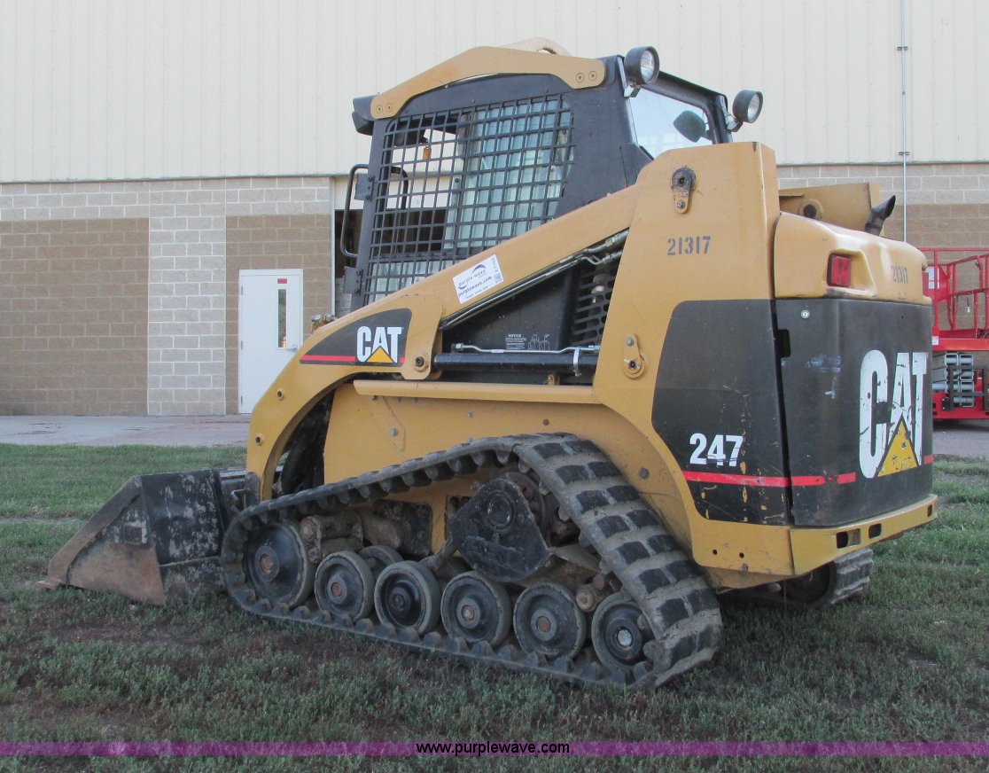 Purple Wave is selling a used Tracked Skid Steer Loader in South Dakota. This item is a 2003 Caterpillar 247 track skid steer with the following: 2,856 hours on meter, Hours may vary, still in use, Caterpillar 3034 diesel engine, 54 HP, Enclosed cab, Heat, Front and rear work lights, Caterpillar hand controls, Front door missing, GP 73"W bucket, 0.048 cu. yd. capacity, 2,100 lbs operating load, Front auxiliary hydraulics, 15"W tracks, 6,629 lbs. base operating weight, Serial CAT00247JCMMLD1546