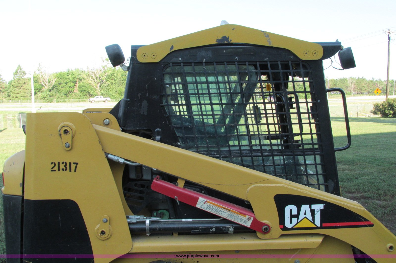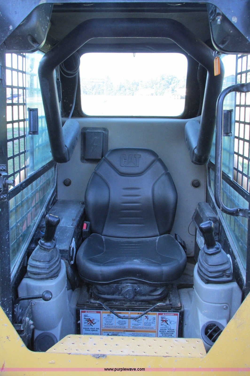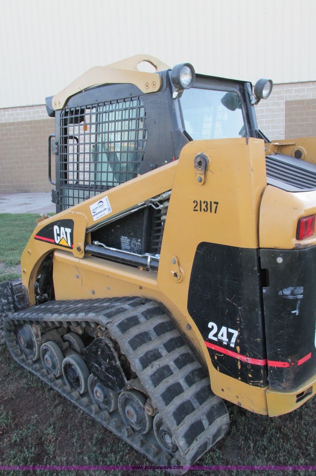 Purple Wave is selling a used Tracked Skid Steer Loader in South Dakota. This item is a 2003 Caterpillar 247 track skid steer with the following: 2,856 hours on meter, Hours may vary, still in use, Caterpillar 3034 diesel engine, 54 HP, Enclosed cab, Heat, Front and rear work lights, Caterpillar hand controls, Front door missing, GP 73"W bucket, 0.048 cu. yd. capacity, 2,100 lbs operating load, Front auxiliary hydraulics, 15"W tracks, 6,629 lbs. base operating weight, Serial CAT00247JCMMLD1546