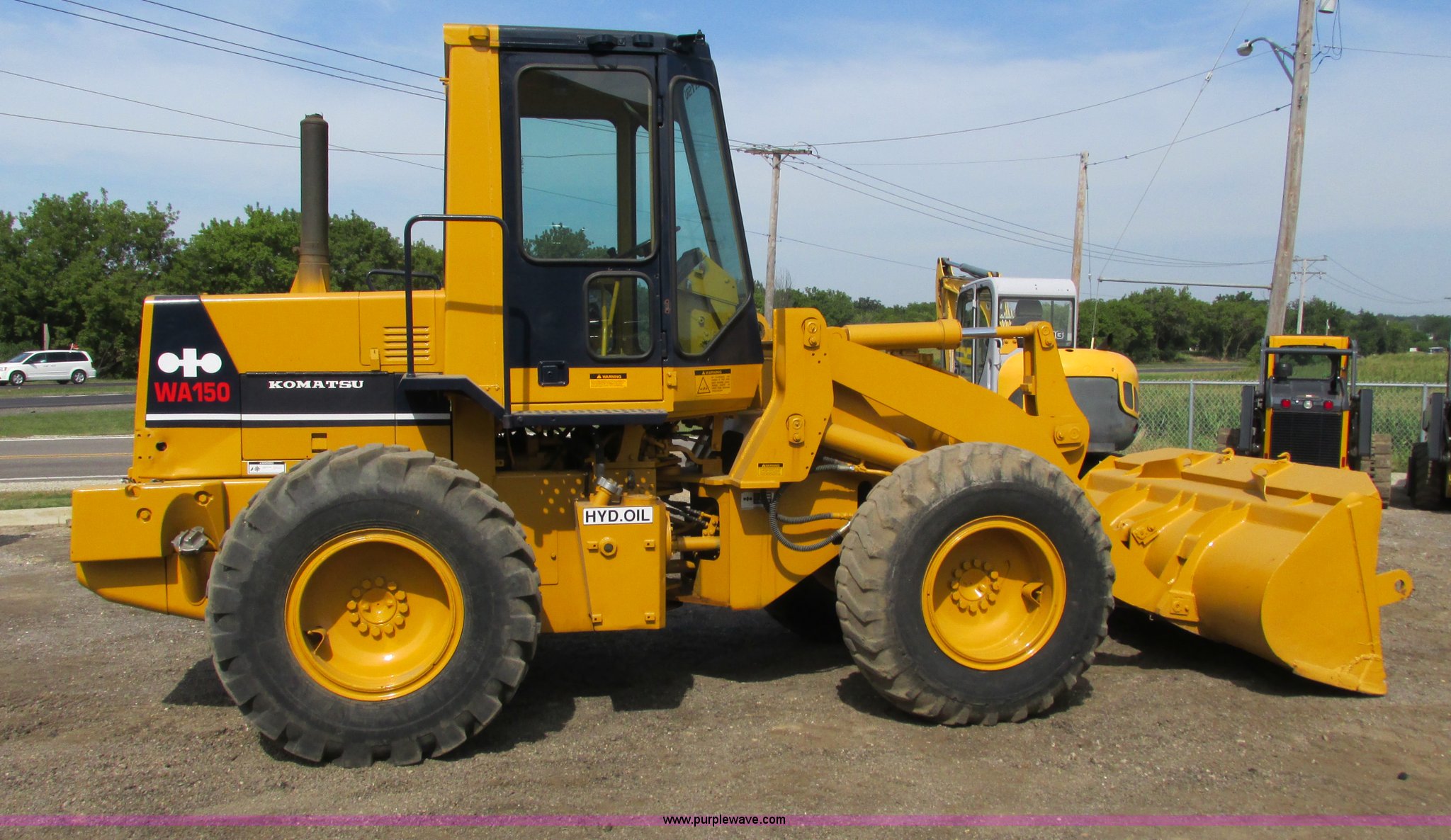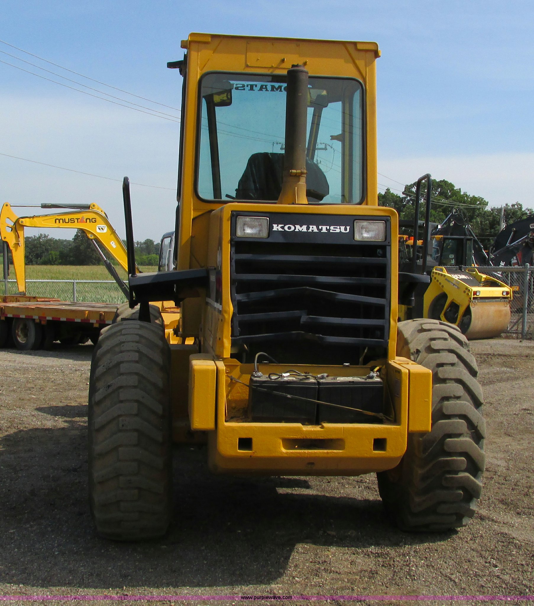 Purple Wave is selling a used Wheel Loader in Illinois. This item is a 1987 Komatsu WA150-1 wheel loader with the following: 5,412 hours on meter, Six cylinder diesel engine, Model SD695L-1, Powershift transmission, 3F-3R gears, Spring suspesnion seat, 92"W bucket, 17.5-25 tires, 17,330 lbs. base operating weight, No lights or windshield wipers, Rear engine/radiator guard broken, Missing battery cover, Torn seat cover, Serial 10282