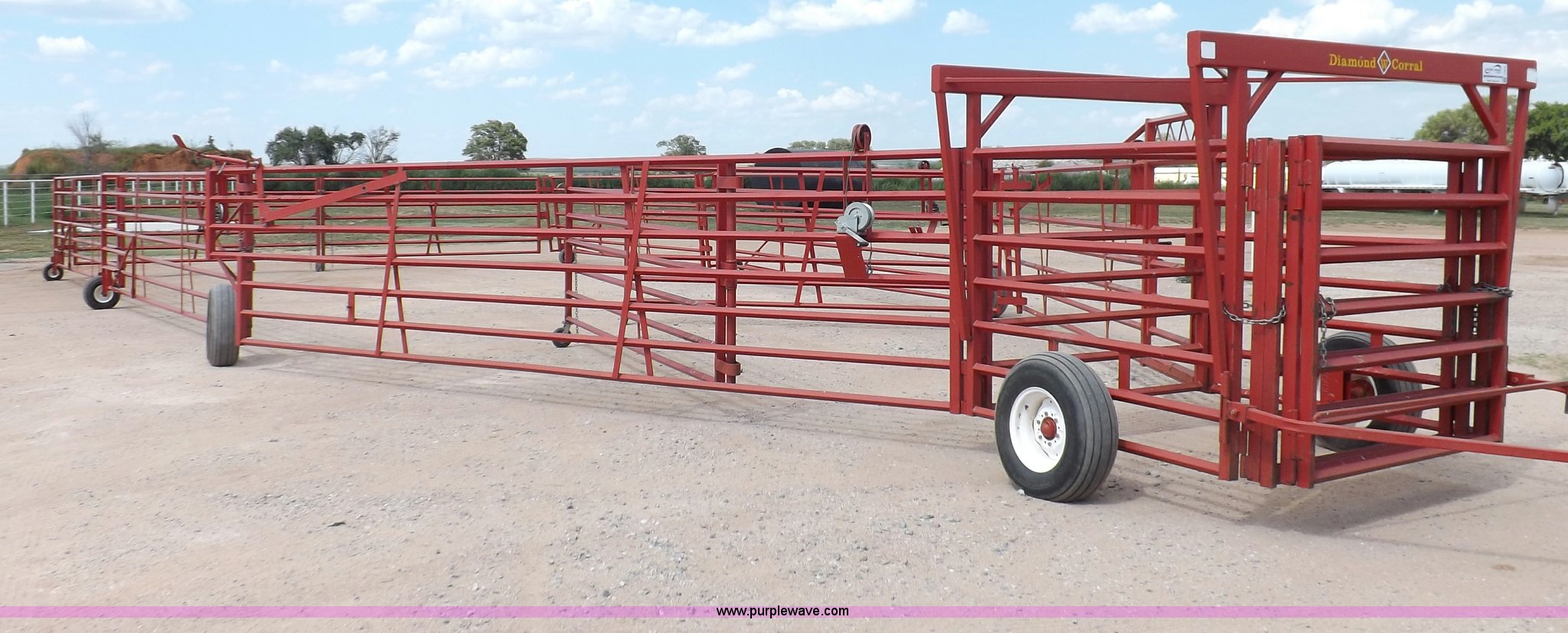 Purple Wave is selling a used Livestock Equip. in Oklahoma. This item is a Diamond W 840162 portable corral system with the following: (4) folding panels per side, Appoximately 85', Approximately 17' chute with gates, Side bracing, Squeeze chutes, Removable tongue, 3/4" pin, (4) 11L15 tires, (2) 13 x 8.5-8 tires, (2) 13 x 6.5-6 tires, (4) 8" x 2" solid casters