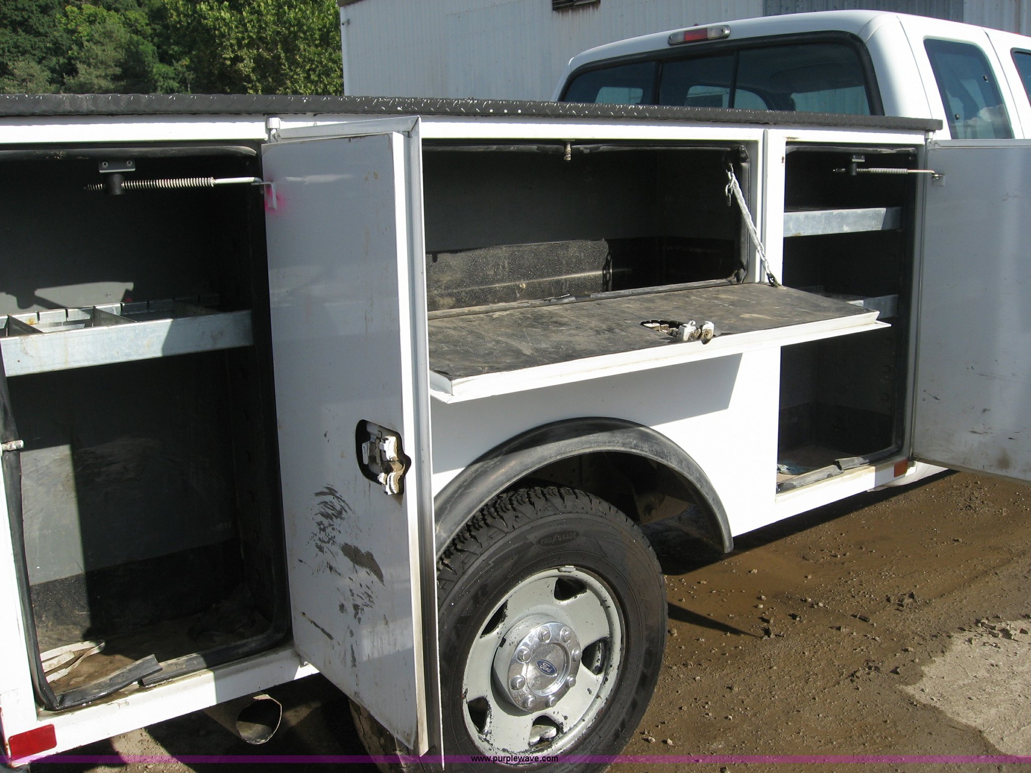 Purple Wave is selling a used Service Truck in Kansas. This item is a 2006 Ford F250 Super Duty XL SuperCab service truck with the following: 163,047 actual miles, 6.0L V8 OHV 32V turbo diesel engine, Automatic transmission, AC and heat, Tilt, Cruise, AM/FM, Power windows, locks, and mirrors, Vinyl interior, Sliding rear window, Dakota Bodies, Inc. service bed, Model 98-SB, 8'L x 80"W, 1' step, 50"W between toolboxes, (2) 28"W x 39"H x 14"D, (2) 39"H x 22"W x 14"D, (2) 48"W x 18"H x 14"D, Serial DB07746, Front tow hooks, Receiver hitch, Trailer wiring, LT245/75R17 tires