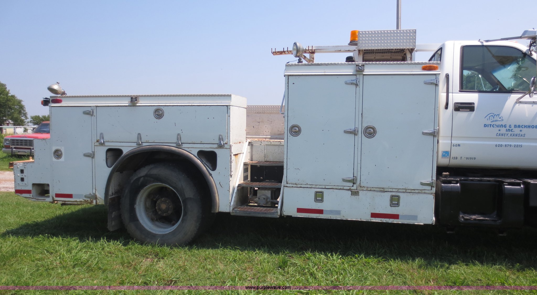 1994 GMC TopKick service truck. 179,549 actual miles, 9,719 hours on meter, Caterpillar 3116 6.6L six cylinder diesel engine, Allison automatic transmission, Differential lock, AC and heat, Hose reels, PTO, 160 CFM air compressor, On-board generator Inoperable, Additional rebuilt generator included Purchaser must install, Pintle hitch, Air brakes, 11R22.5 tires, GVWR 33,000 lbs, FAWR 12,000 lbs, RAWR 21,000 lbs. 1GDM7H1J8RJ504950. Tom's Ditching & Backhoe Inc.. 1876C Highway 75. Caney, KS 67333