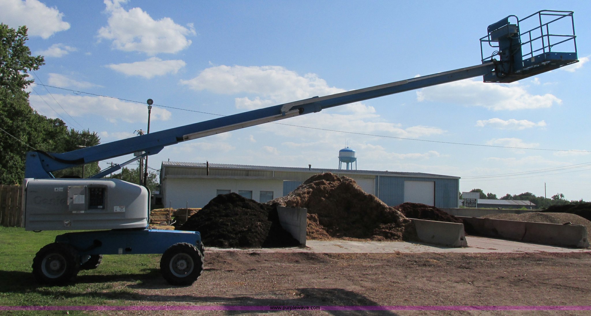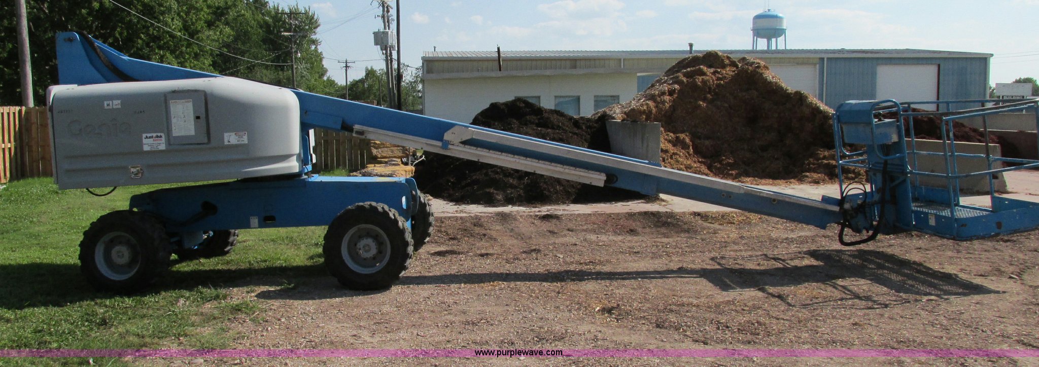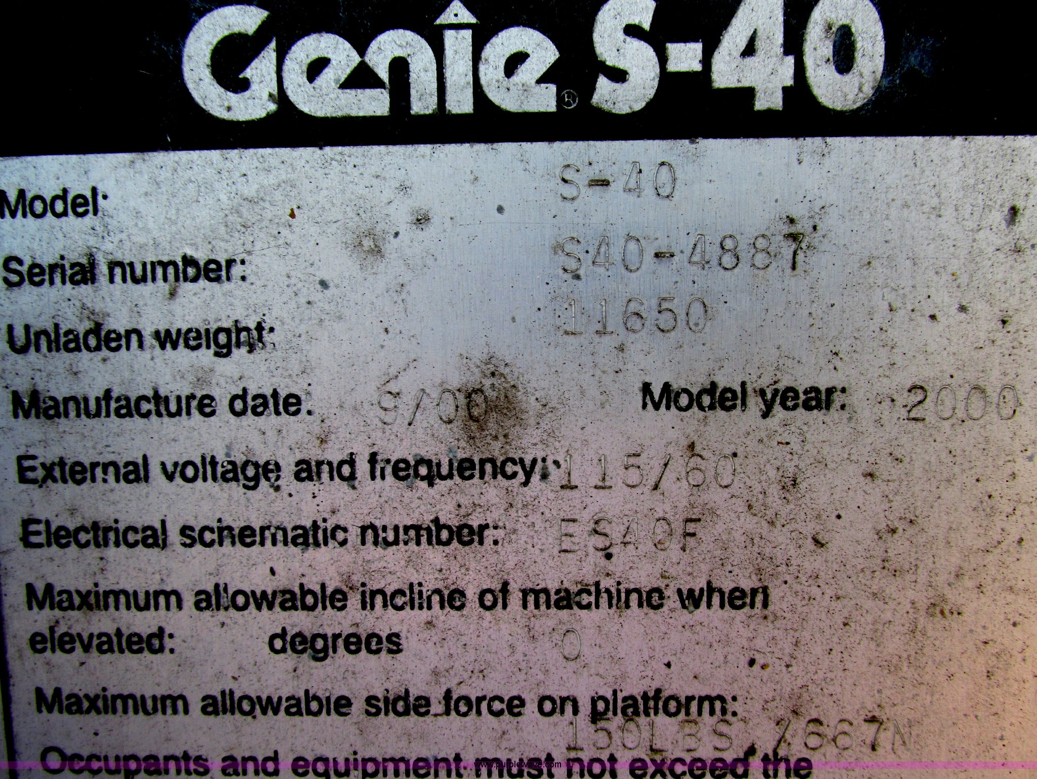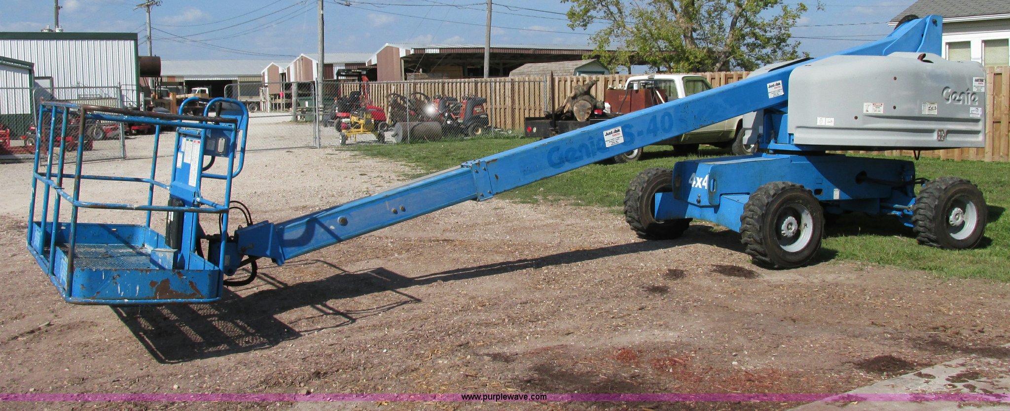 Purple Wave is selling a used Boom Lift in Missouri. This item is a 2000 Genie S40 boom lift with the following: 3,659 hours on meter, Ford four cylinder dual fuel engine, Gas or LP, Four wheel drive, Upper and lower controls, 500 lbs lift capacity, Power to the platform, 12-16.5 foam-filled tires, 11,650 lbs. base operating weight, Serial S40-4887