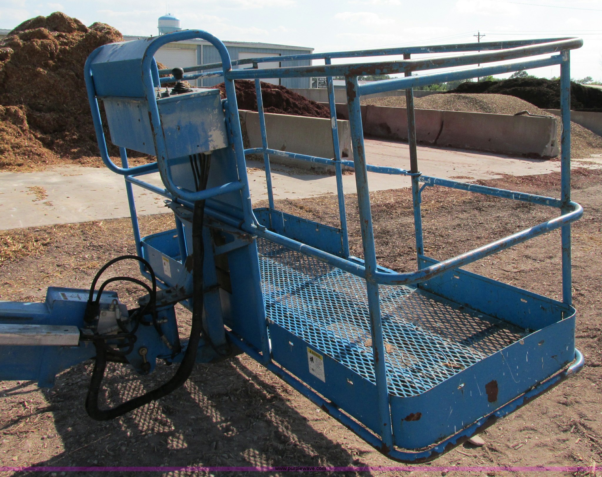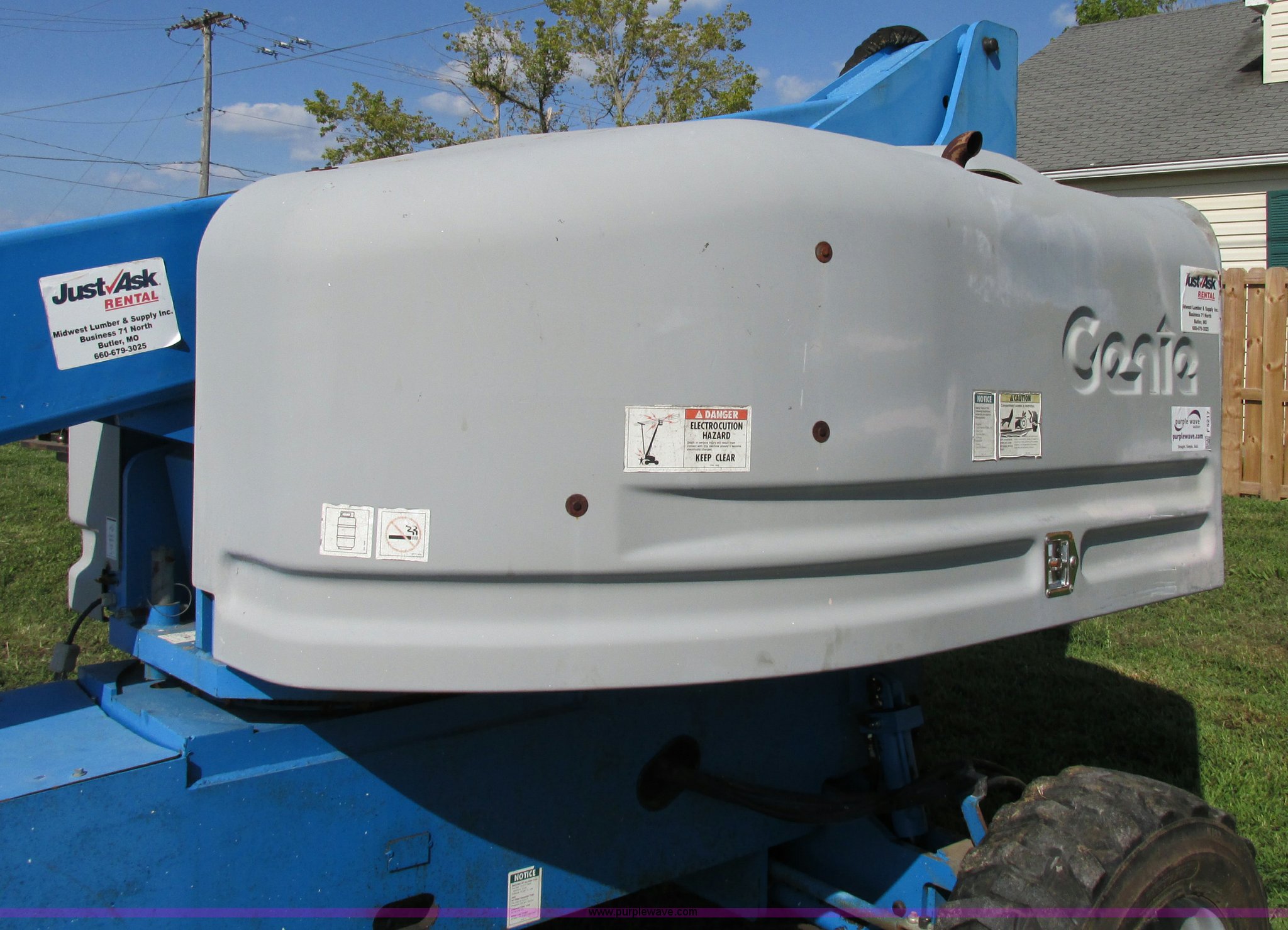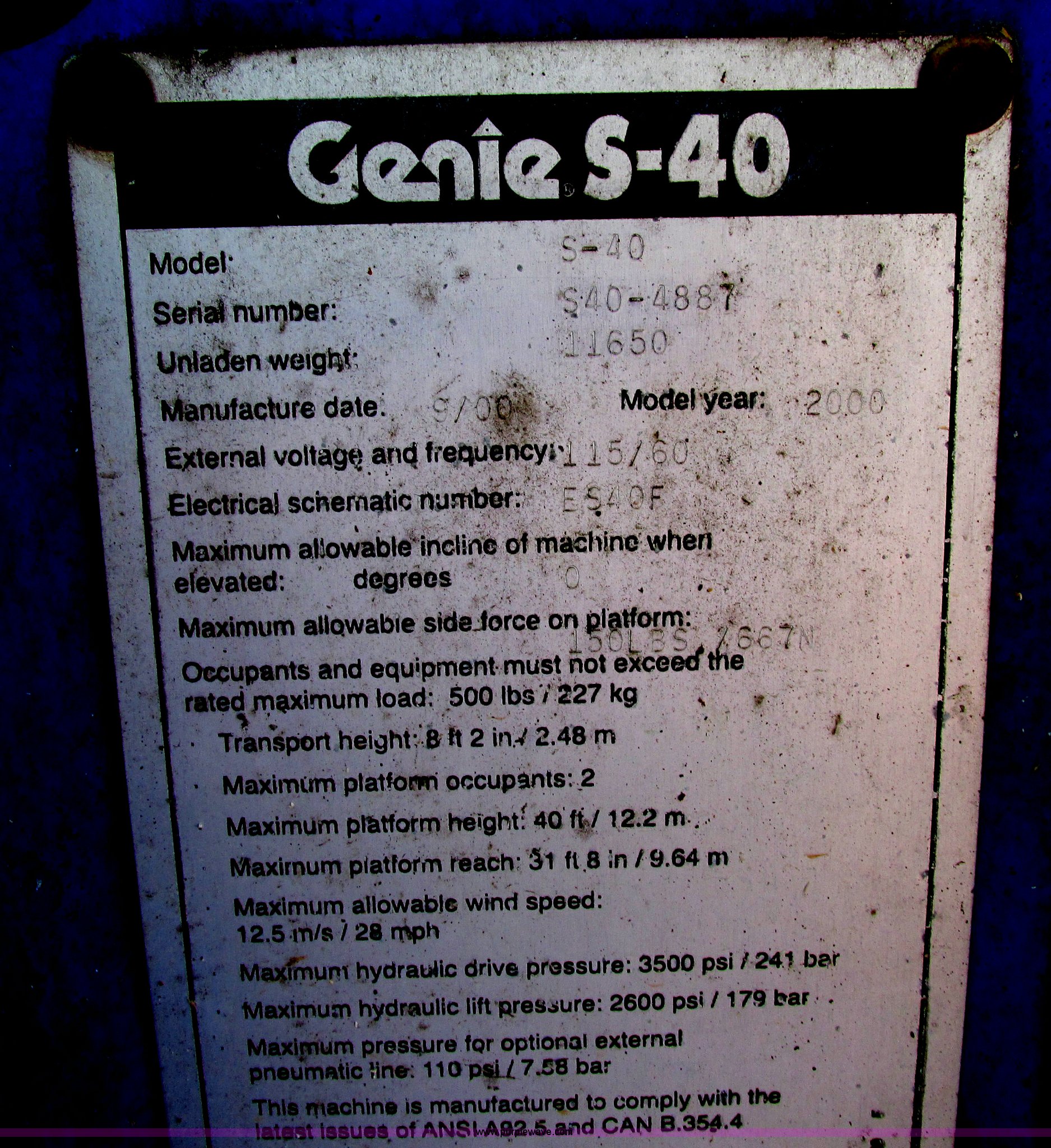 Purple Wave is selling a used Boom Lift in Missouri. This item is a 2000 Genie S40 boom lift with the following: 3,659 hours on meter, Ford four cylinder dual fuel engine, Gas or LP, Four wheel drive, Upper and lower controls, 500 lbs lift capacity, Power to the platform, 12-16.5 foam-filled tires, 11,650 lbs. base operating weight, Serial S40-4887