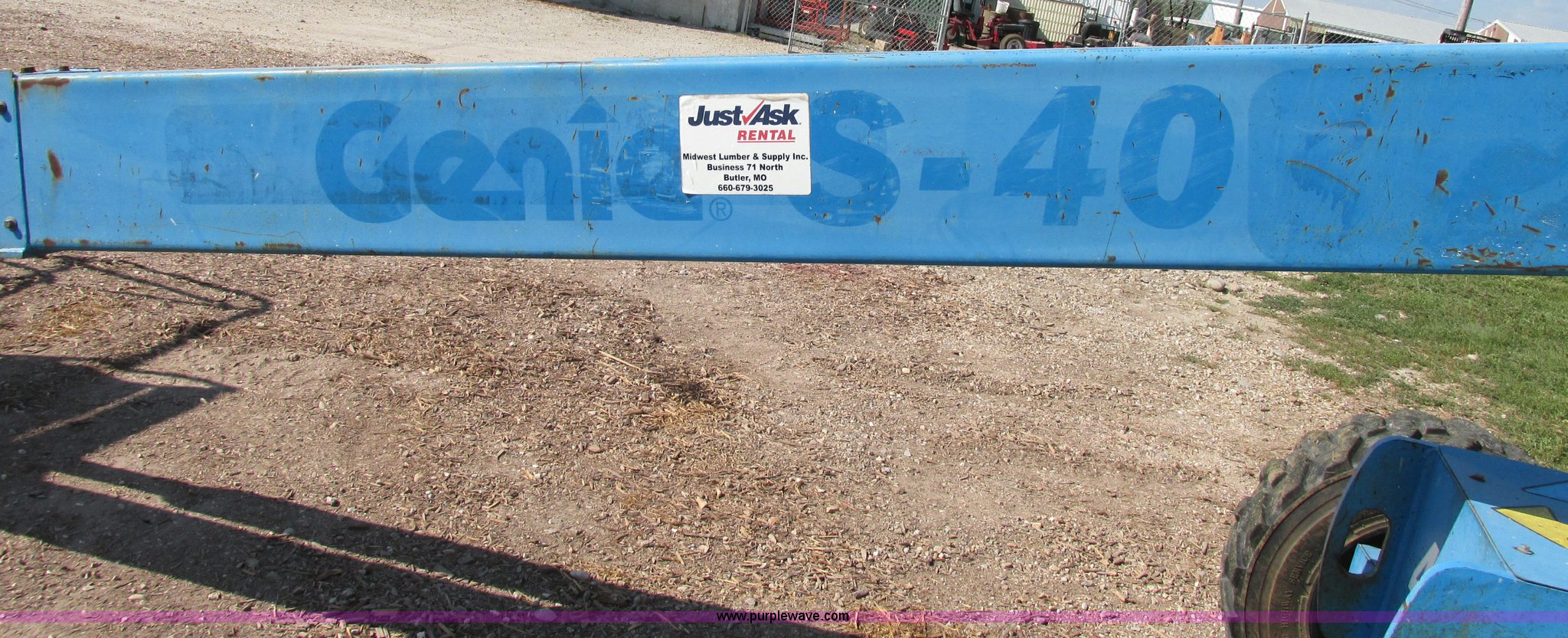 2000 Genie S40 boom lift. 3,659 hours on meter, Ford four cylinder dual fuel engine Gas or LP, Four wheel drive, Upper and lower controls, 500 lbs lift capacity, Power to the platform, 12-16.5 foam-filled tires, 11,650 lbs. base operating weight, Serial S40-4887. Midwest Lumber & Supply, Inc.. 1007 N Orange St. Butler, MO 64730
