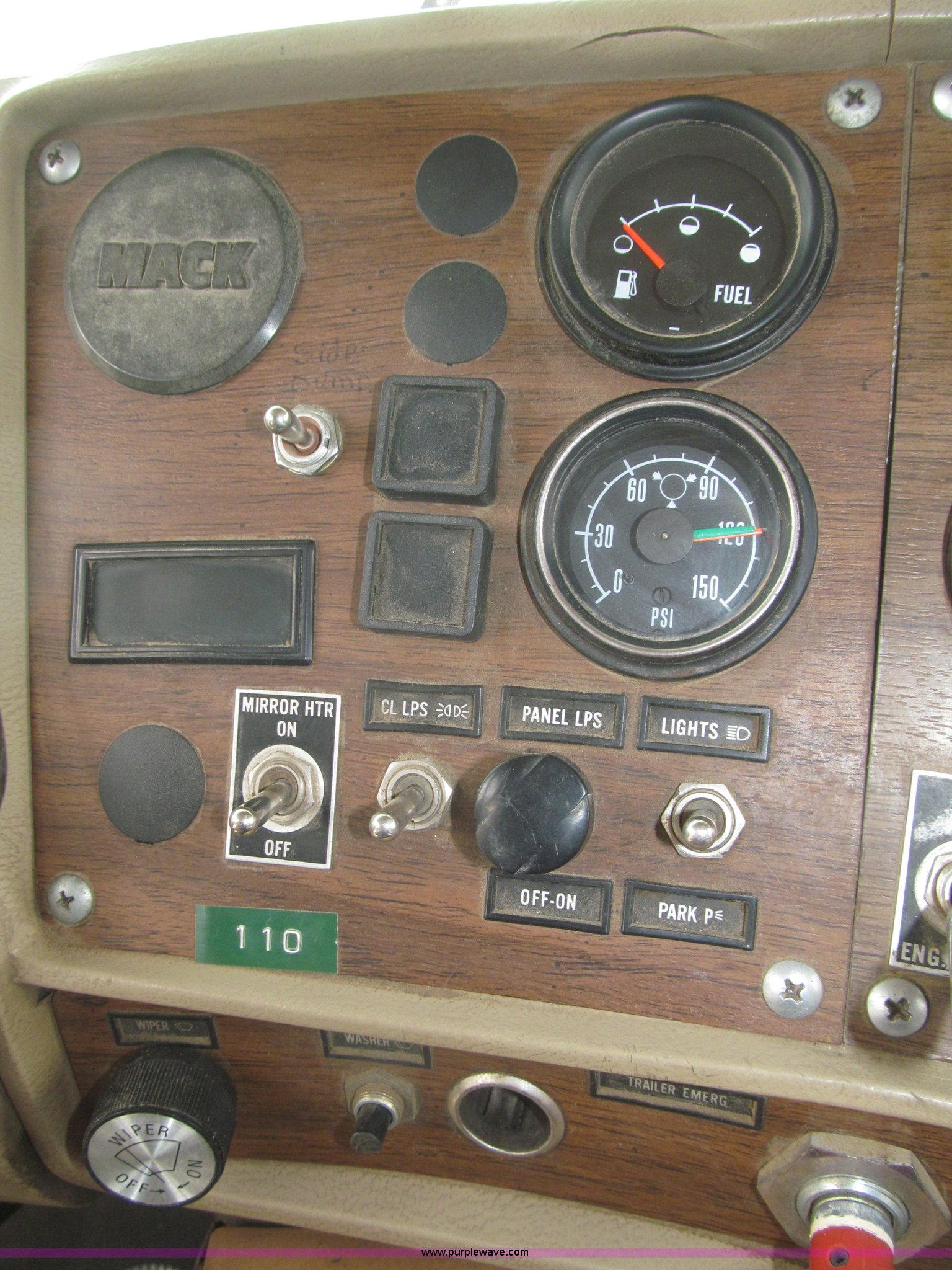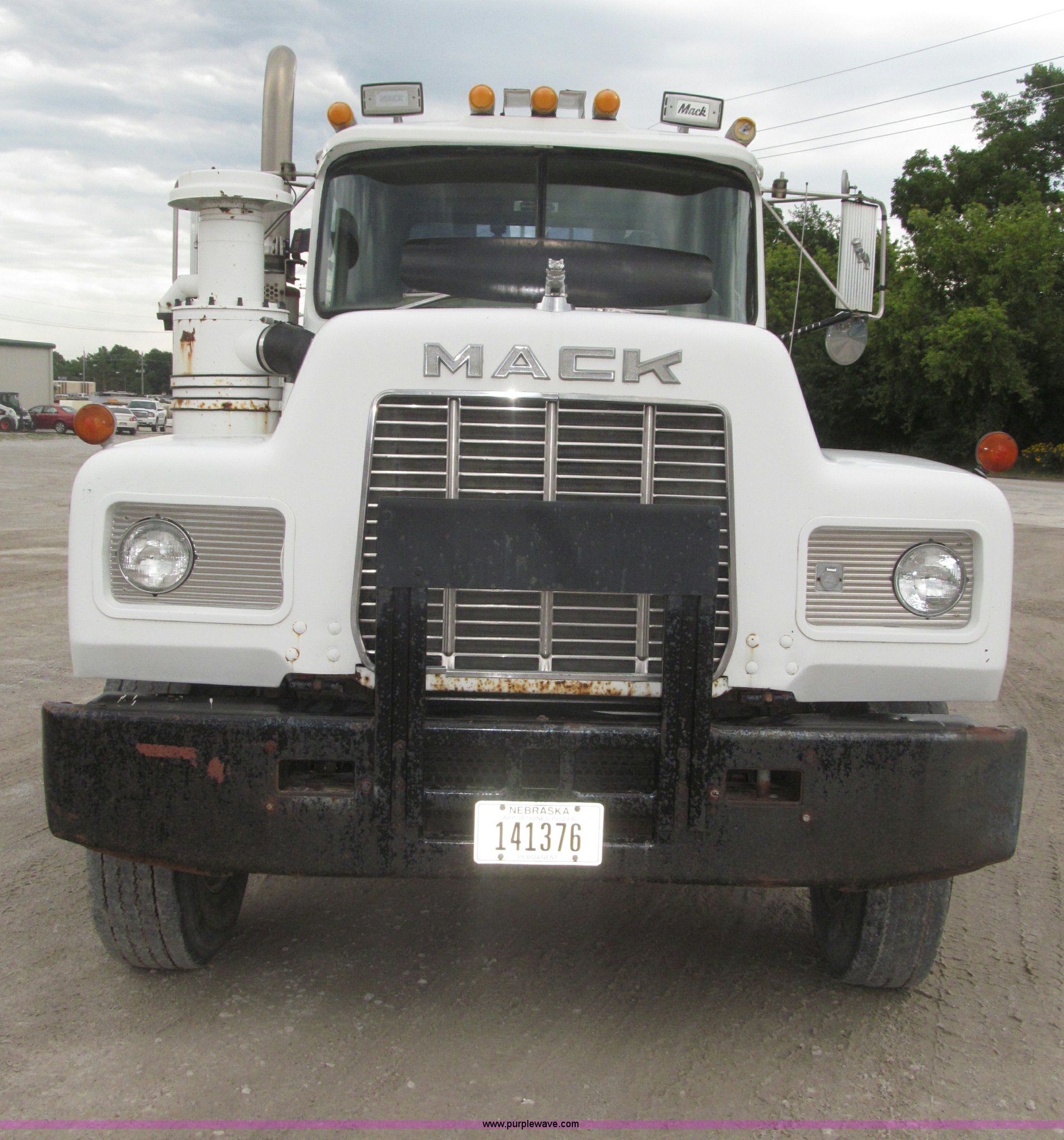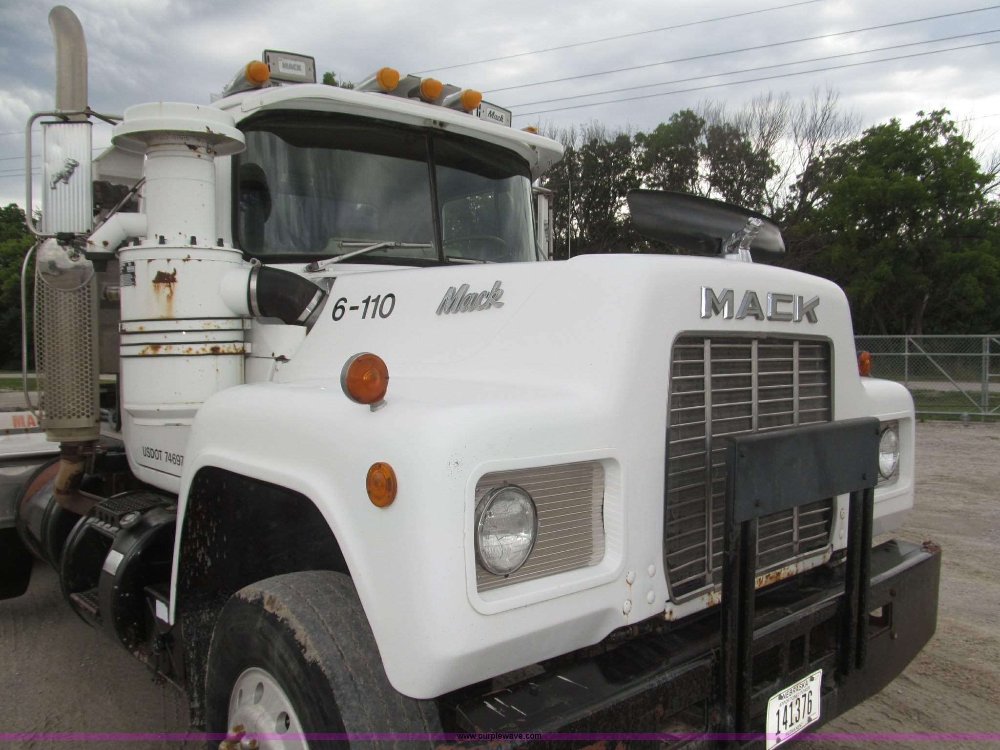 Purple Wave is selling a used Truck Tractor in Nebraska. This item is a 1985 Mack RD688S Econodyne triple axle semi truck with the following: 27,550 miles on odometer, 9,842 hours on meter, Mack E6-350 11.0L L6 turbo diesel engine, 350 HP, Maxitorque Extended Range 12 speed manual transmission, Twin screw, AC and heat, Jensen CR225X night glow AM/FM/cassette, Bostrom Talladega air suspension seat, Heated mirrors, Air ride cab, Silent drive pusher axle control, Bug deflector, East headache rack, Window, Storage, Chain hanger, Rear lights and strobe, 10 gauge instrument cluster, Merritt saddle box, Visor, Bumper, Block heater, Holland air slide fifth wheel, 48" air powered, Dual fuel tanks, 75 and 45 gallon capacities, Single rear exhaust stacks, Aluminum deck plate, Front tow hooks, One missing, 50 gallon hydraulic tank, Stainless steel quarter fenders, PTO, Wet kit, Spring suspension, Air brakes, Jake brake, Nut wheel covers, Camelback rear spring suspension, 252" wheelbase, Aluminum wheels, Non-steerbale pusher axles, 275/80R22.5 pusher tires, 11R22.5 tires, 44,000 lbs rear driver axles, Clutch and air compressor replaced in 2006, Fewer than 20,000 miles since being replaced, Interior/exterior cosmetic damage, Rust, Unit# 06-110