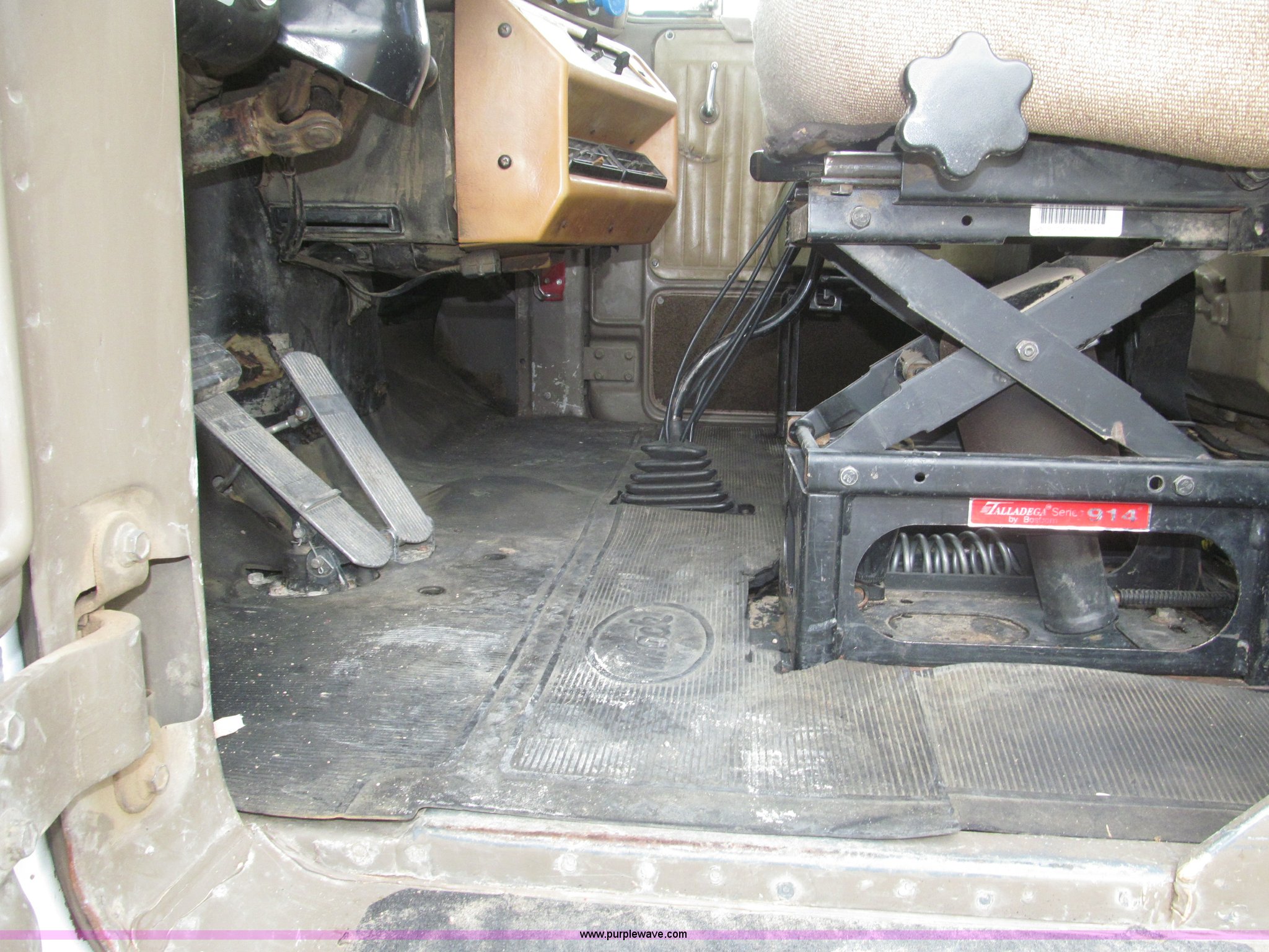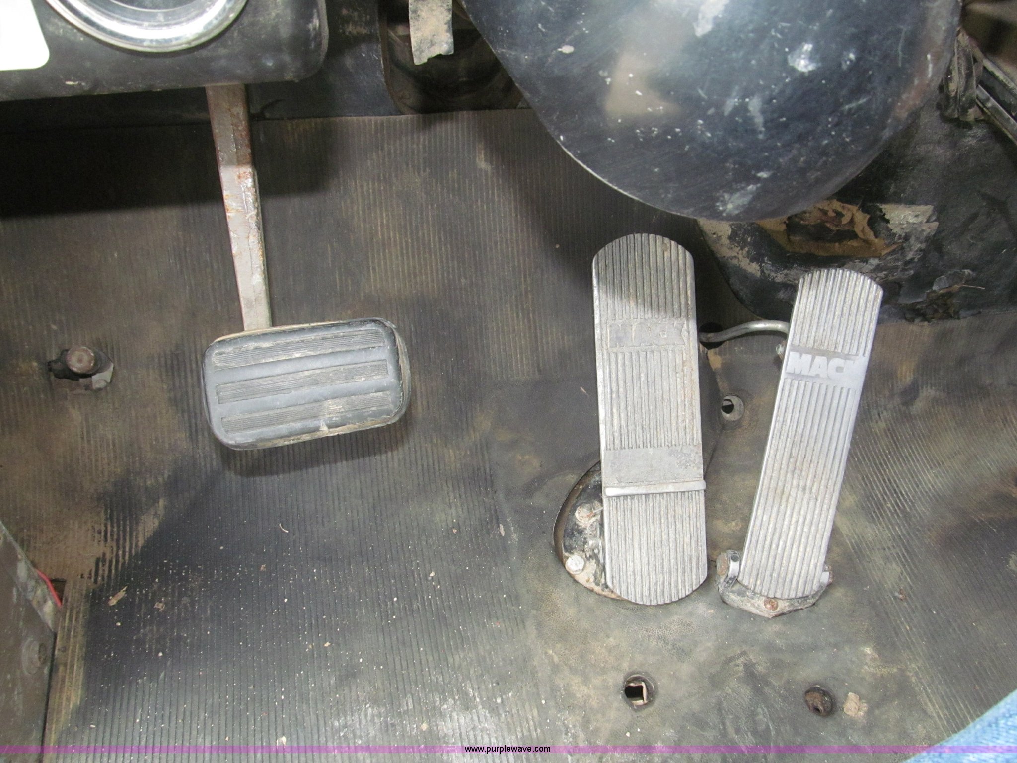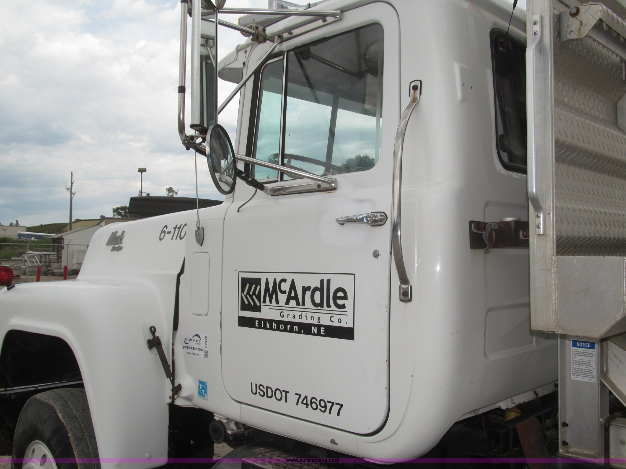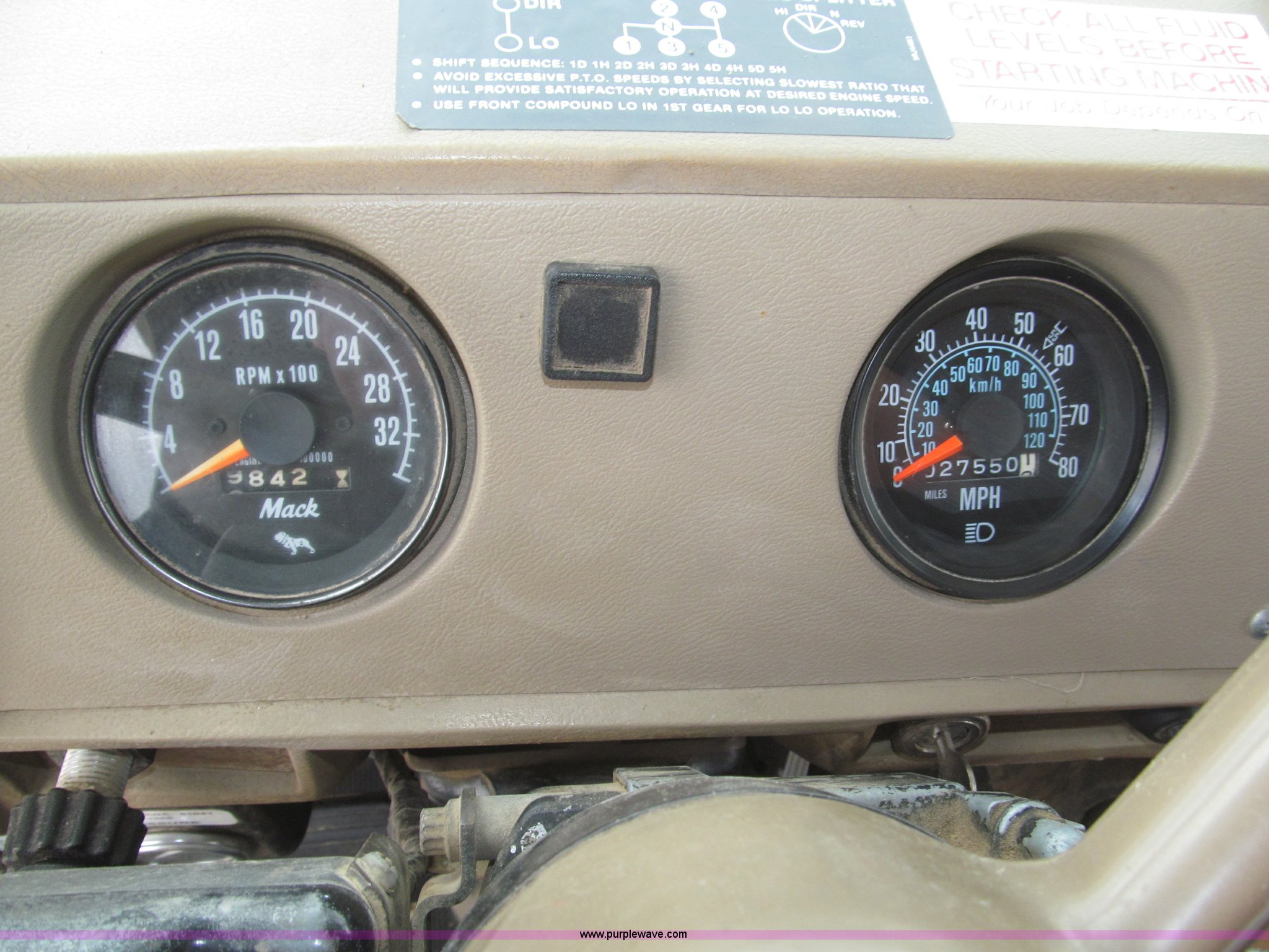 1985 Mack RD688S Econodyne triple axle semi truck. 27,550 miles on odometer, 9,842 hours on meter, Mack E6-350 11.0L L6 turbo diesel engine 350 HP, Maxitorque Extended Range 12 speed manual transmission, Twin screw, AC and heat, Jensen CR225X night glow AM/FM/cassette, Bostrom Talladega air suspension seat, Heated mirrors, Air ride cab, Silent drive pusher axle control, Bug deflector, East headache rack Window, Storage, Chain hanger, Rear lights and strobe, 10 gauge instrument cluster, Merritt saddle box, Visor, Bumper, Block heater, Holland air slide fifth wheel 48" air powered, Dual fuel tanks 75 and 45 gallon capacities, Single rear exhaust stacks, Aluminum deck plate, Front tow hooks One missing, 50 gallon hydraulic tank, Stainless steel quarter fenders, PTO, Wet kit, Spring suspension, Air brakes, Jake brake, Nut wheel covers, Camelback rear spring suspension, 252" wheelbase, Aluminum wheels, Non-steerbale pusher axles, 275/80R22.5 pusher tires, 11R22.5 tires, 44,000 lbs rear driver axles, Clutch and air compressor replaced in 2006 Fewer than 20,000 miles since being replaced, Interior/exterior cosmetic damage, Rust, Unit# 06-110. 1M2P141Y0FA003728. View equipment video. McArdle Grading Company. 8535 Irvington Rd. Omaha, NE 68122