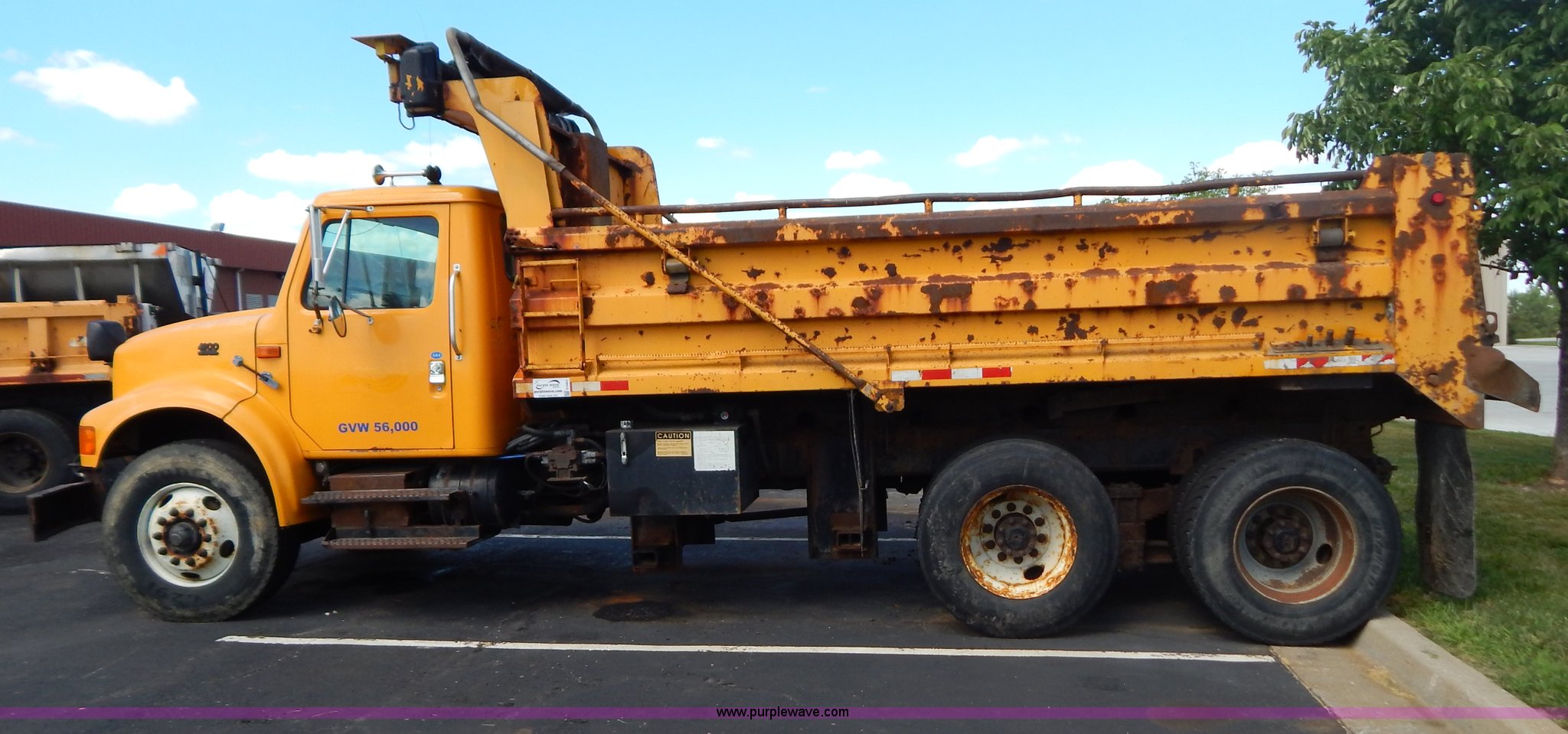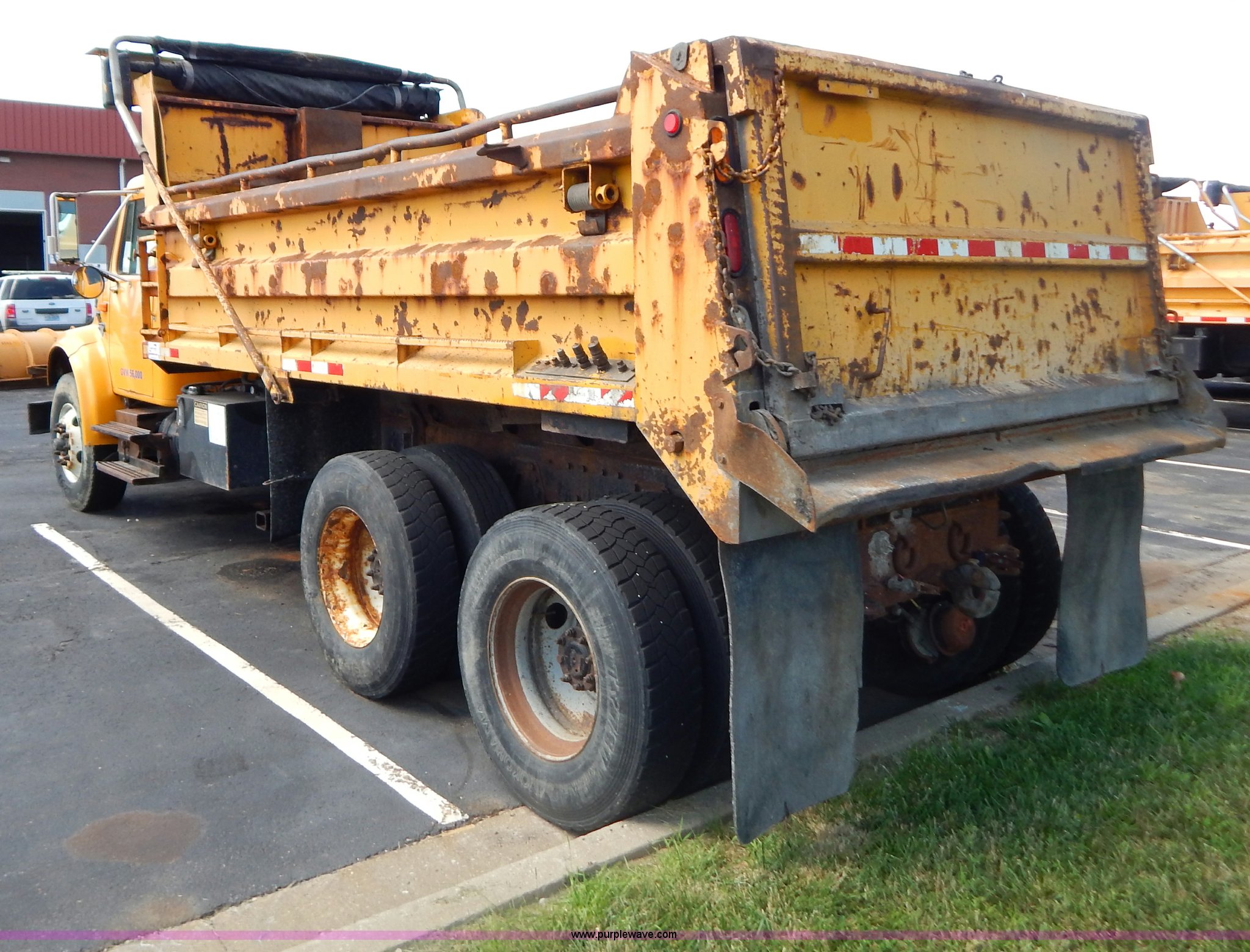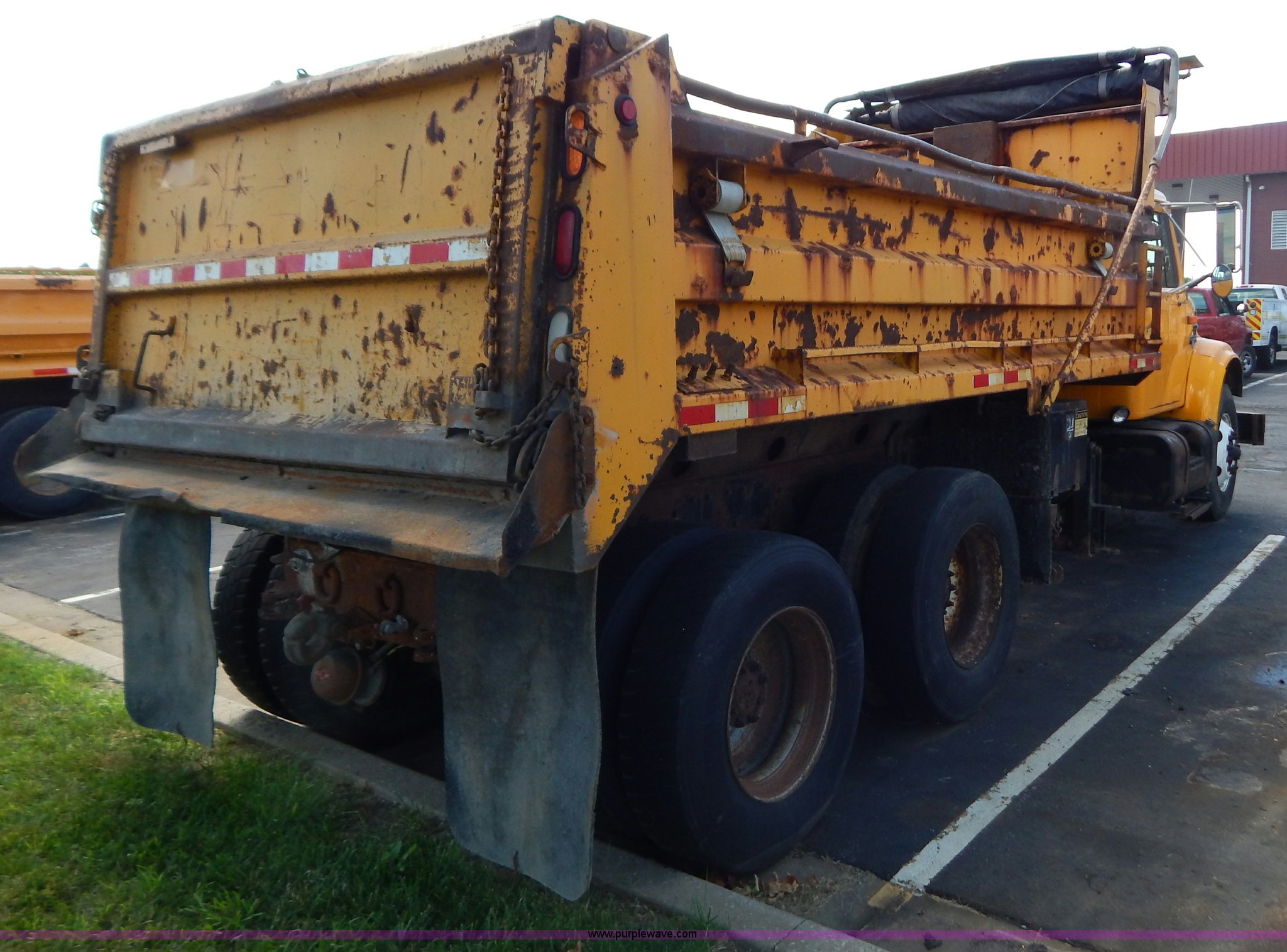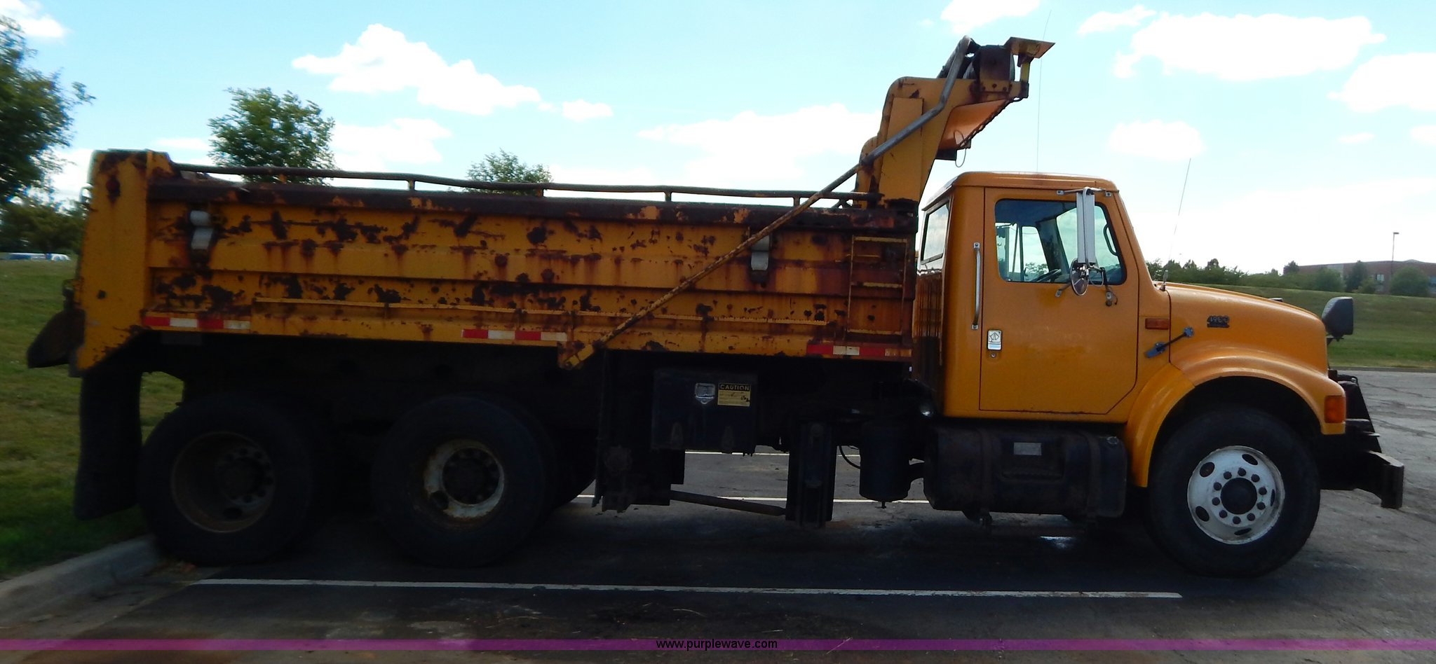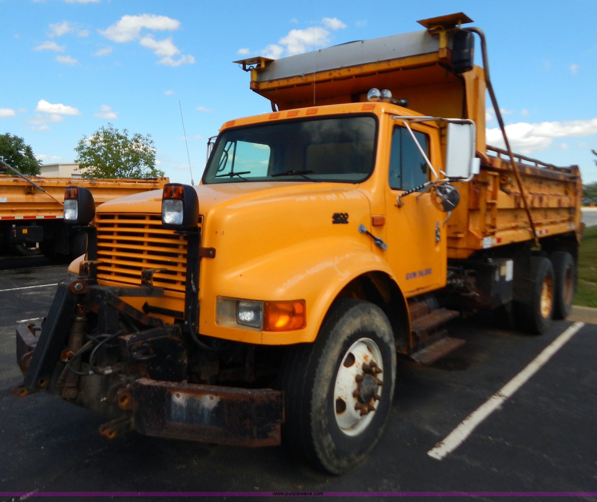 Purple Wave is selling a used Construction Dump Truck in Missouri. This item is a 1999 International 4900 tandem axle dump truck with the following: 211,925 miles on odometer, 11,371 hours on meter, International DT530 8.7L L6 diesel engine, Allison automatic transmission, Heat, Cruise, AM/FM, Heated mirrors, Manual windows and locks, Front mounted PTO, 16'L x 8'W x 32"H dump bed, Trailer air brake hook ups, Spreader and plow controls, Front mounted plow lights, Pintle hitch, Air brakes, 206" wheelbase, 315/80R22.5 tires, Battery dead, Interior/exterior cosmetic damage, Engine oil leaks, Walking beam bushings need replaced, MoDOT ID 6065