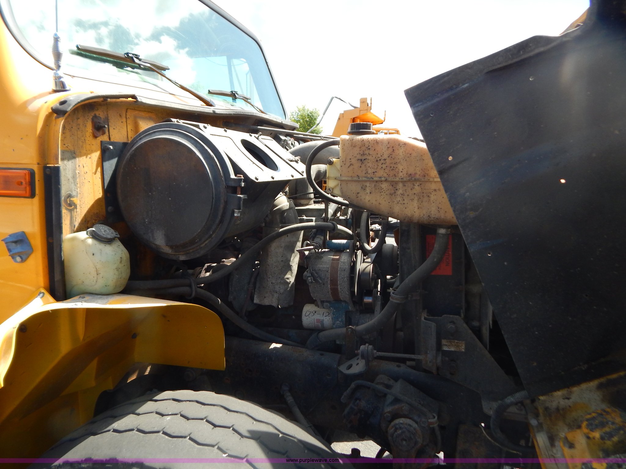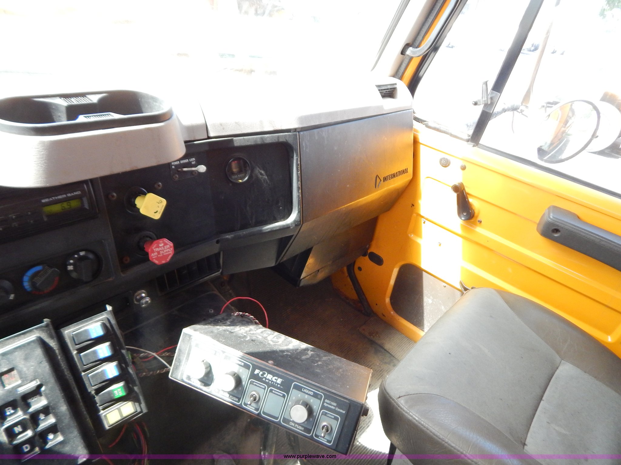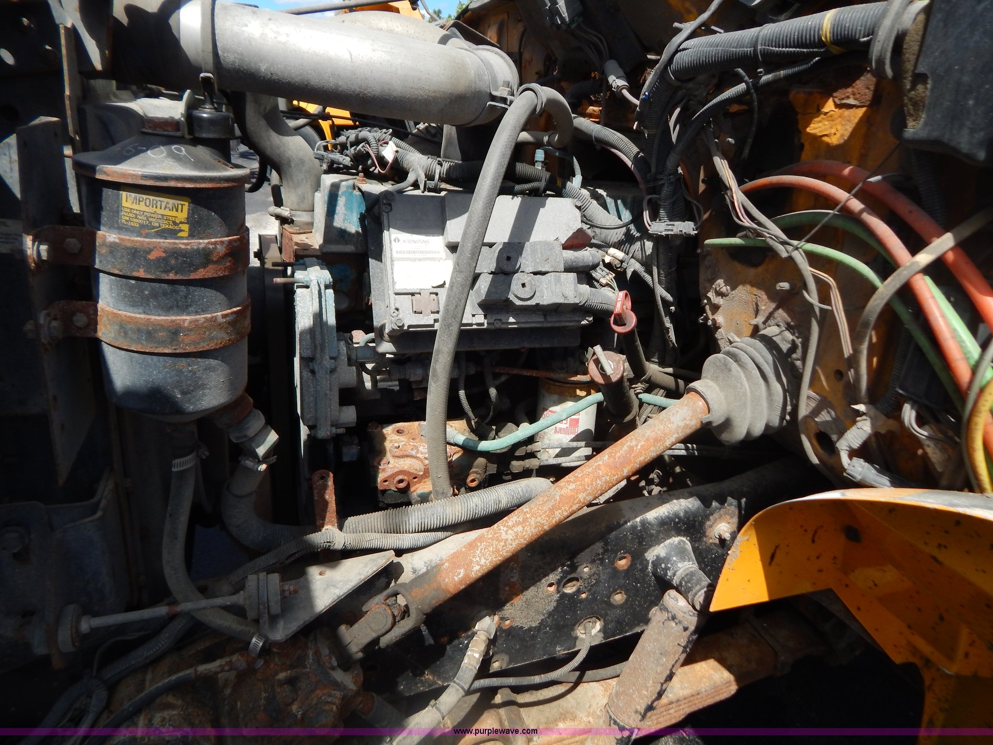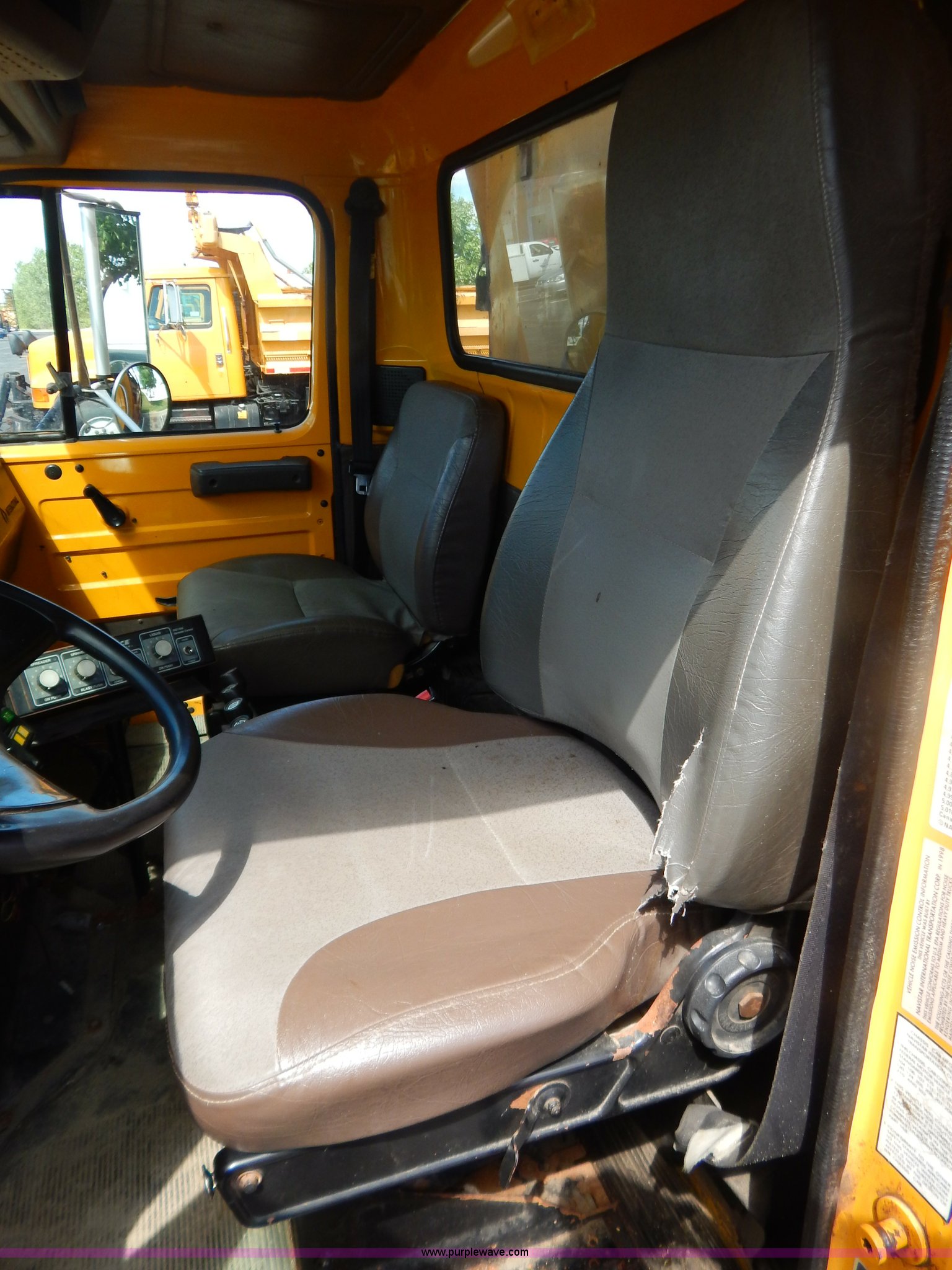 Purple Wave is selling a used Construction Dump Truck in Missouri. This item is a 1999 International 4900 tandem axle dump truck with the following: 211,925 miles on odometer, 11,371 hours on meter, International DT530 8.7L L6 diesel engine, Allison automatic transmission, Heat, Cruise, AM/FM, Heated mirrors, Manual windows and locks, Front mounted PTO, 16'L x 8'W x 32"H dump bed, Trailer air brake hook ups, Spreader and plow controls, Front mounted plow lights, Pintle hitch, Air brakes, 206" wheelbase, 315/80R22.5 tires, Battery dead, Interior/exterior cosmetic damage, Engine oil leaks, Walking beam bushings need replaced, MoDOT ID 6065