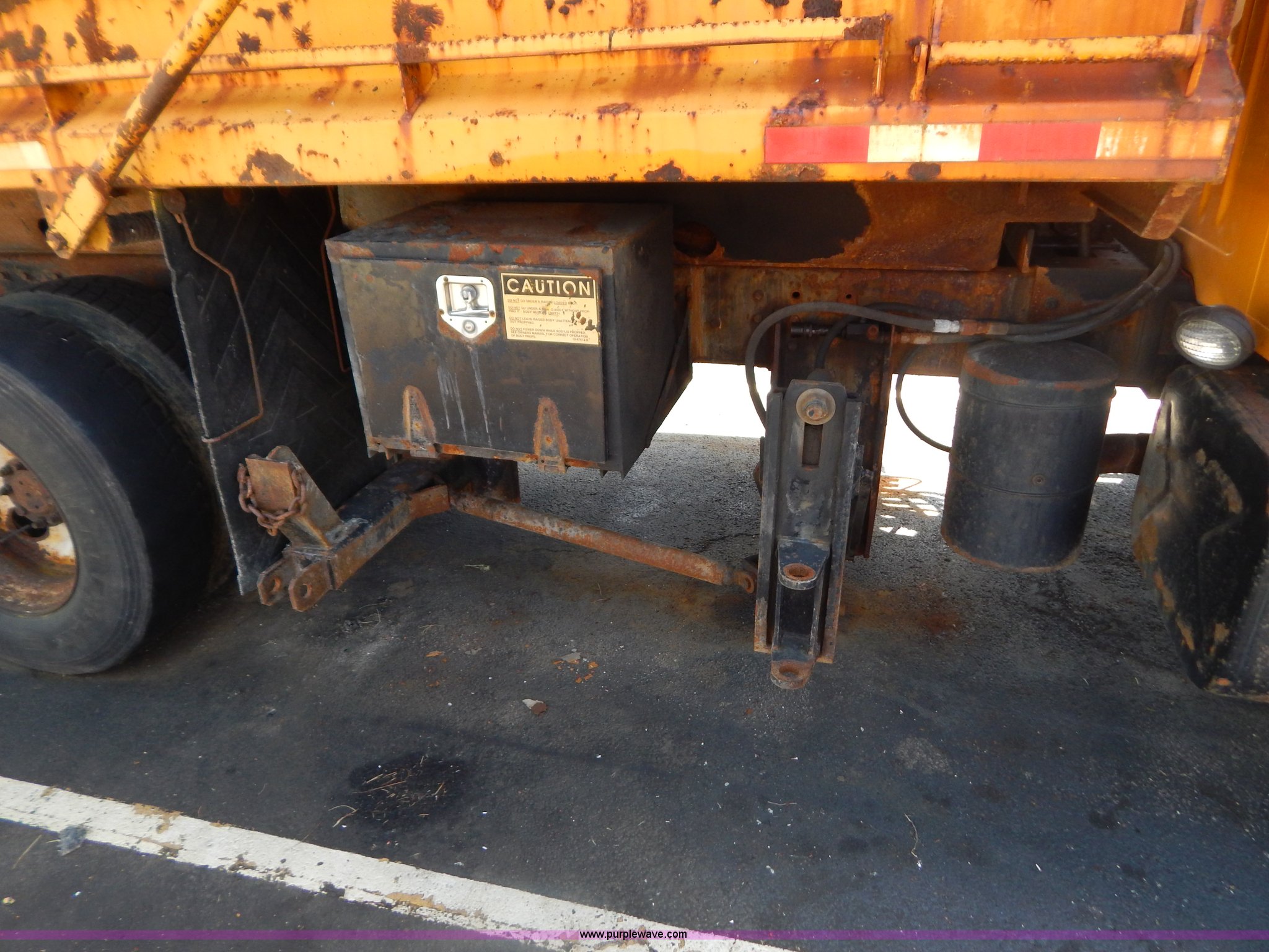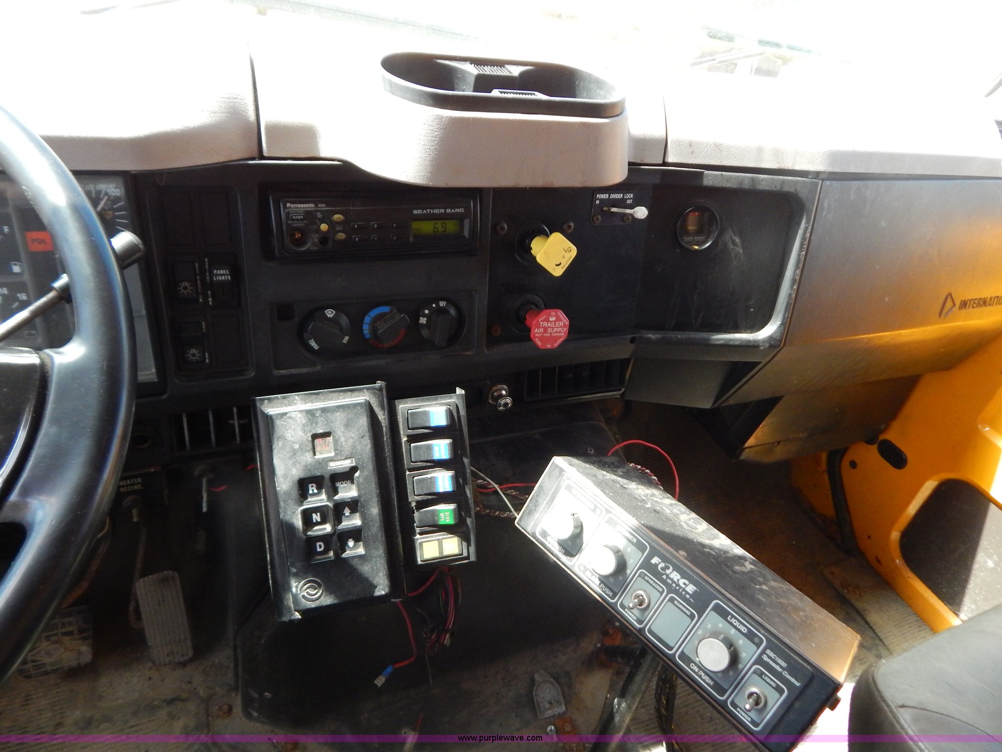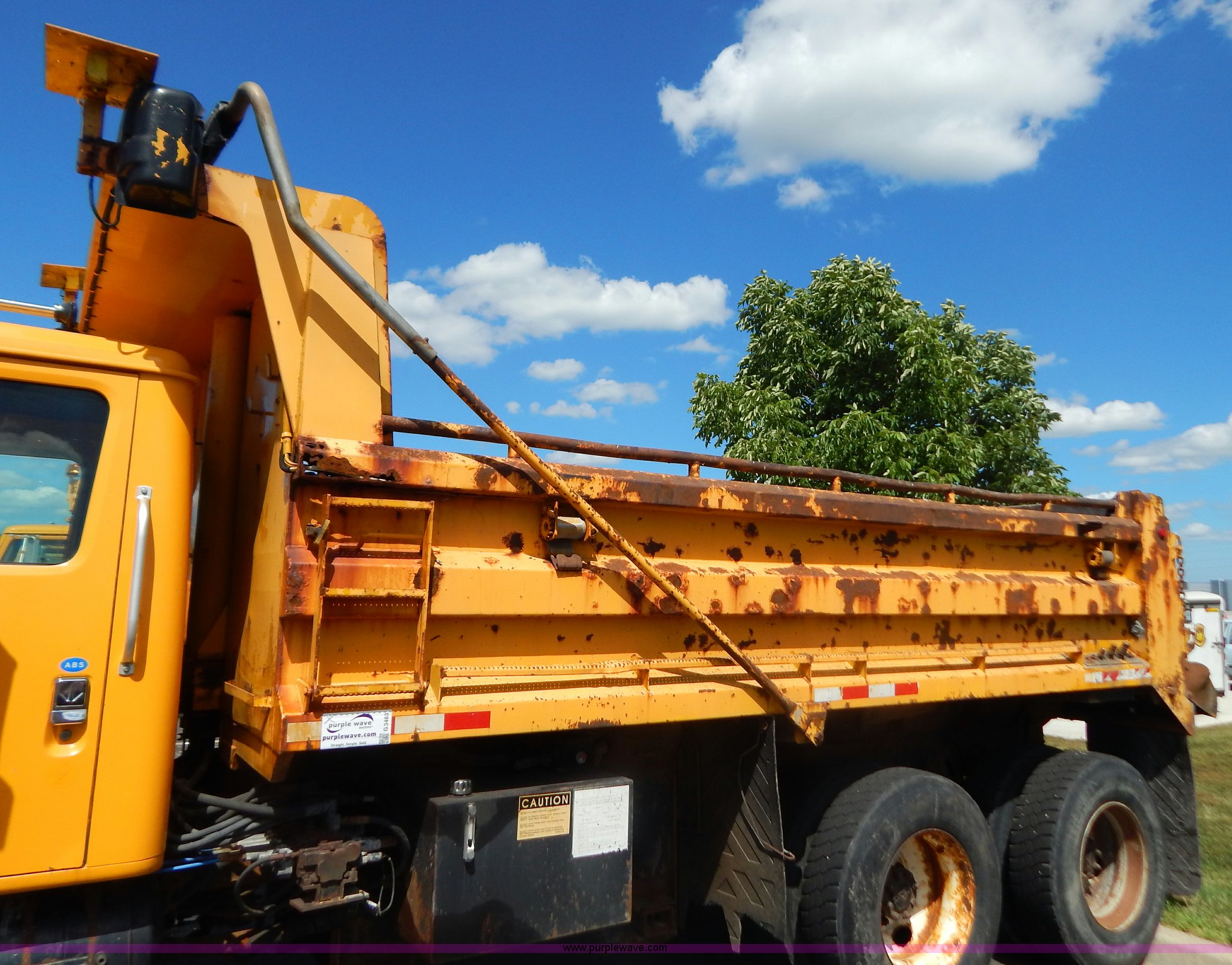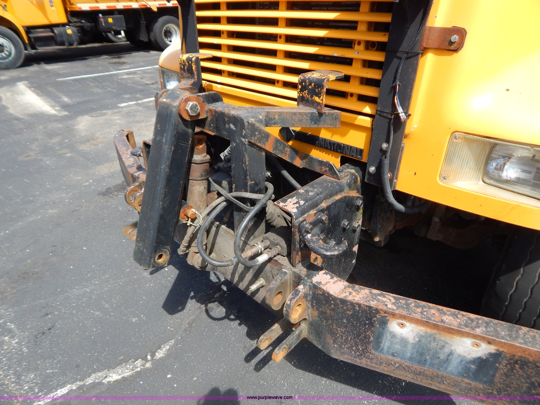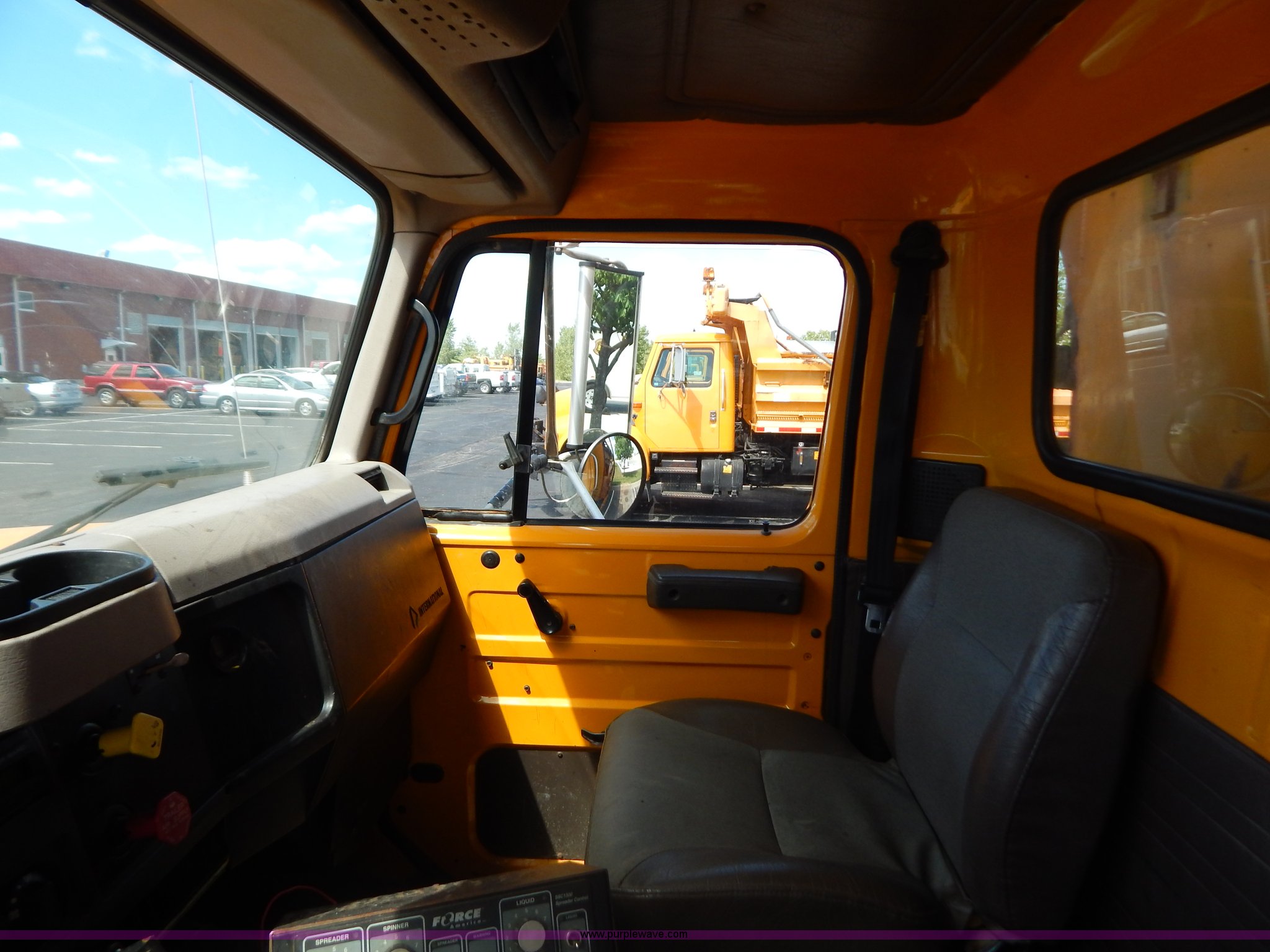Purple Wave is selling a used Construction Dump Truck in Missouri. This item is a 1999 International 4900 tandem axle dump truck with the following: 211,925 miles on odometer, 11,371 hours on meter, International DT530 8.7L L6 diesel engine, Allison automatic transmission, Heat, Cruise, AM/FM, Heated mirrors, Manual windows and locks, Front mounted PTO, 16'L x 8'W x 32"H dump bed, Trailer air brake hook ups, Spreader and plow controls, Front mounted plow lights, Pintle hitch, Air brakes, 206" wheelbase, 315/80R22.5 tires, Battery dead, Interior/exterior cosmetic damage, Engine oil leaks, Walking beam bushings need replaced, MoDOT ID 6065