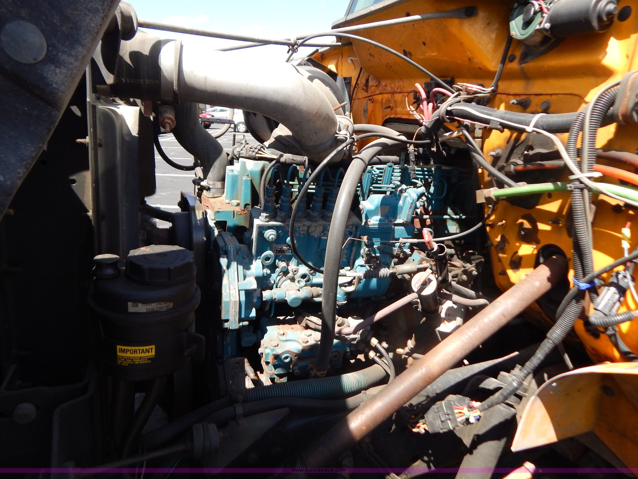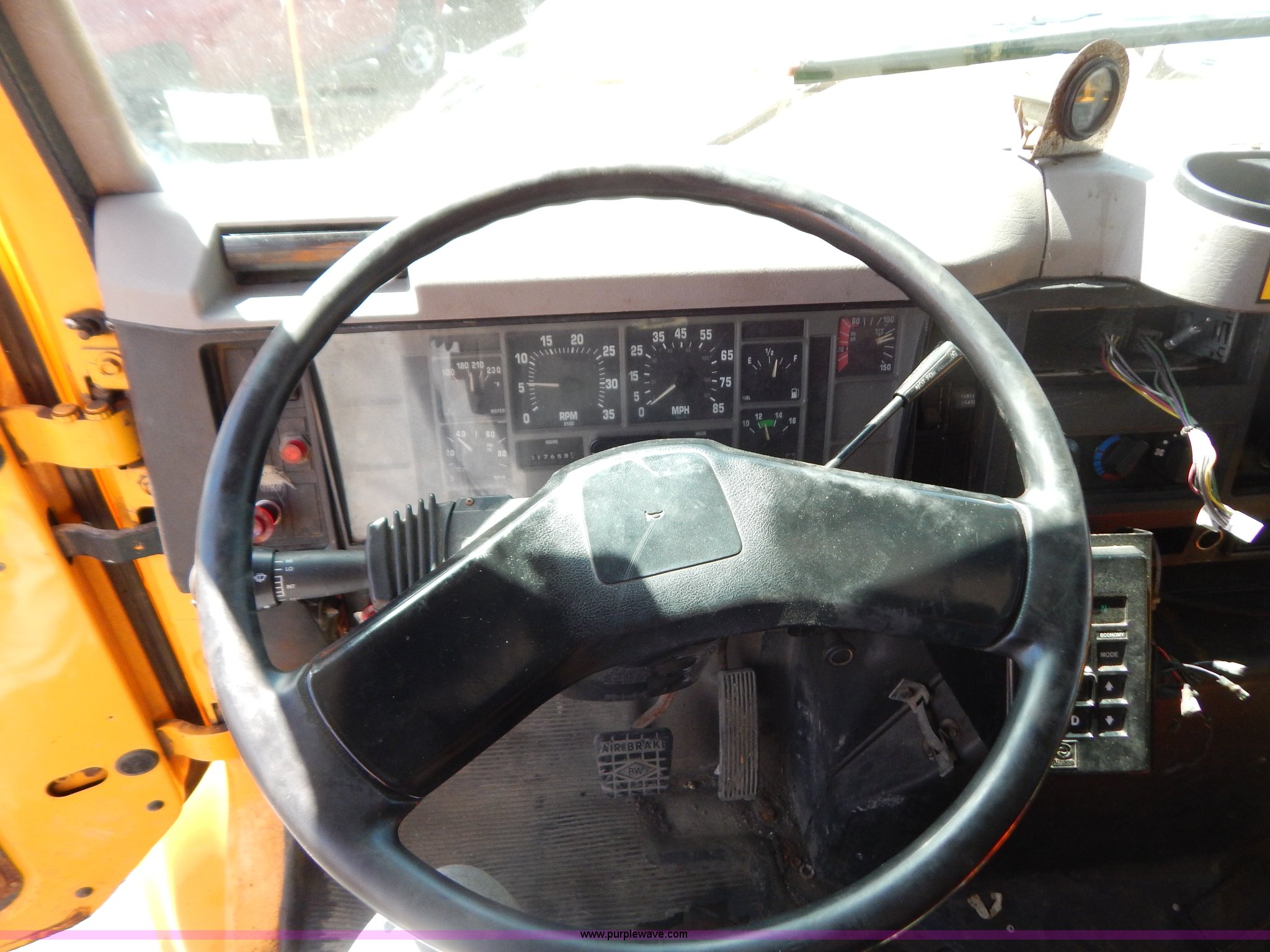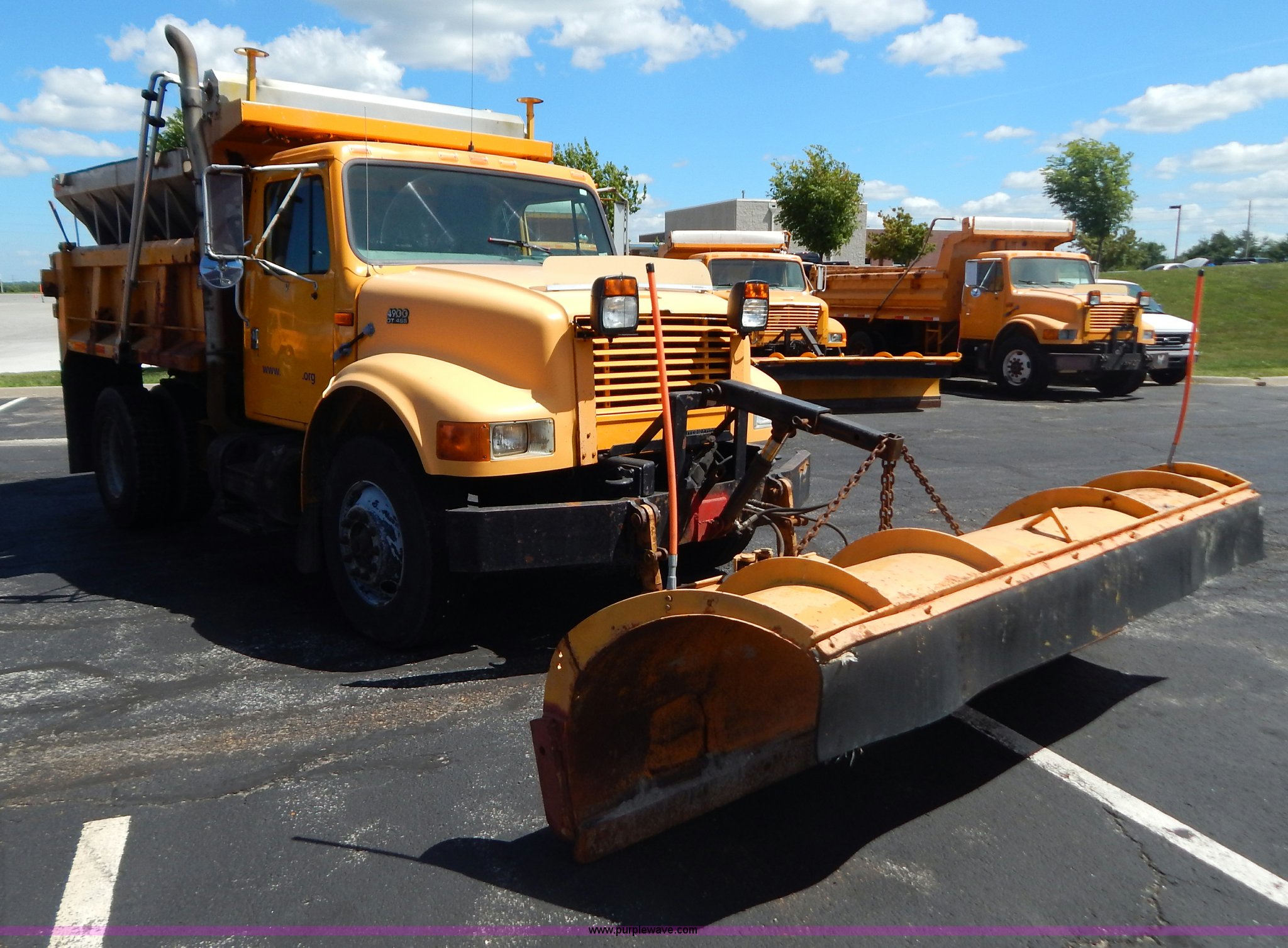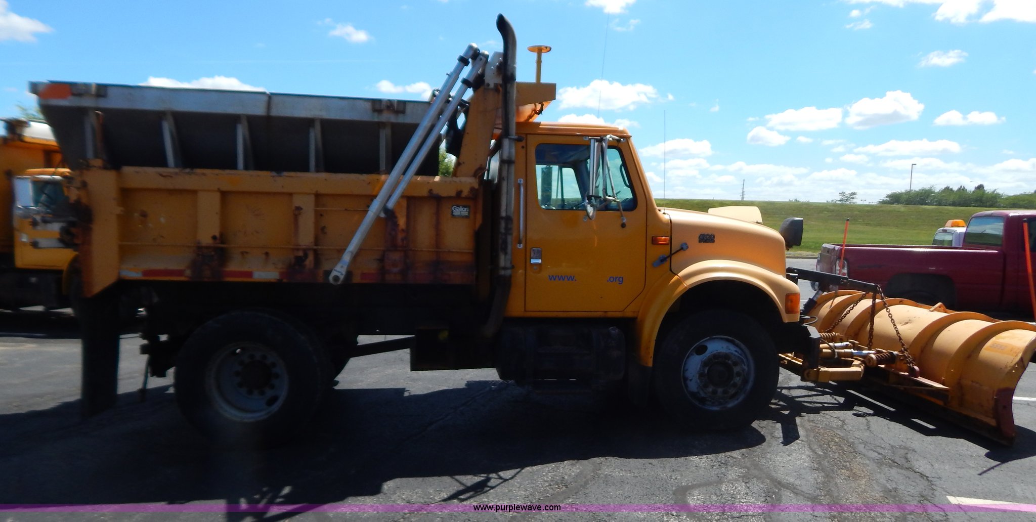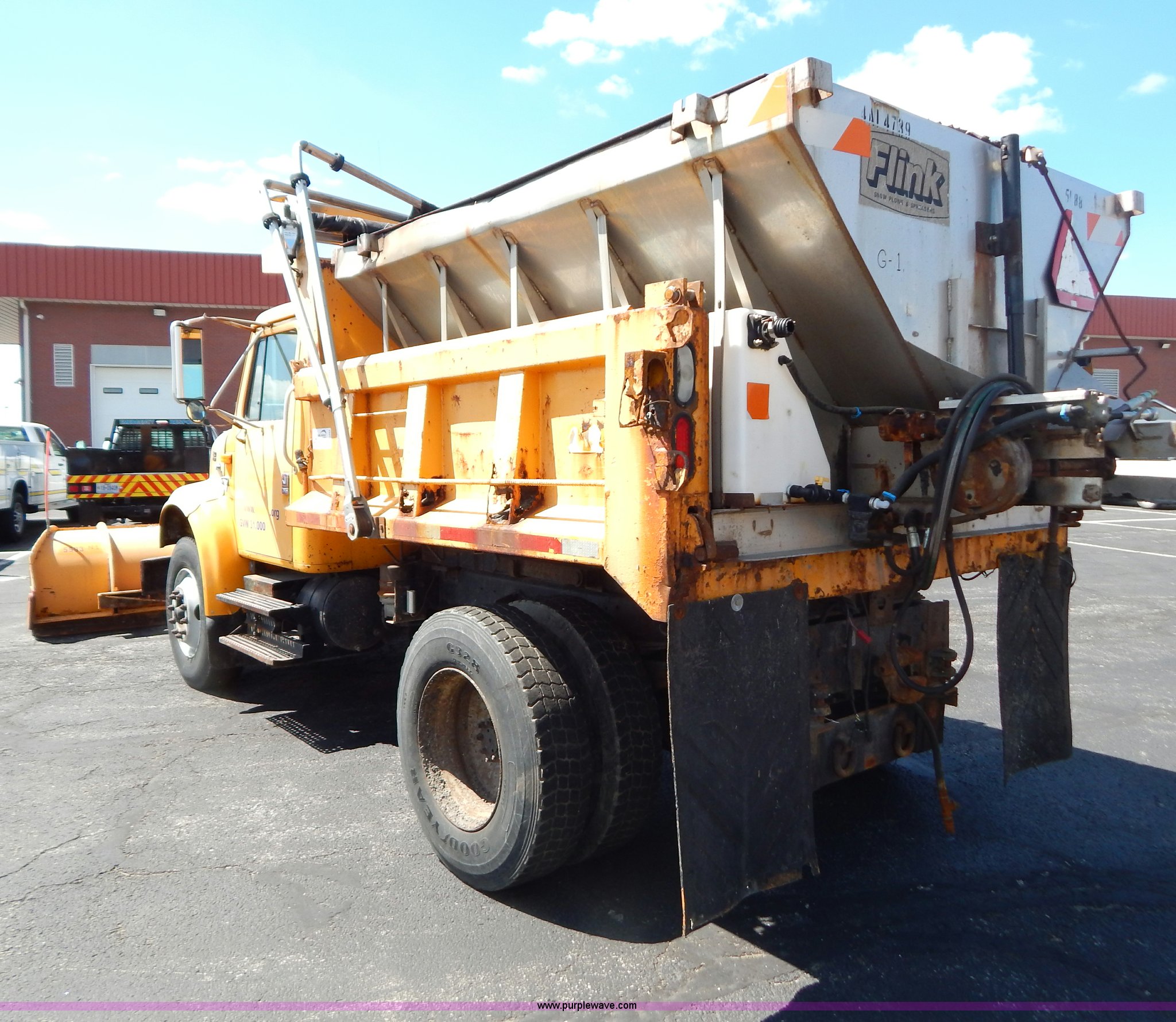 Purple Wave is selling a used Construction Dump Truck in Missouri. This item is a 1997 International 4900 dump truck with the following: 156,504 miles on odometer, 17,658 hours on meter, International DT466 7.6L L6 diesel engine, Allison automatic transmission, Heat, Heated mirrors, Manual windows and locks, Trailer brake controller, 9'L x 8'W x 24"H dump bed, Flink stainless steel salt spreader, Hydraulic driven, Calcium tanks, Lower spreader missing, 11'W snow plow, Smooth bolt-on cutting edge, Plow lights, Four way pivot, Break-away springs, Front mounted PTO, Trailer wiring, Pintle hitch, Air brakes, 140" wheelbase, 11R22.5 tires, Battery dead, Engine leaks oil, Pinion bearing needs replaced, Power steering leaks, Transmission leaks, Bed rusted, MoDOT ID 5593