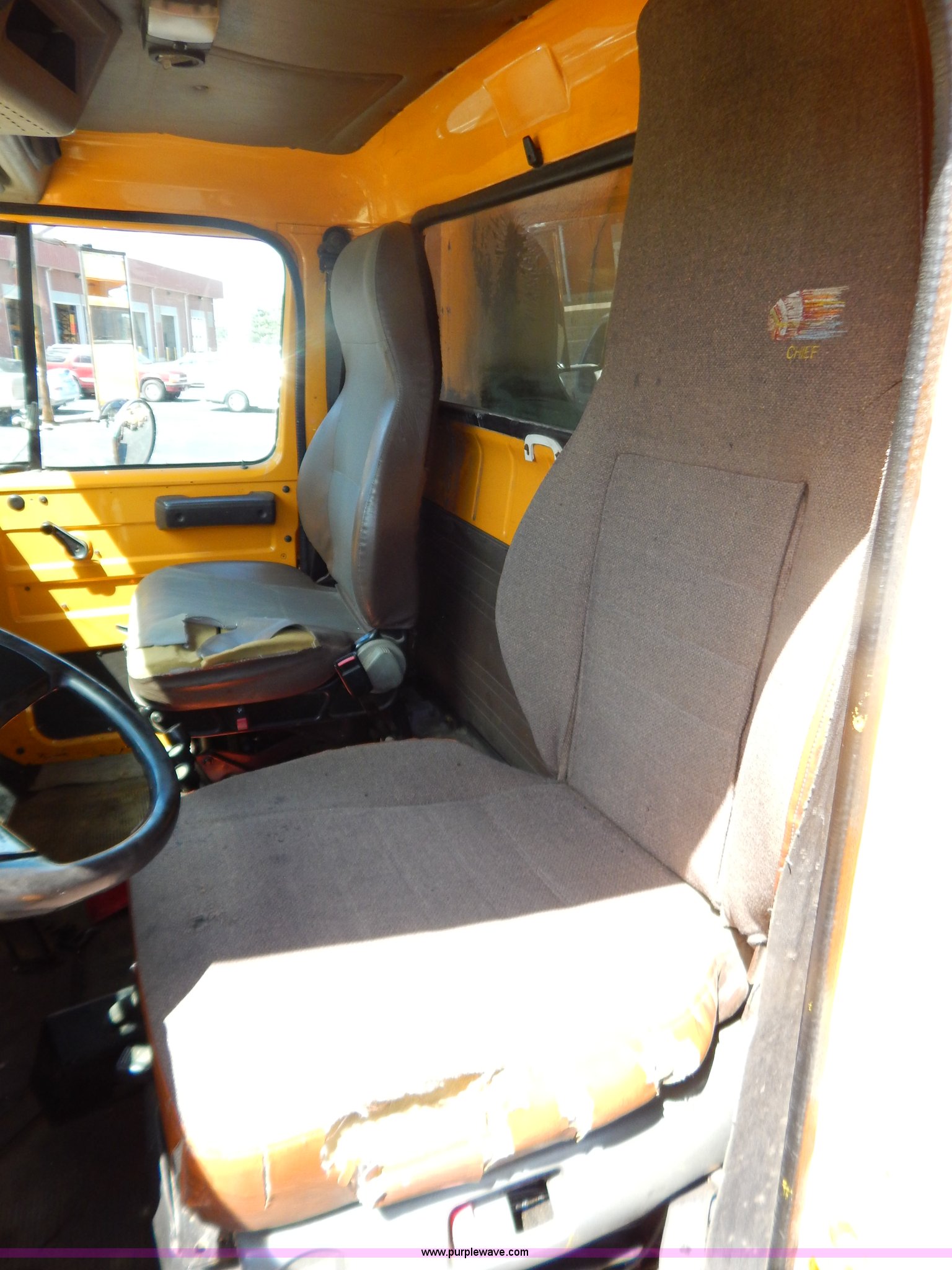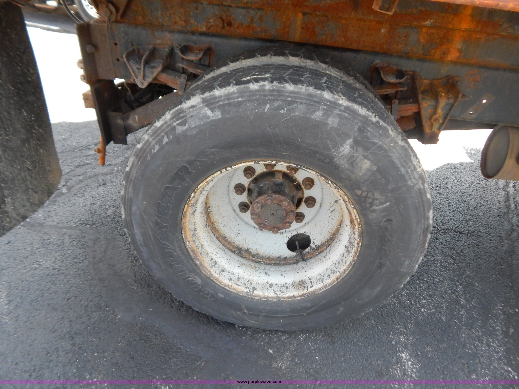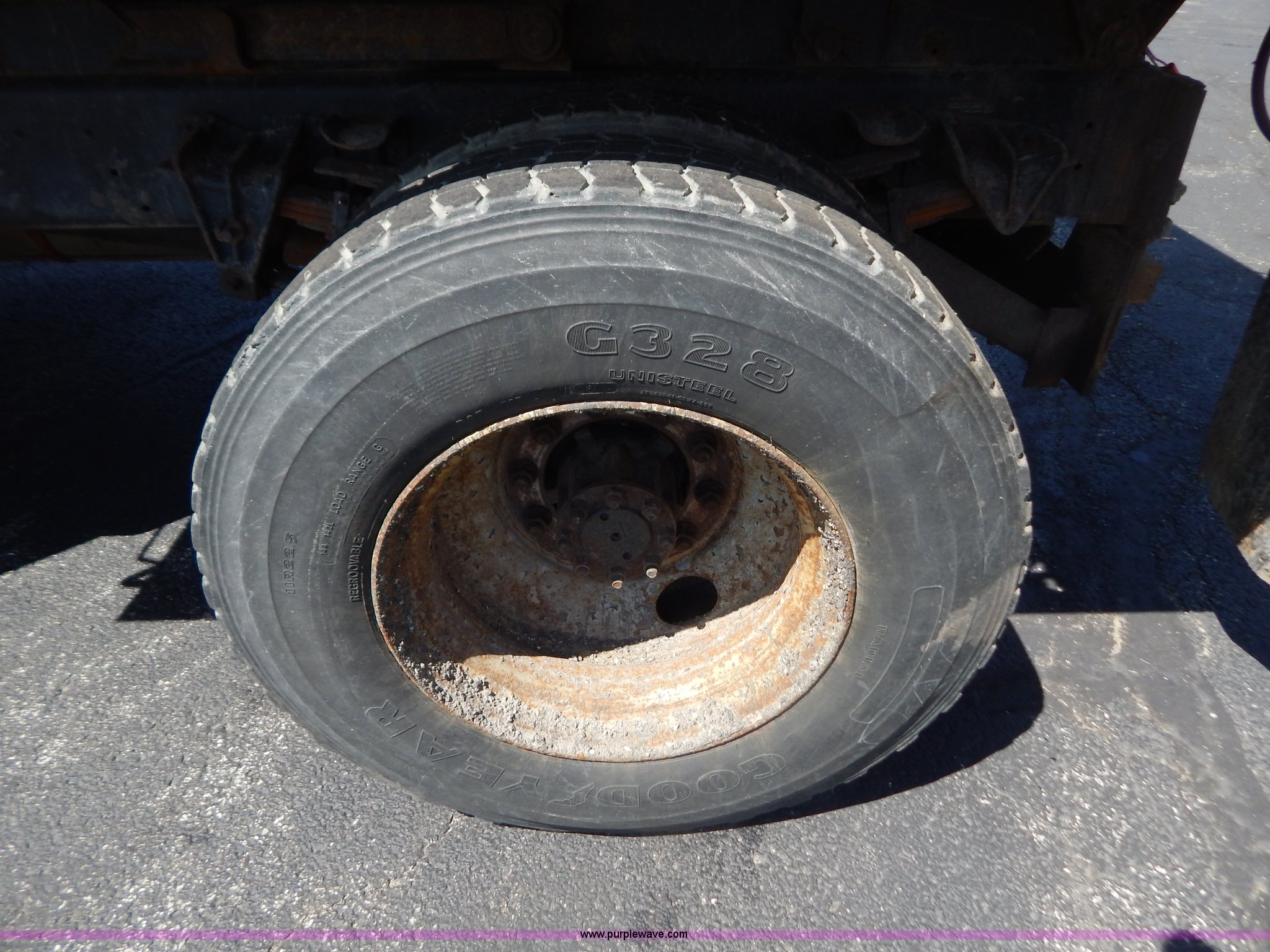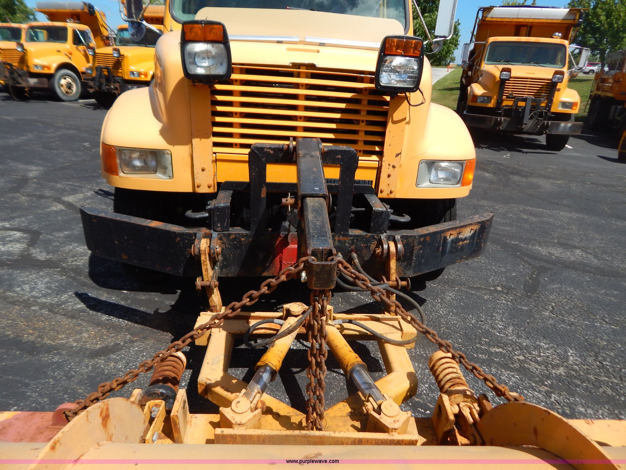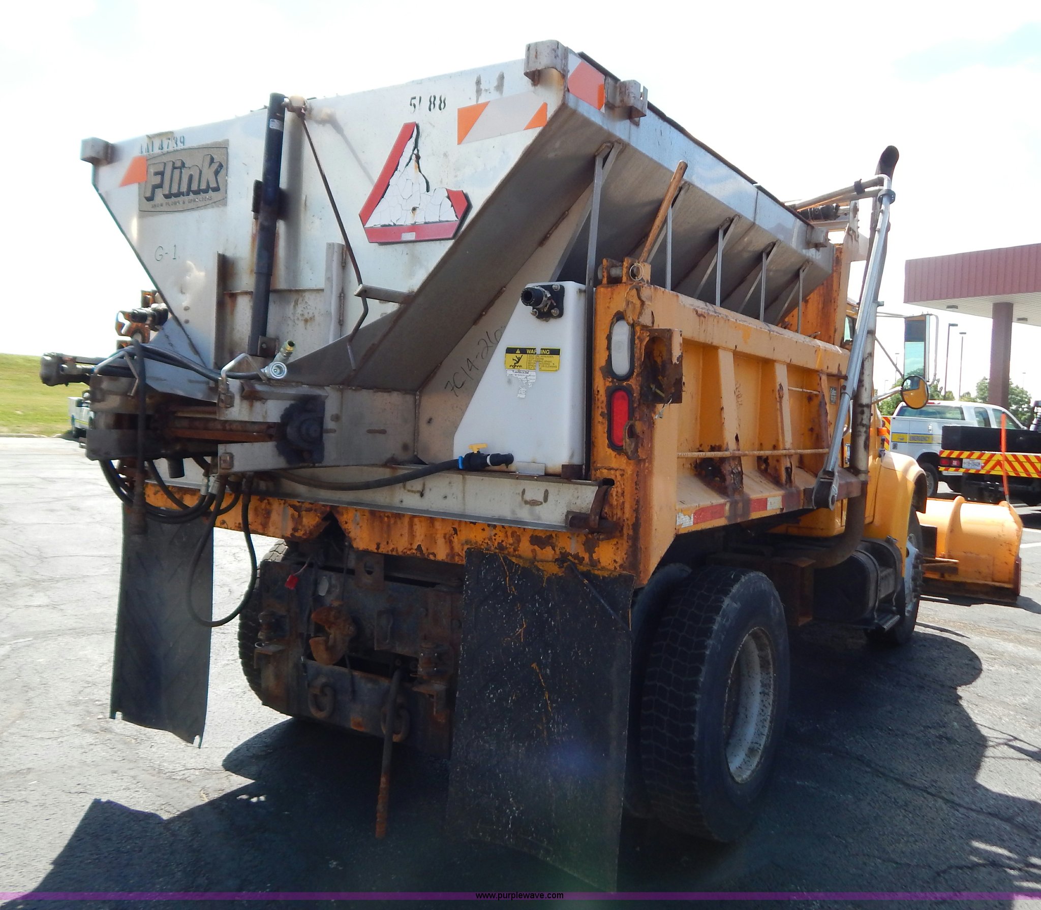Purple Wave is selling a used Construction Dump Truck in Missouri. This item is a 1997 International 4900 dump truck with the following: 156,504 miles on odometer, 17,658 hours on meter, International DT466 7.6L L6 diesel engine, Allison automatic transmission, Heat, Heated mirrors, Manual windows and locks, Trailer brake controller, 9'L x 8'W x 24"H dump bed, Flink stainless steel salt spreader, Hydraulic driven, Calcium tanks, Lower spreader missing, 11'W snow plow, Smooth bolt-on cutting edge, Plow lights, Four way pivot, Break-away springs, Front mounted PTO, Trailer wiring, Pintle hitch, Air brakes, 140" wheelbase, 11R22.5 tires, Battery dead, Engine leaks oil, Pinion bearing needs replaced, Power steering leaks, Transmission leaks, Bed rusted, MoDOT ID 5593