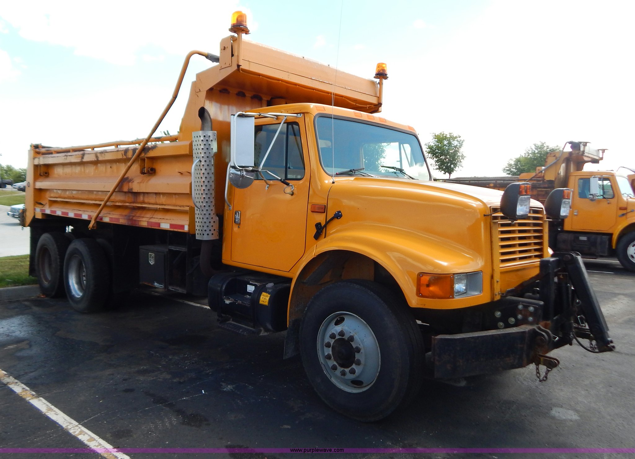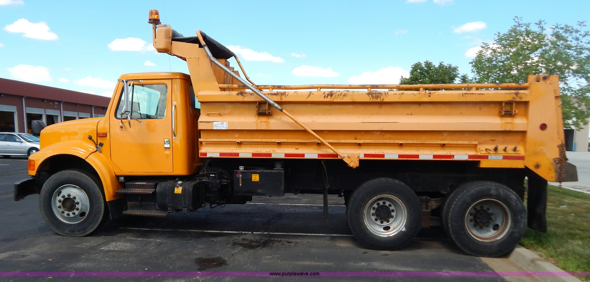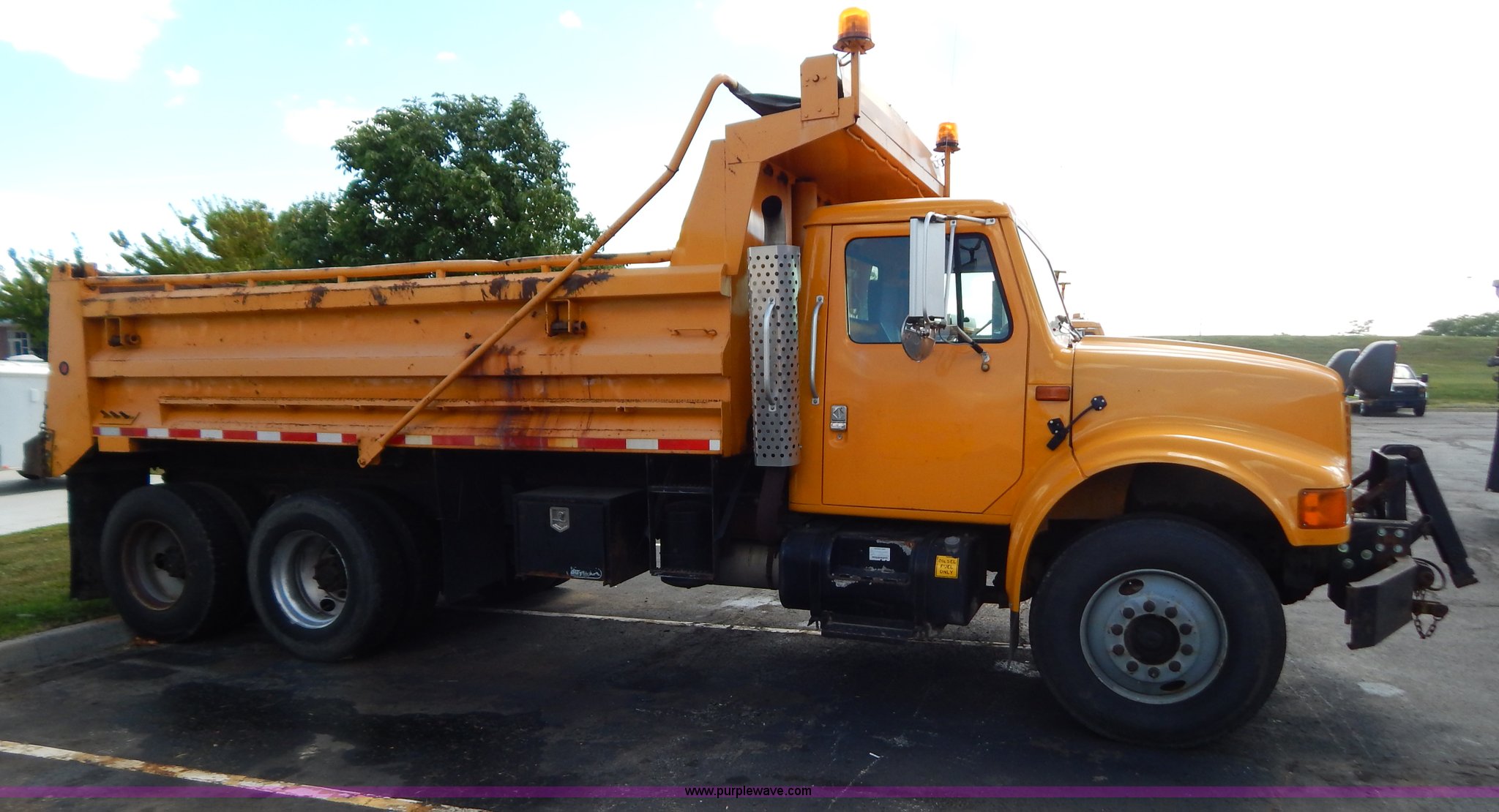 Purple Wave is selling a used Construction Dump Truck in Missouri. This item is a 1998 International 4900 tandem axle dump truck with the following: 134,448 miles on odometer, 8,942 hours on meter, International DT530 8.7L L6 diesel engine, Eaton Fuller manual transmission, Heat, Cruise, AM/FM/cassette, Heated mirrors, Manual windows and locks, Front mounted PTO, 16'L x 8'W x 32"H dump bed, Front snow plow hydraulic hook ups, Rear spreader hydraulic hook ups, Air brakes, 206" wheelbase, 11R22.5 tires, Interior/exterior cosmetic damage, Minor engine oil leaks, MoDOT ID 5704