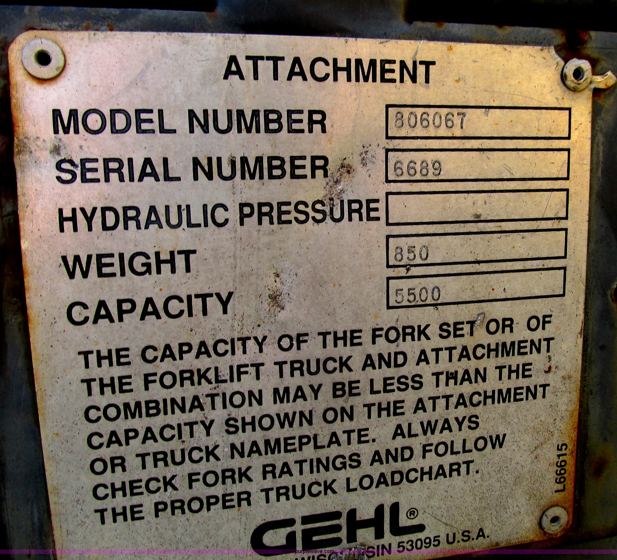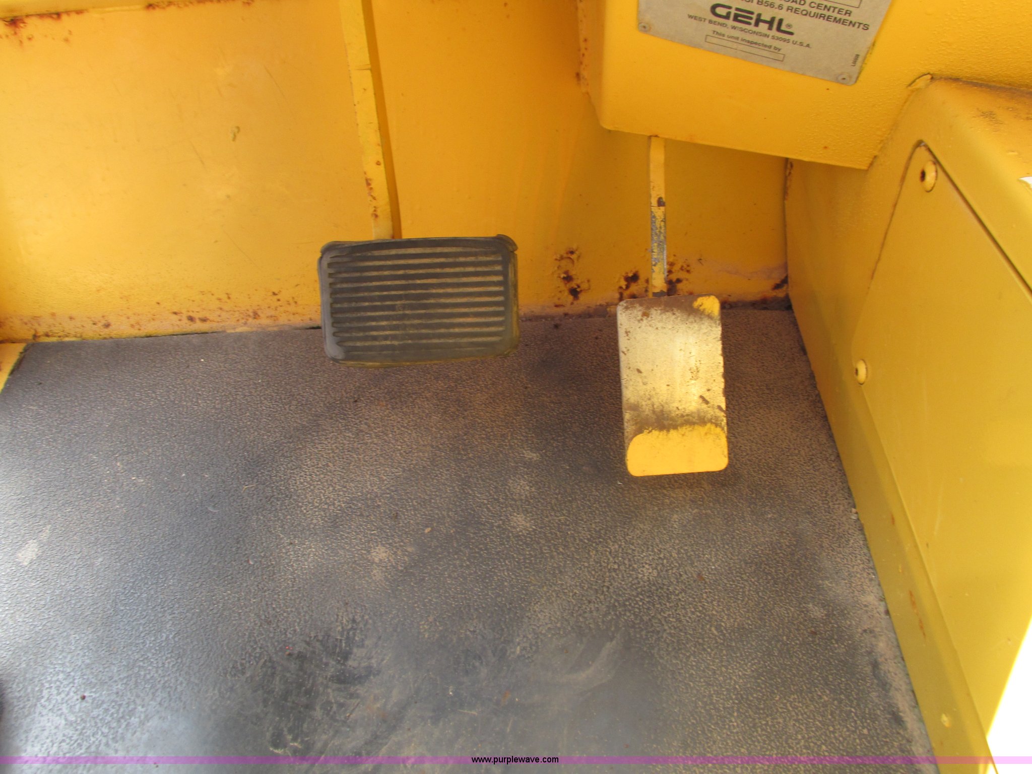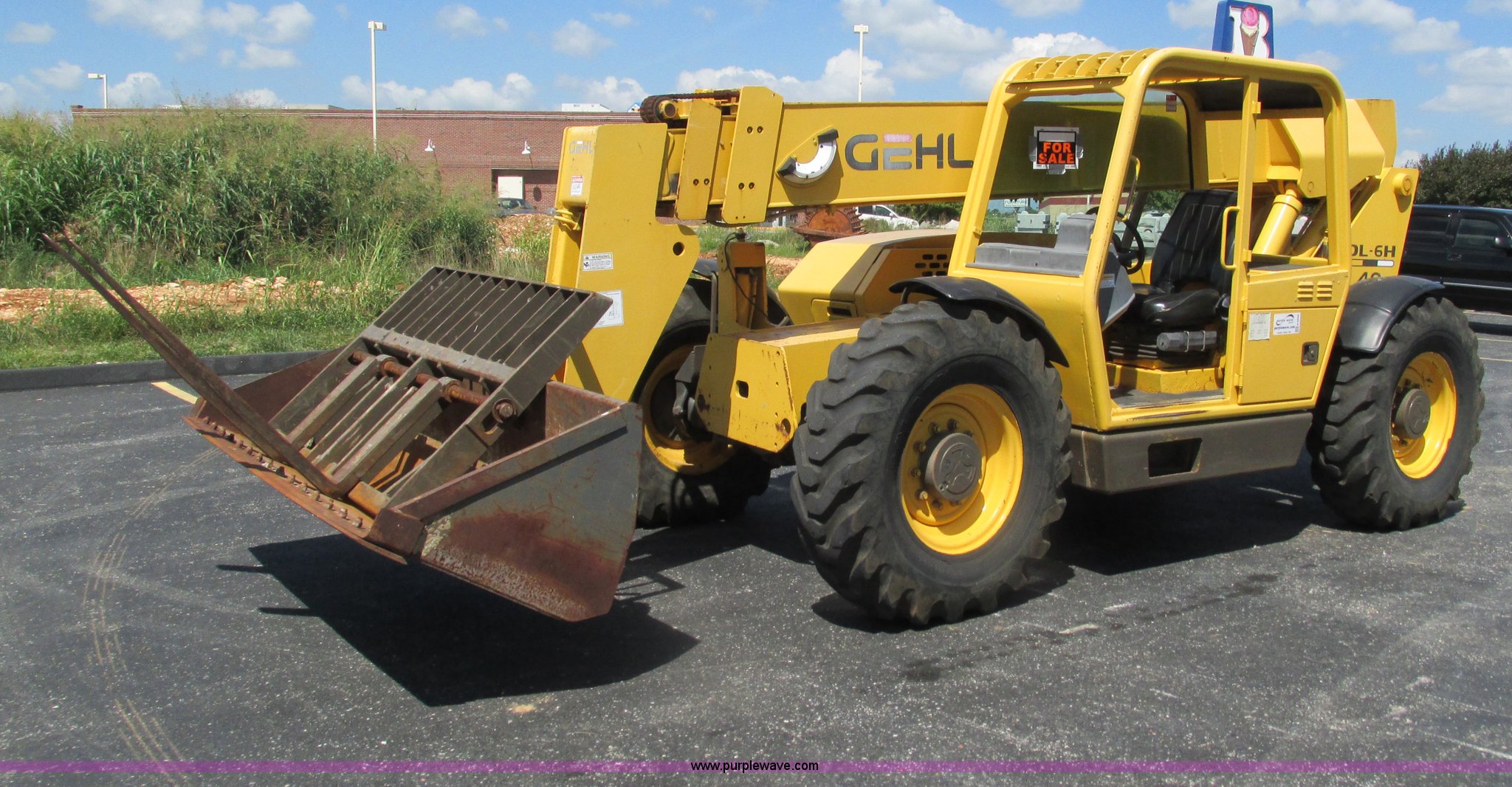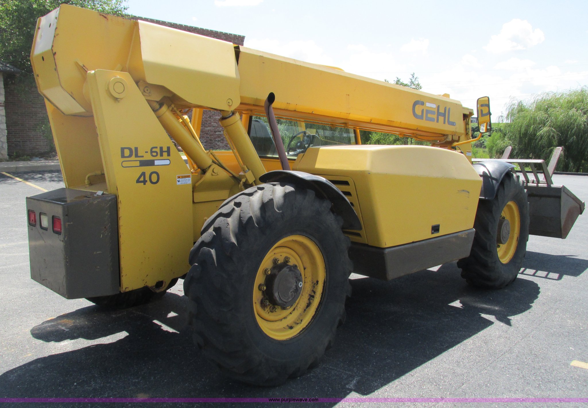 Purple Wave is selling a used Telehandler in Missouri. This item is a Gehl DL6H telehandler with the following: 1,116 hours on meter, John Deere 2115F 4.5L four cylinder diesel engine, Serial T040451798668, Powershift transmission, 4F-1R gears, Four wheel drive, Crab and circle steer, ROPS, Spring seat, Single joystick control, Tilt steering wheel, 6,000 lbs lift capacity, 40'L reach, (3) boom sections, 48"L forks, Manual hydraulic leveling, Manual quick attach, Gehl 8'W bucket, Bolt-on cutting edge, 850 lbs, Serial 6689, Fenders, 14x24 tires, 23,050 lbs. base operating weight, Front end rebuilt two years ago, Front brakes and seals replaced two year ago, Approx. 200 hours ago, Torn seat, Rust damage, Left rear wheel seal leaks, Serial 6H40JQ0320328