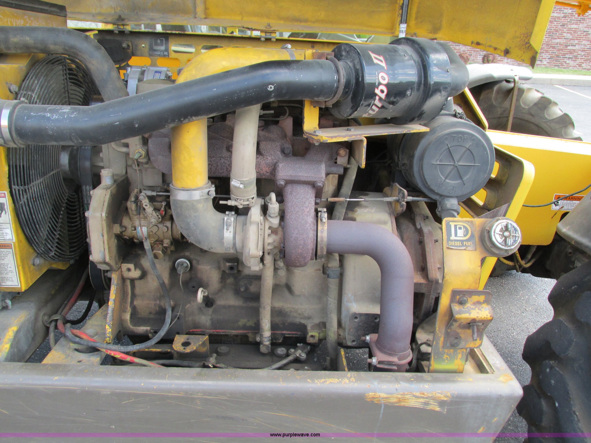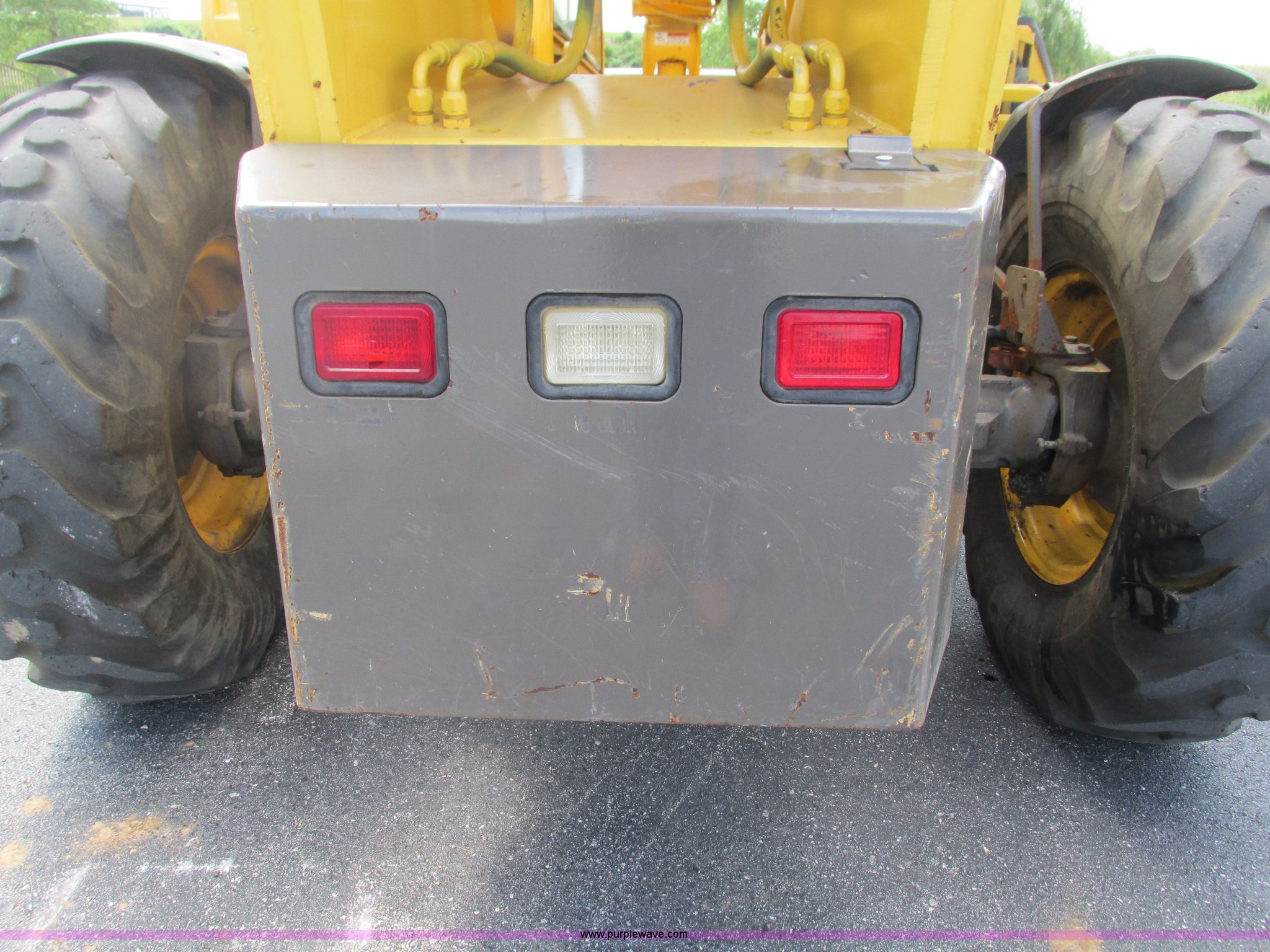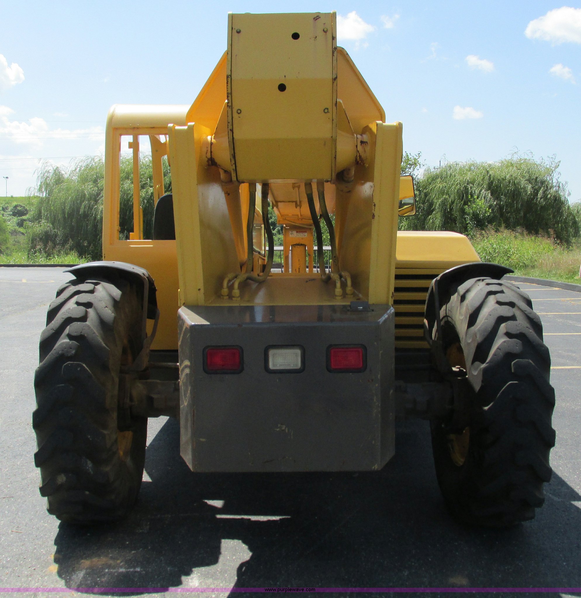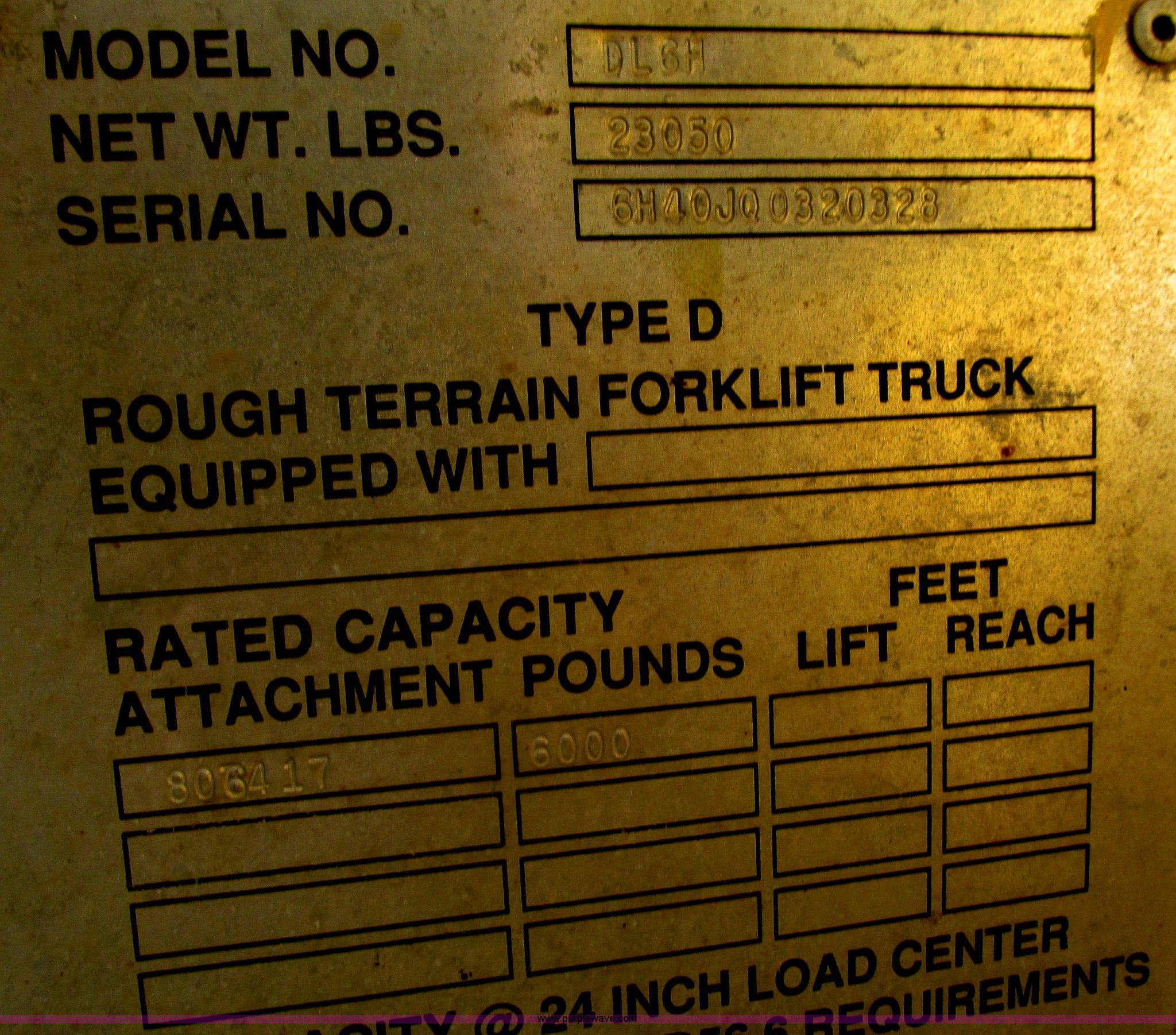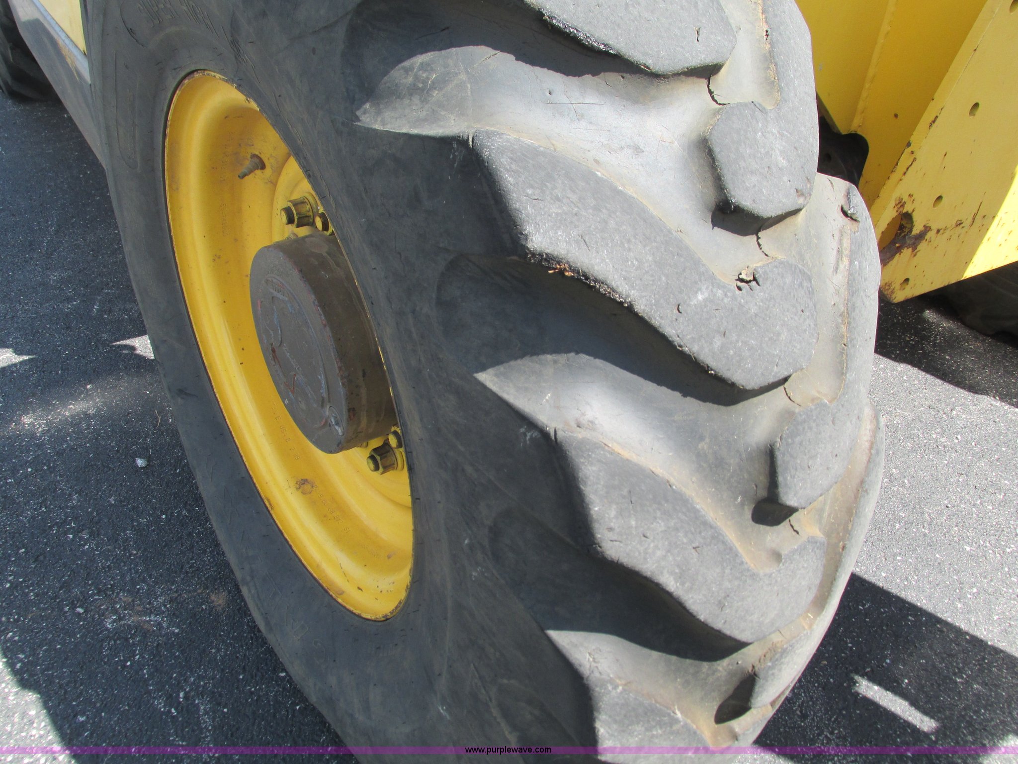 Purple Wave is selling a used Telehandler in Missouri. This item is a Gehl DL6H telehandler with the following: 1,116 hours on meter, John Deere 2115F 4.5L four cylinder diesel engine, Serial T040451798668, Powershift transmission, 4F-1R gears, Four wheel drive, Crab and circle steer, ROPS, Spring seat, Single joystick control, Tilt steering wheel, 6,000 lbs lift capacity, 40'L reach, (3) boom sections, 48"L forks, Manual hydraulic leveling, Manual quick attach, Gehl 8'W bucket, Bolt-on cutting edge, 850 lbs, Serial 6689, Fenders, 14x24 tires, 23,050 lbs. base operating weight, Front end rebuilt two years ago, Front brakes and seals replaced two year ago, Approx. 200 hours ago, Torn seat, Rust damage, Left rear wheel seal leaks, Serial 6H40JQ0320328