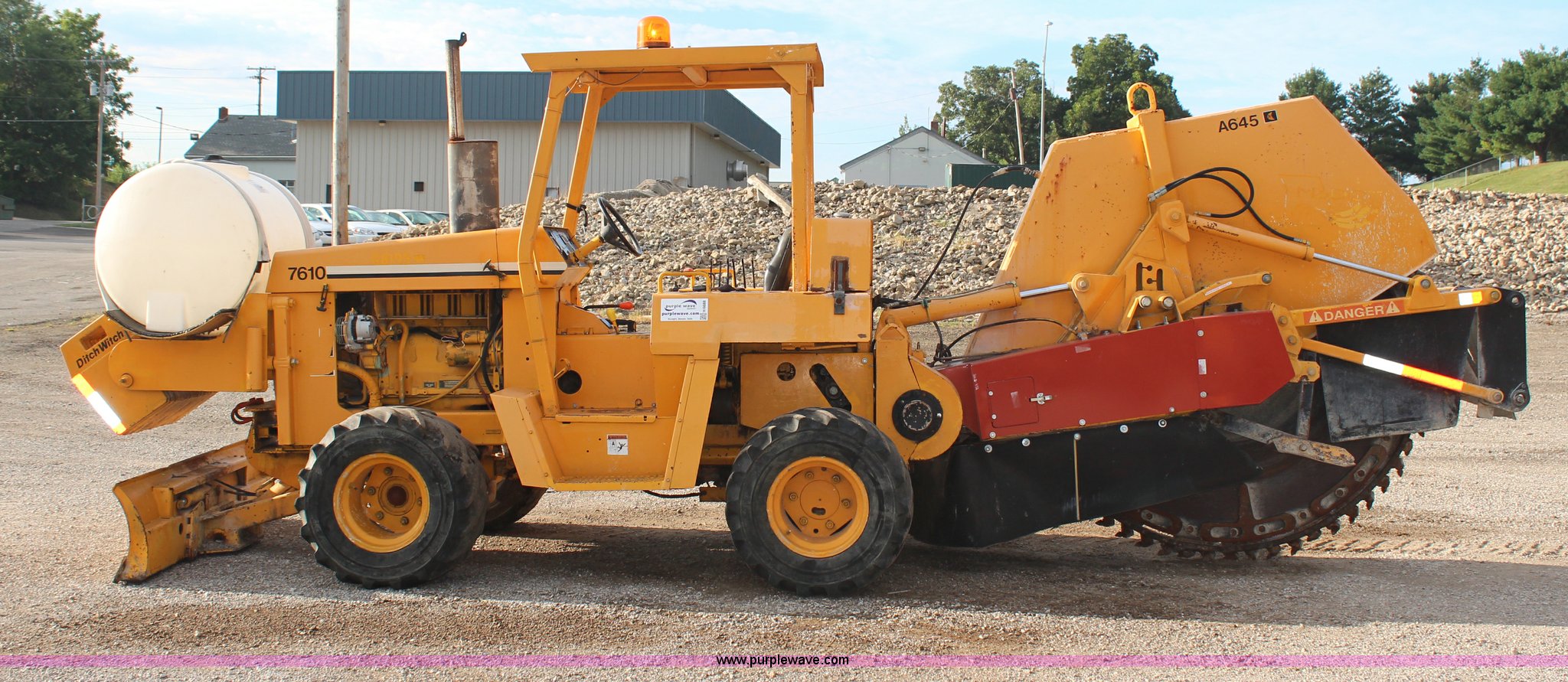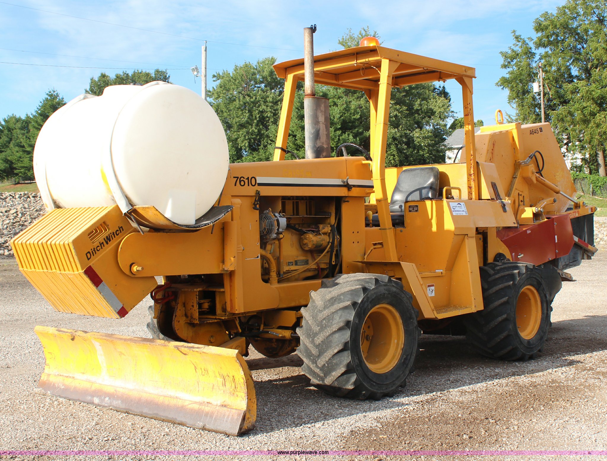 Purple Wave is selling a used Concrete Equip. or Acces. in Missouri. This item is a 1996 Ditch Witch 7610DD concrete wheel saw with the following: 1,720 hours on meter, Deutz four cylinder diesel engine, 73 HP, Four speed transmission, Four wheel drive, 72" blade, (15) counter weights, A645 concrete saw, Serial 2N1238, 110 gallon water tank, Segments have been recently rebuilt, Recently replaced teeth, Two saw gear boxes leak oil, Serial 5N0354