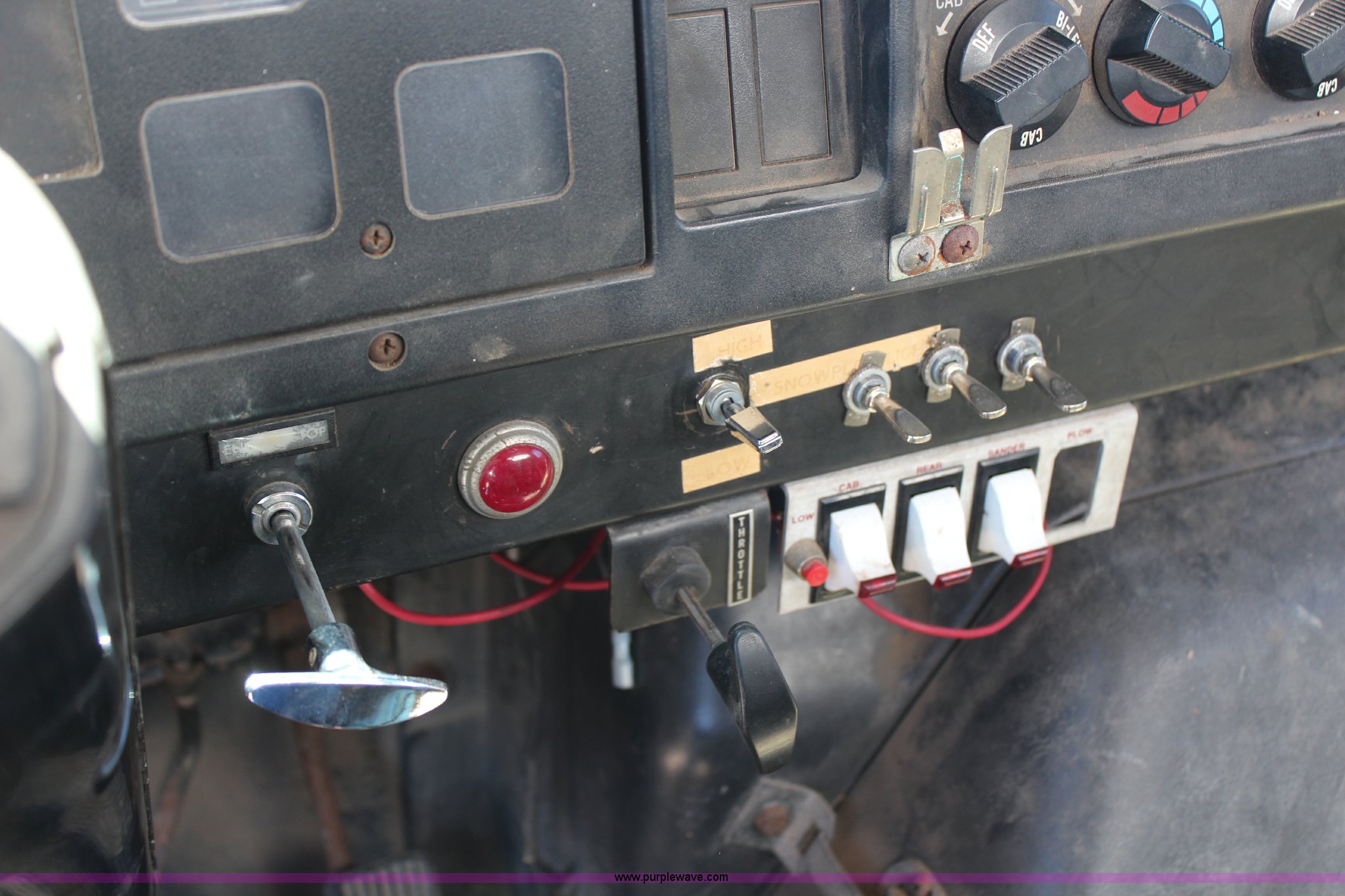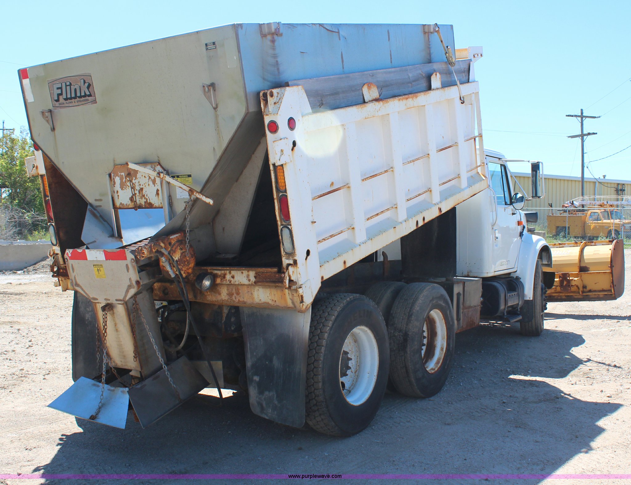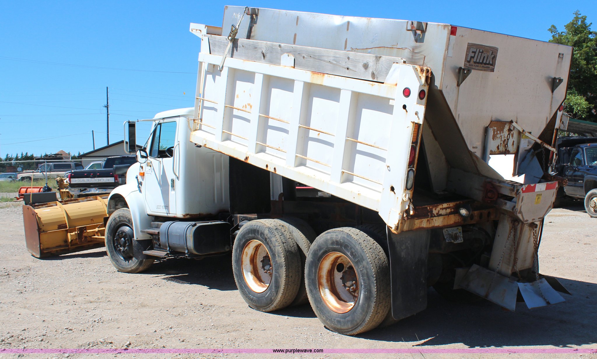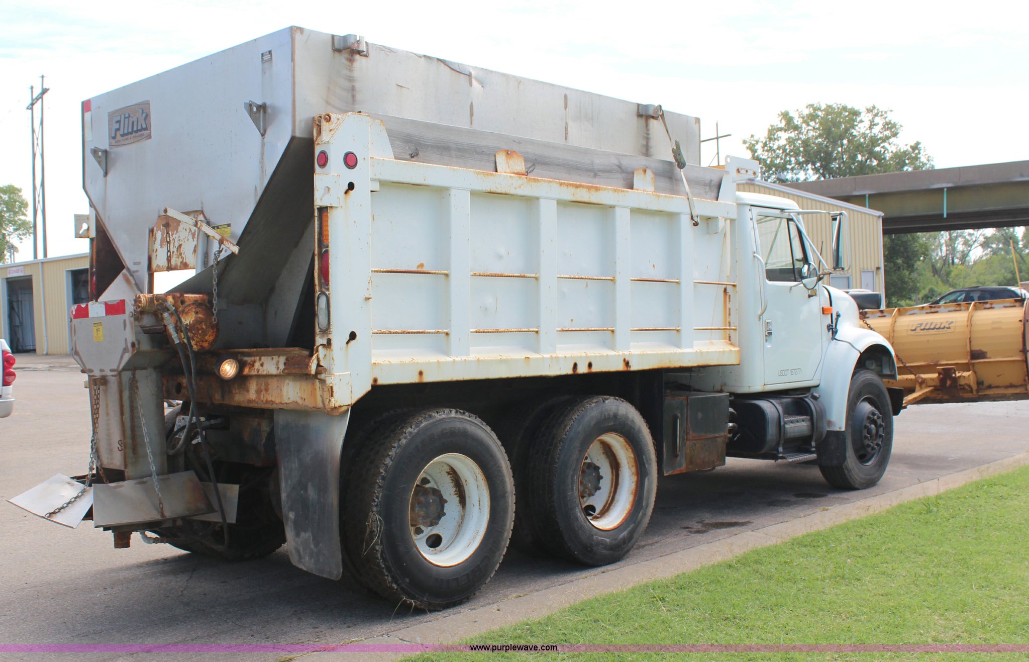 Purple Wave is selling a used Construction Dump Truck in Kansas. This item is a 1992 International 4900 semi truck with the following: 111,717 miles on odometer, 6,714 hours on meter, International DT466 7.6L L6 diesel engine, Eaton Fuller 10 speed manual transmission, Twin screw, Heat, Air suspension seat, Power and heated mirrors, 12' dump bed, Manual end gate, Single ram hoist, Tailgate included, Flink 11' plow, Flink 12' stainless steel spreader, Pintle hitch, PTO, Spring suspension, Air brakes, 170" wheelbase, 11R22.5 tires