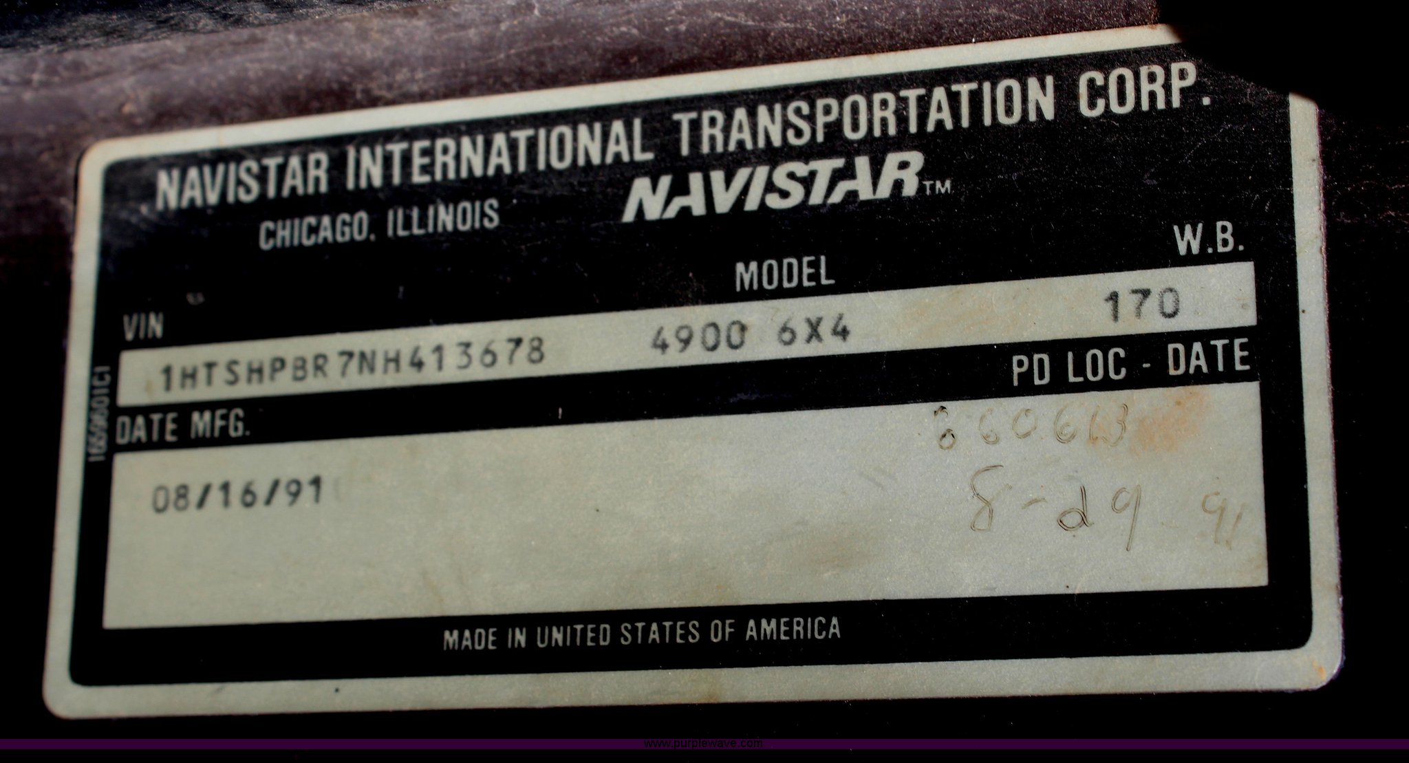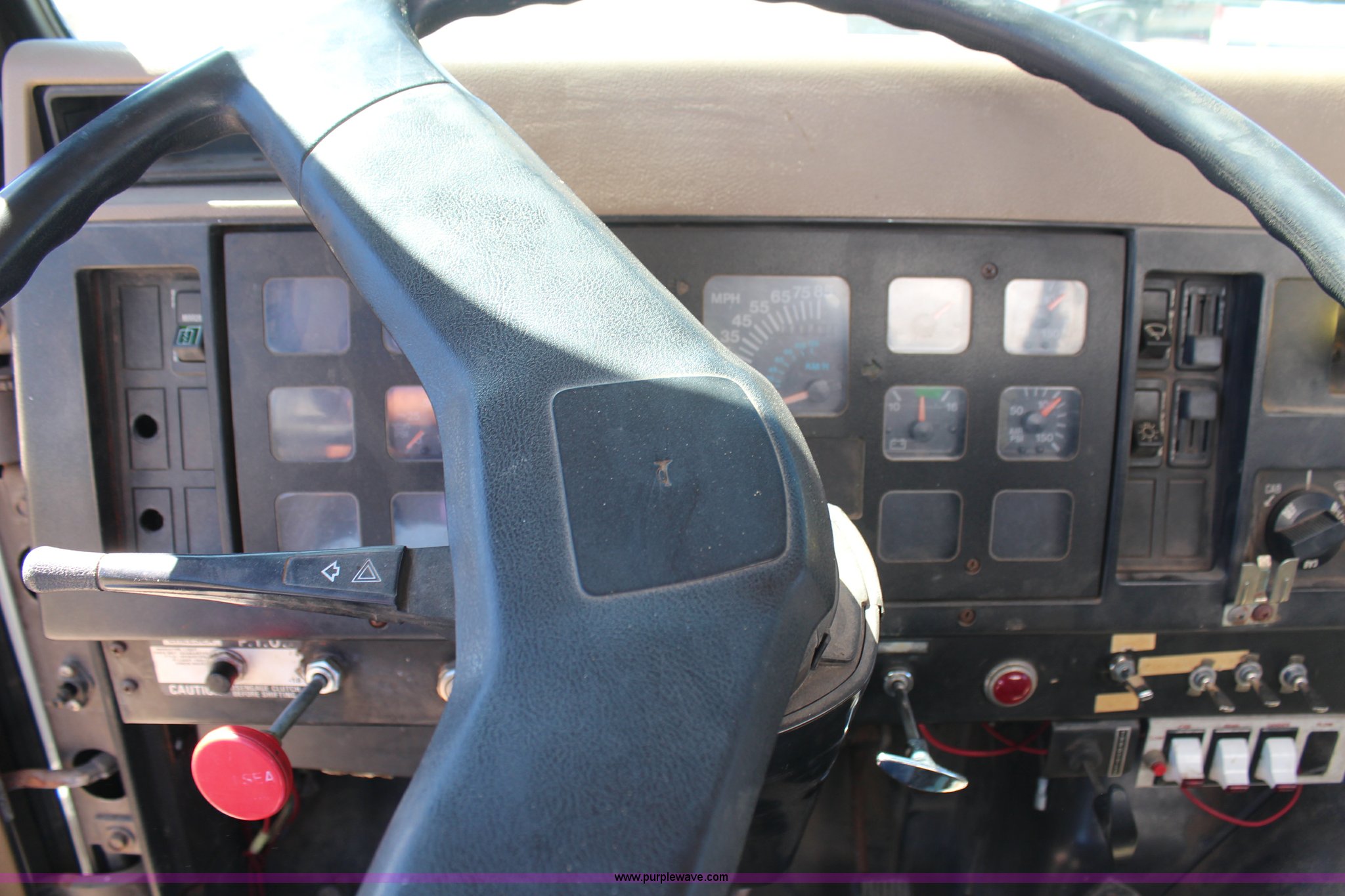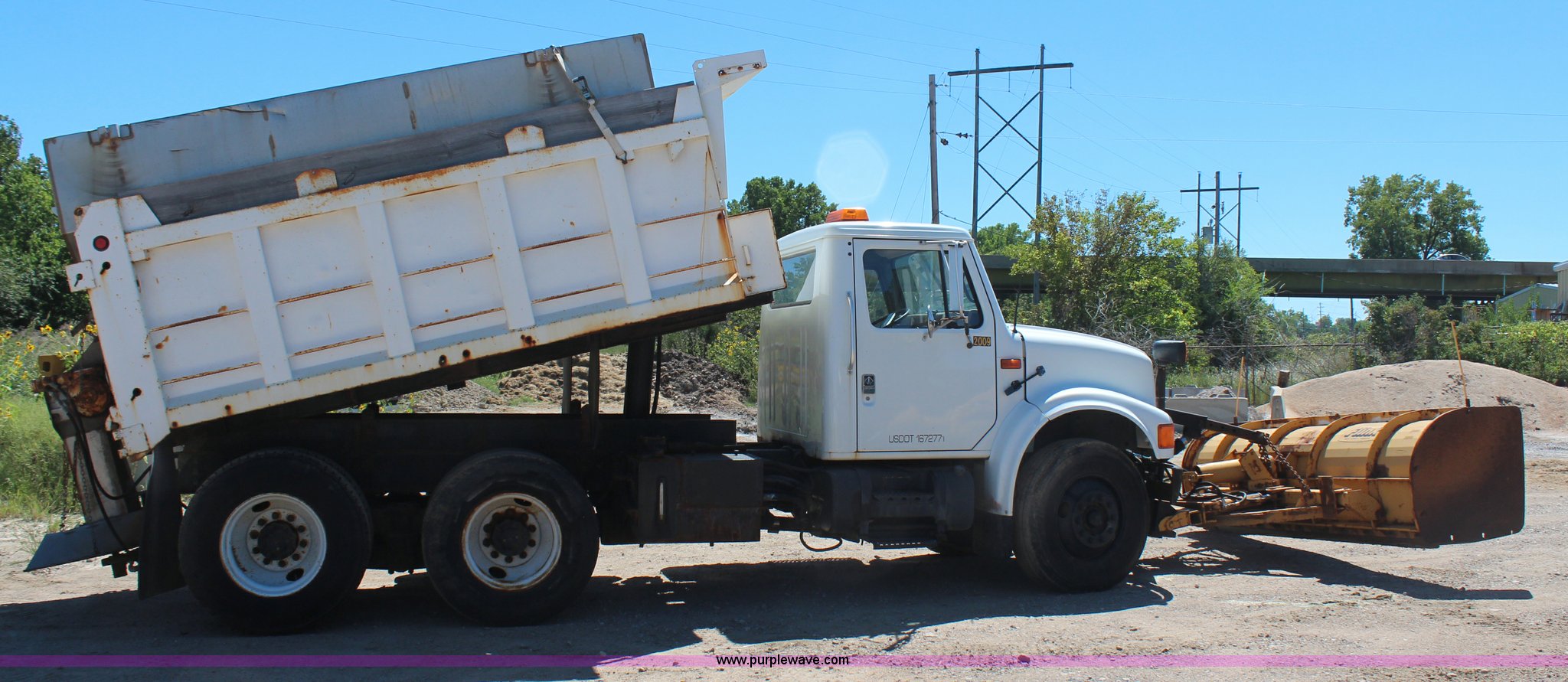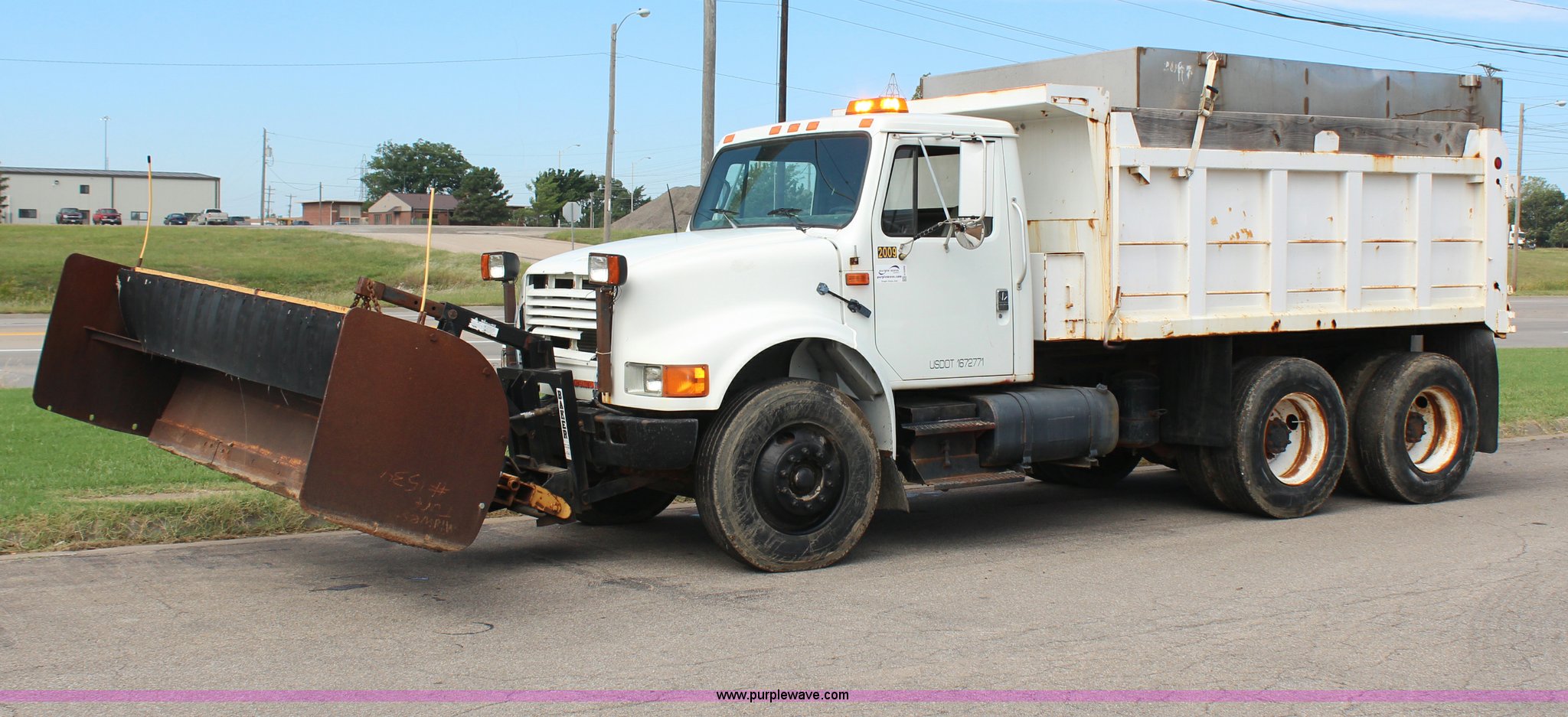 Purple Wave is selling a used Construction Dump Truck in Kansas. This item is a 1992 International 4900 semi truck with the following: 111,717 miles on odometer, 6,714 hours on meter, International DT466 7.6L L6 diesel engine, Eaton Fuller 10 speed manual transmission, Twin screw, Heat, Air suspension seat, Power and heated mirrors, 12' dump bed, Manual end gate, Single ram hoist, Tailgate included, Flink 11' plow, Flink 12' stainless steel spreader, Pintle hitch, PTO, Spring suspension, Air brakes, 170" wheelbase, 11R22.5 tires