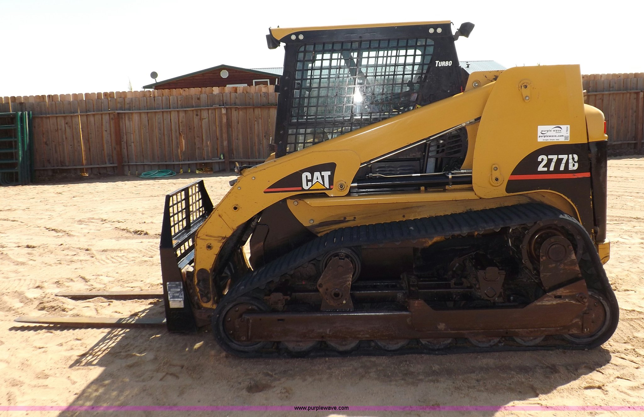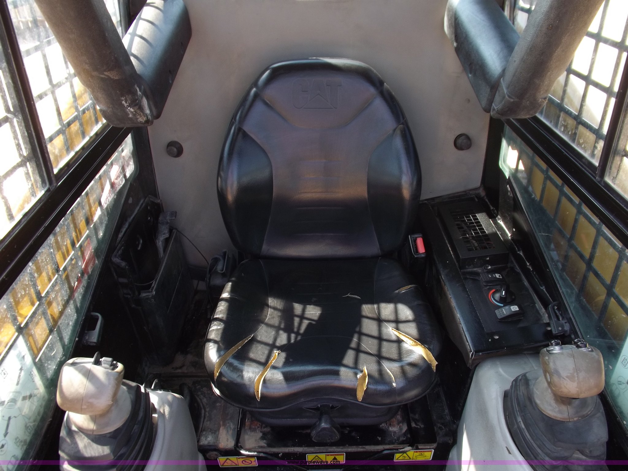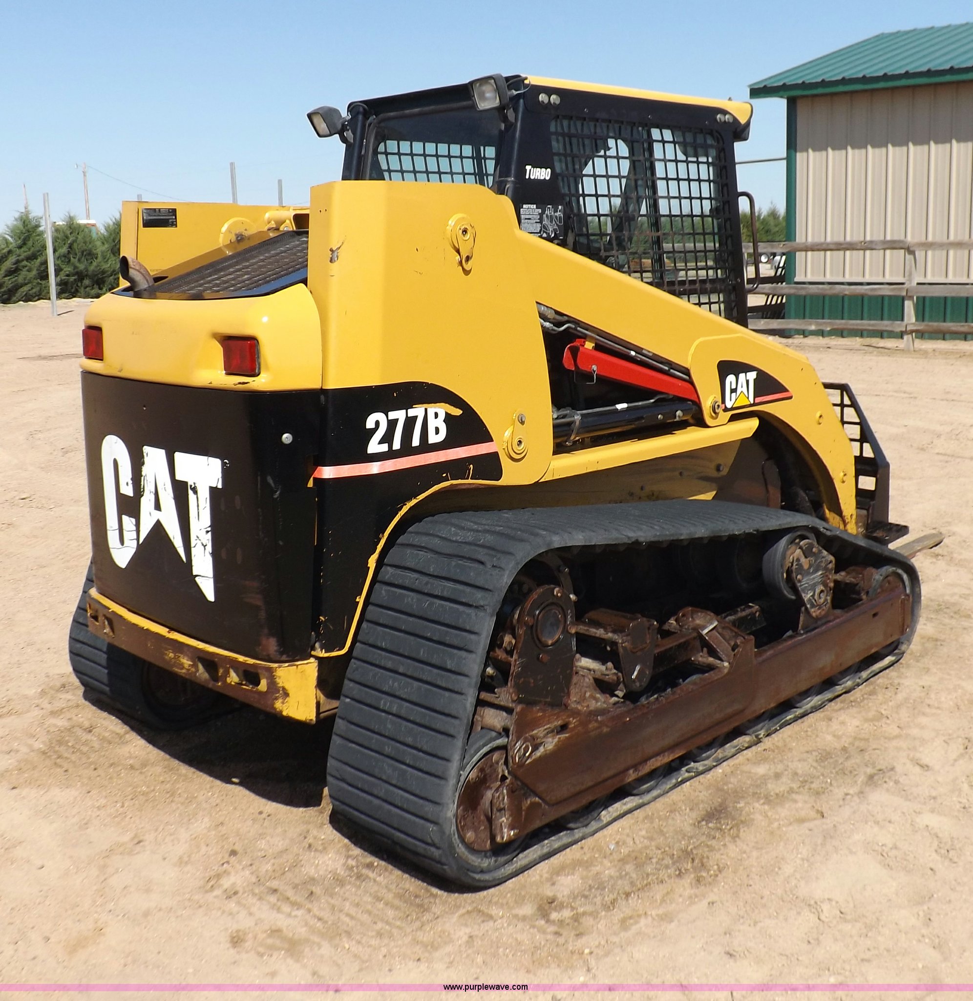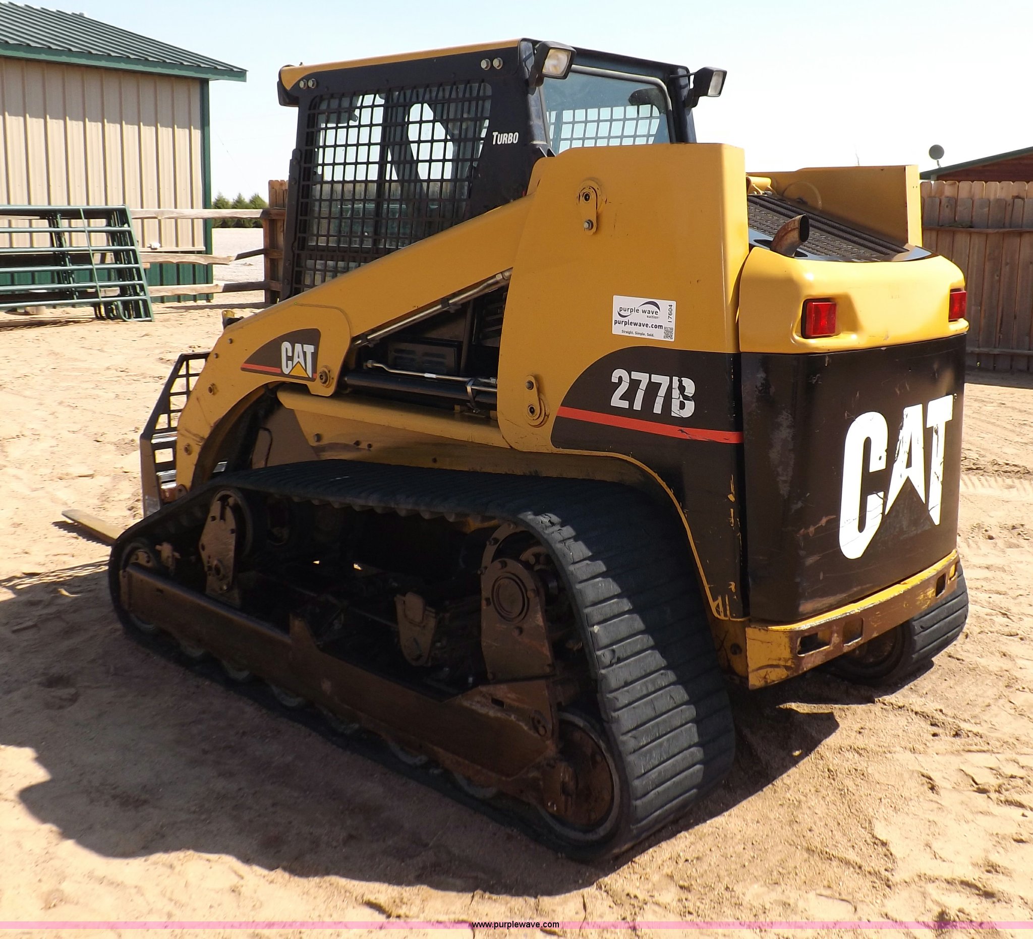 Purple Wave is selling a used Tracked Skid Steer Loader in Kansas. This item is a 2005 Caterpillar 277B track skid steer with the following: 2,912 hours on meter, Hour meter replaced at 1,569 hours, Caterpillar 3.3L four cylinder turbo diesel engine, 82 HP, Two speed transmission, Hand and foot throttle, Enclosed cab, AC and heat, GP 6' bucket, Bolt-on cutting edge, 0.48 cu. y.d capacity, Caterpillar 48" forks, Auxiliary hydraulic and electrical couplers, Cab hydraulic attachment change, 3,800 lbs operating capacity, 5,200 lbs tip capacity, (6) bottom rollers, Rubber tracks, Front door with glass and windshield wiper will be installed, Serial CAT0277BCMDH02228