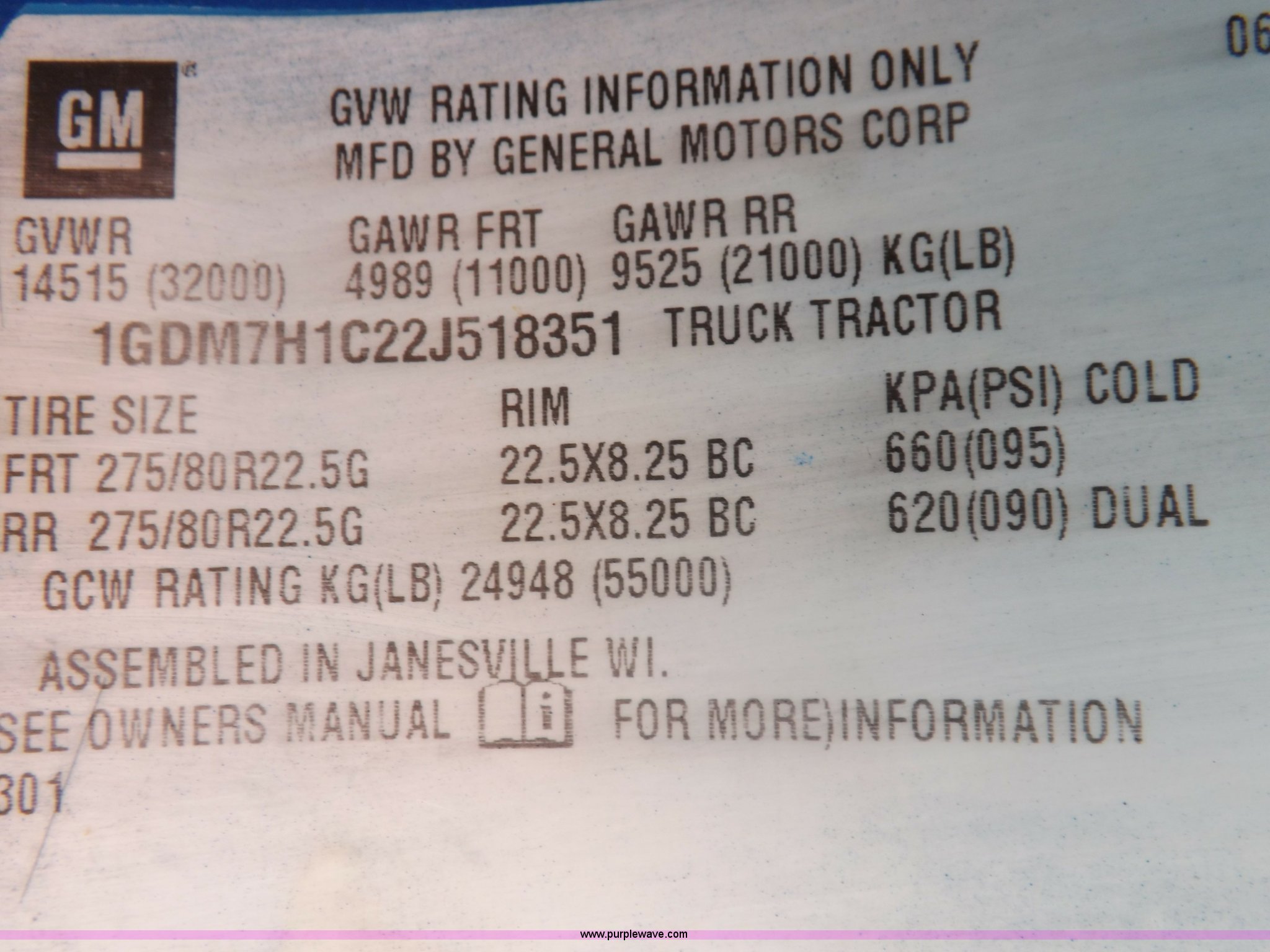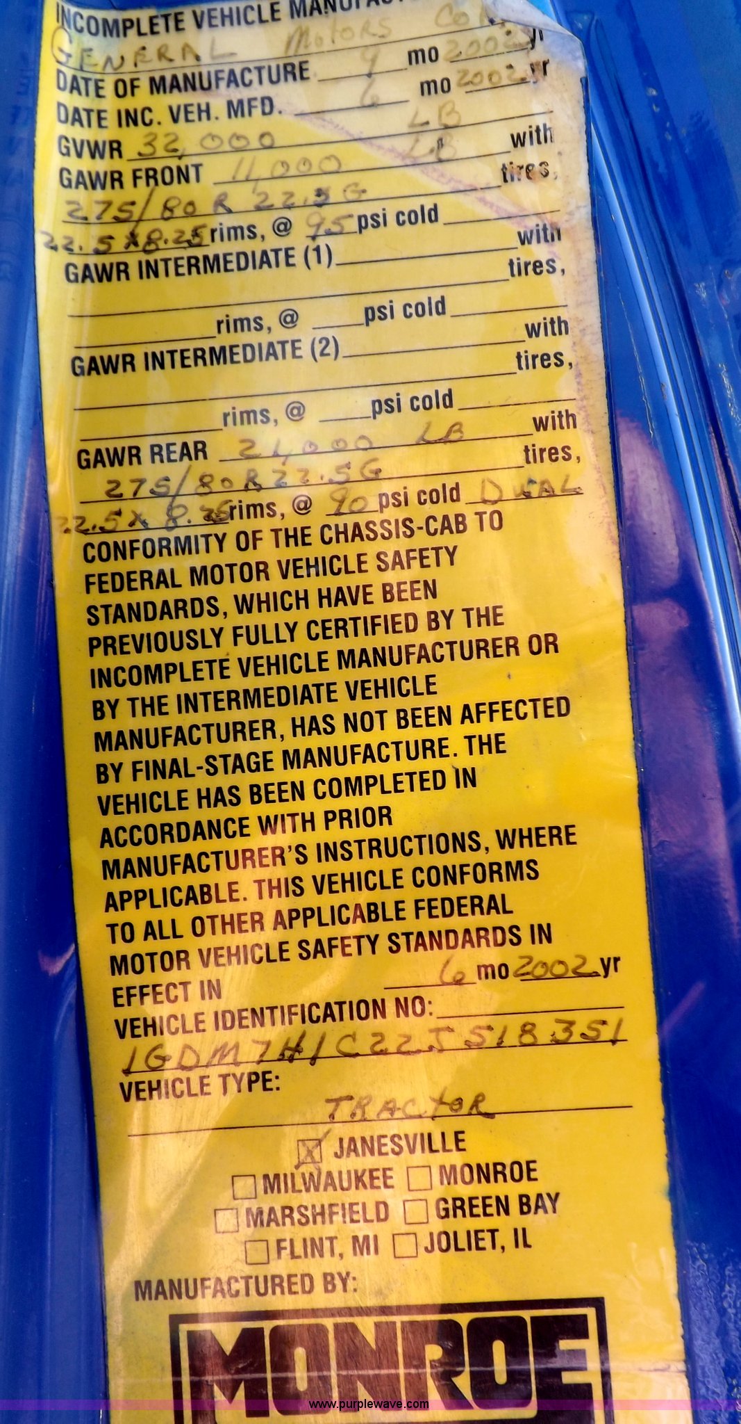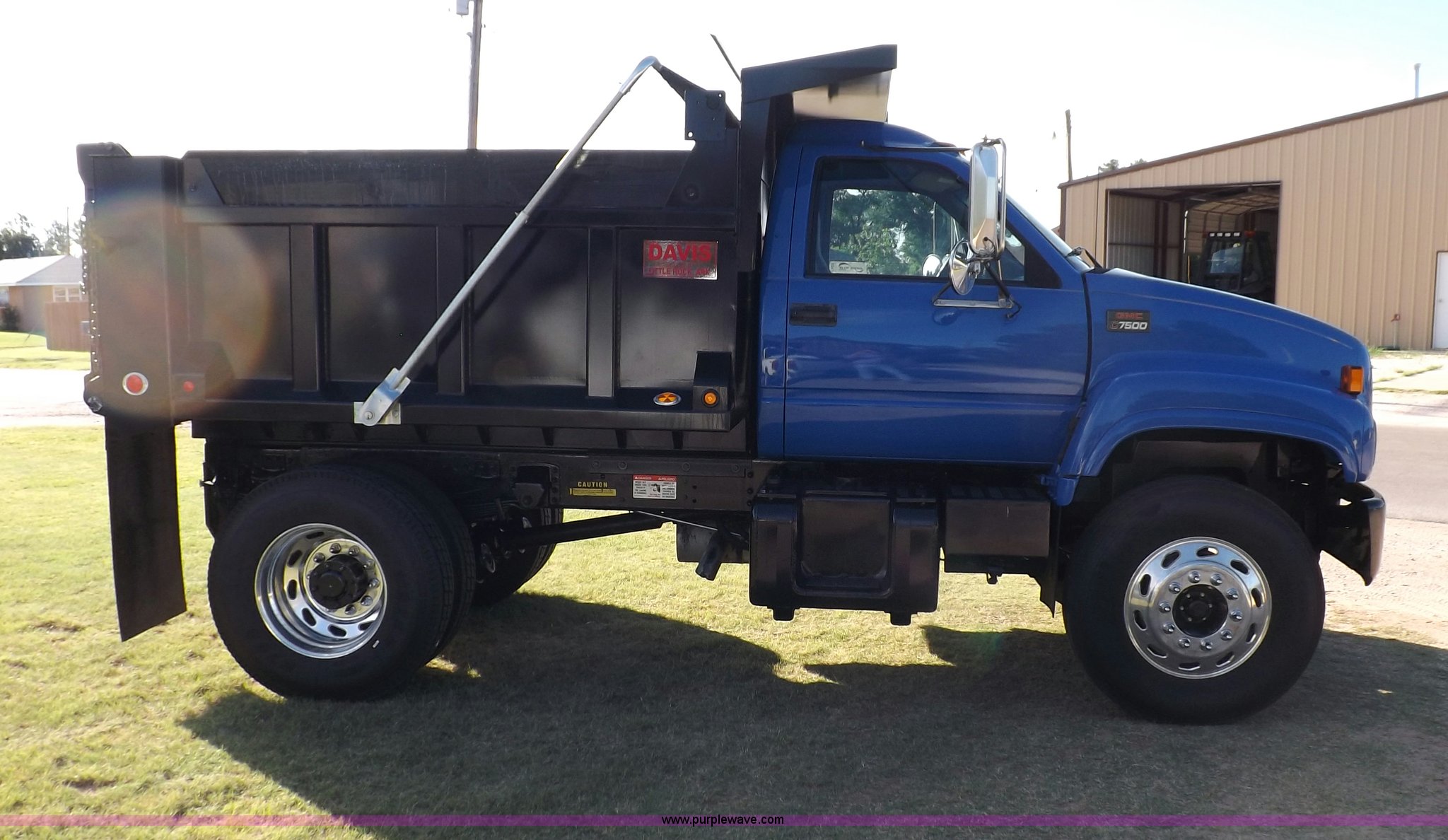 Purple Wave is selling a used Construction Dump Truck in Oklahoma. This item is a 2002 GMC C7500 dump truck with the following: 119,408 miles on odometer, Caterpillar 3126 7.2L six cylinder turbo diesel engine, 210 HP, Eaton Fuller nine speed manual transmission, AC and heat, Cruise, AM/FM, Air suspension seat, Heated mirrors, Fast idle control, Davis dump box, 8'10"L x 8'W x 46"H, 5 yd. capacity, Rollover tarp, Single ram, Air end gate, Block heater, Trailer wiring, Pintle hitch, Dual 50 gallon fuel tanks, PTO, Spring suspension, Air brakes, Brake controller, 144" wheelbase, 11R22.5 tires, GVWR 32,000 lbs, FAWR 11,000 lbs, RAWR 22,000 lbs