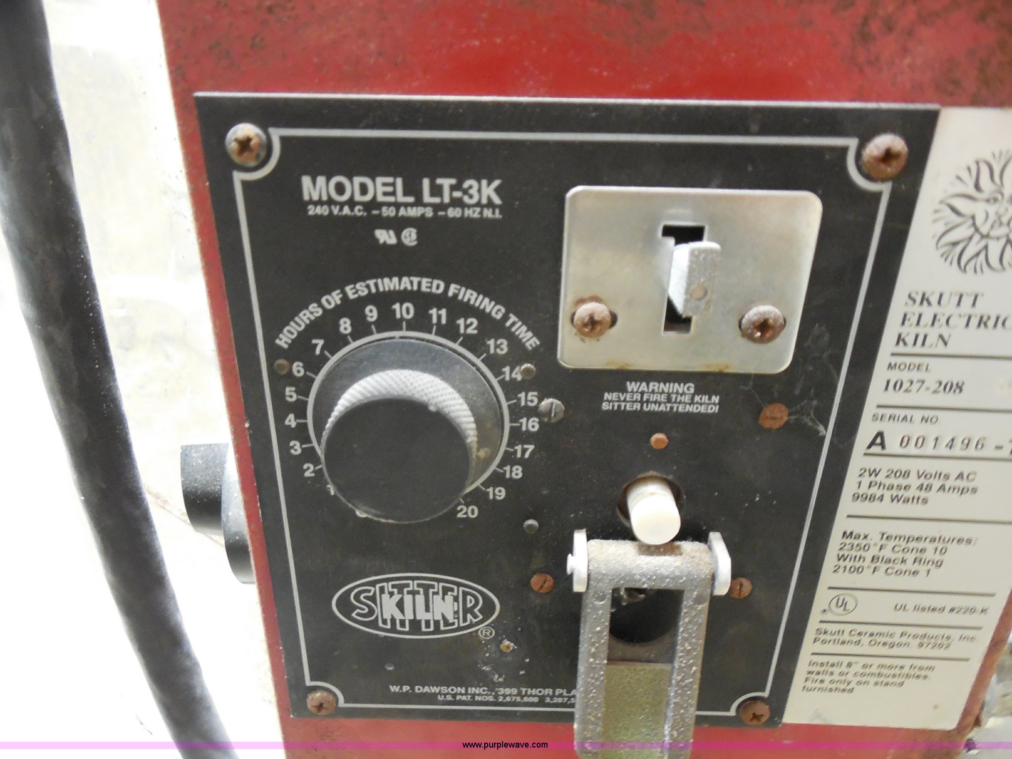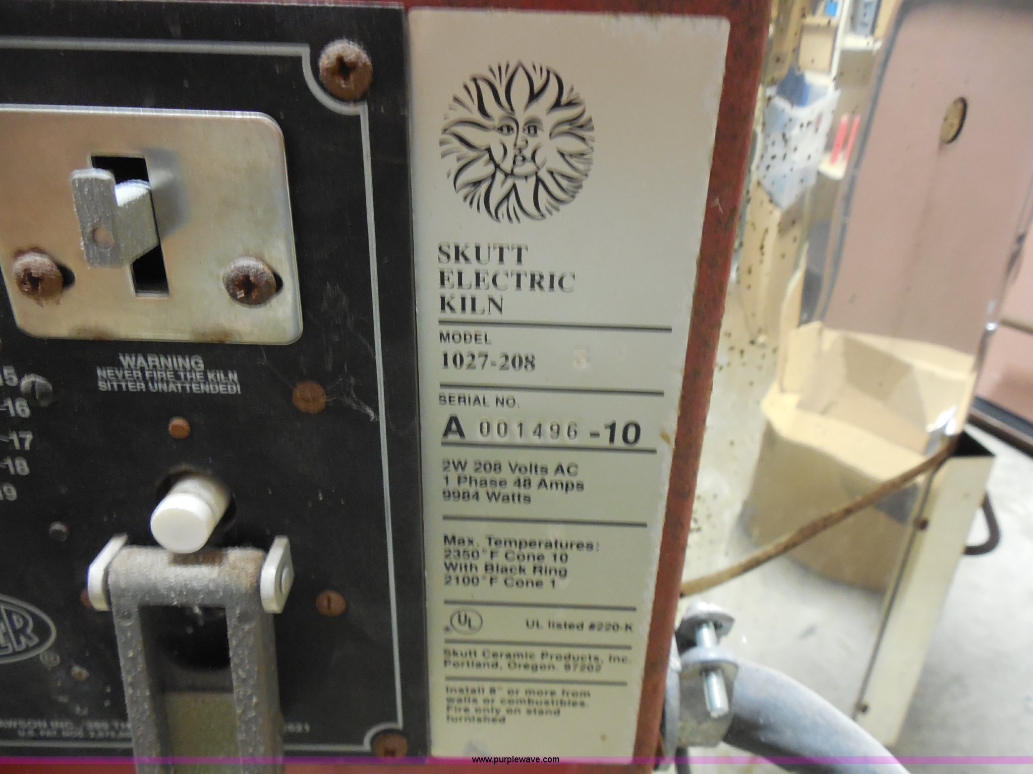 Purple Wave is selling a used Tools in Kansas. This item is a Skutt 1027-208 kiln with the following: 208V, 48 amps, 9,984 watts, Three phase, Serial A001496-10