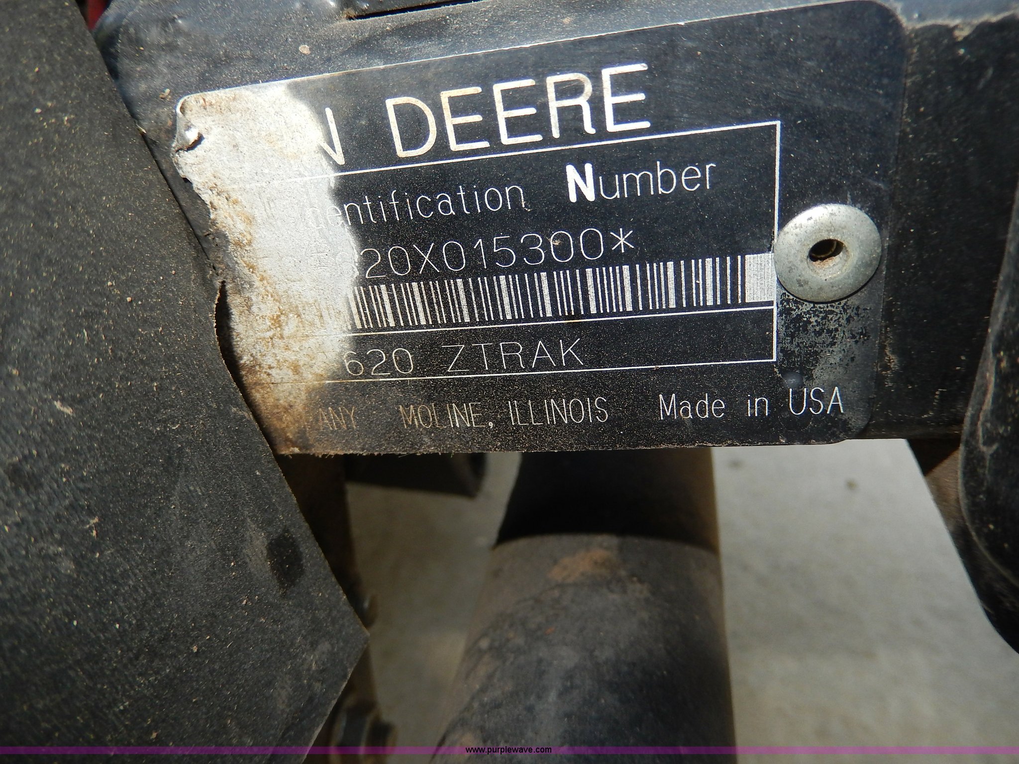 Purple Wave is selling a used Commercial Turf Mower in Kansas. This item is a John Deere F620 ZTrak lawn mower with the following: 2,778 hours on meter, 54" cut, Kohler V-twin gas engine, 20 HP, Deck folds up for easy cleaning and blade removal, 11x4.00-5 deck tires, 20x10.00-10 front tires, 13x6.50-6 rear tires, Small oil leak on engine, Serial CF620X015300