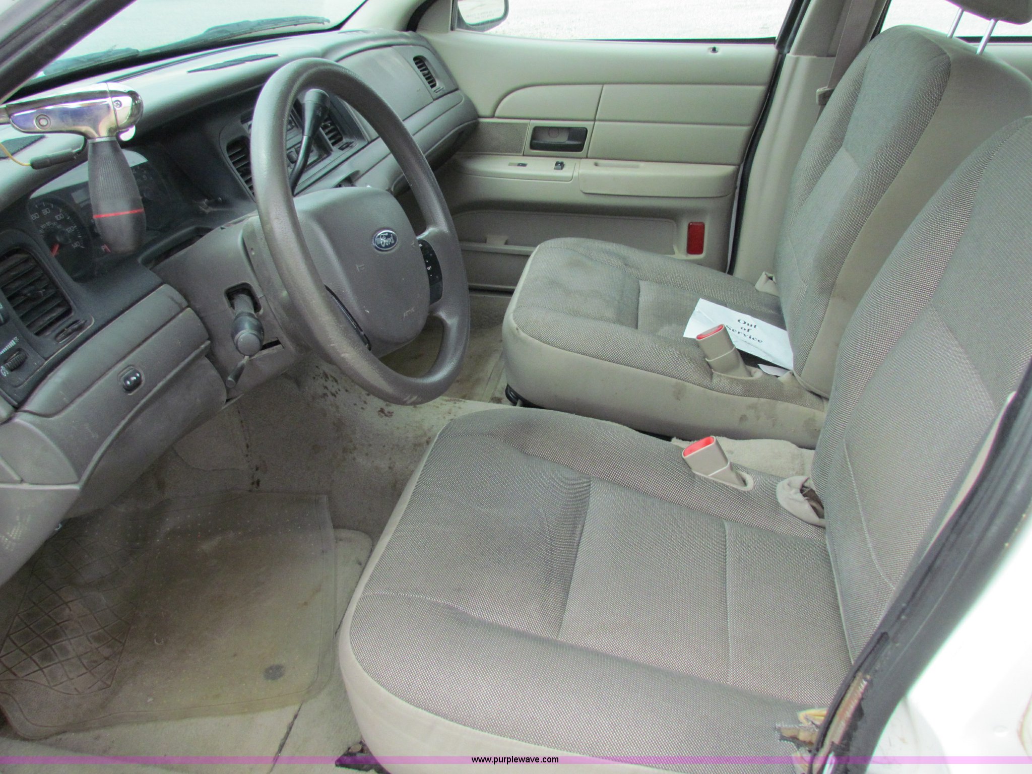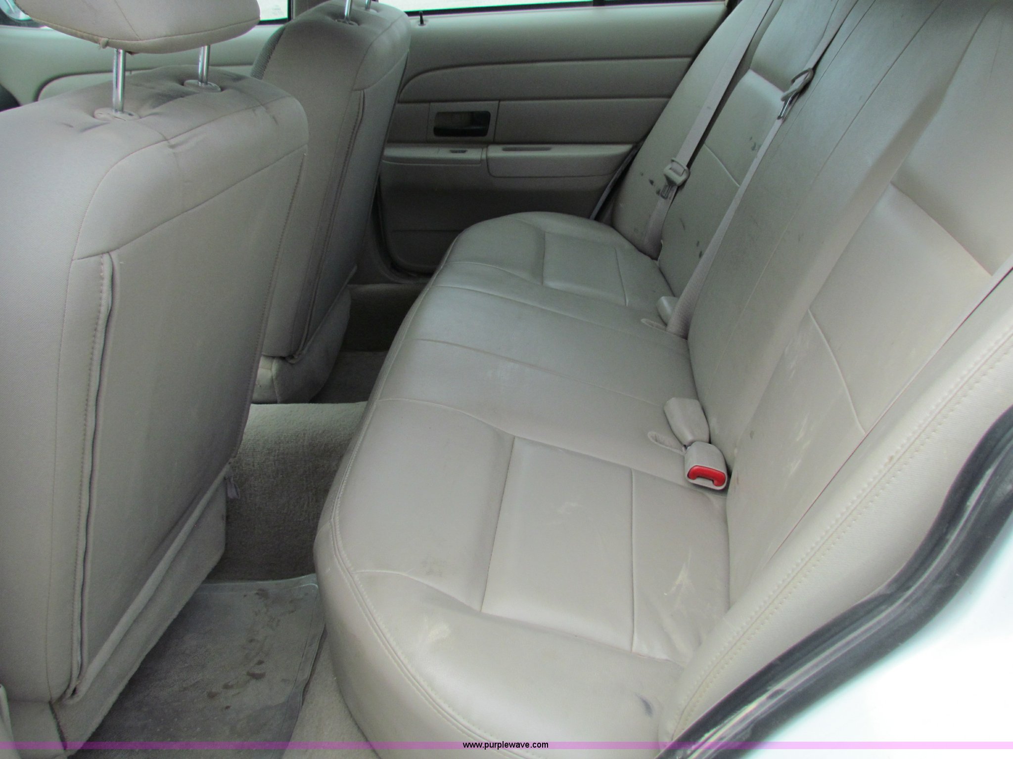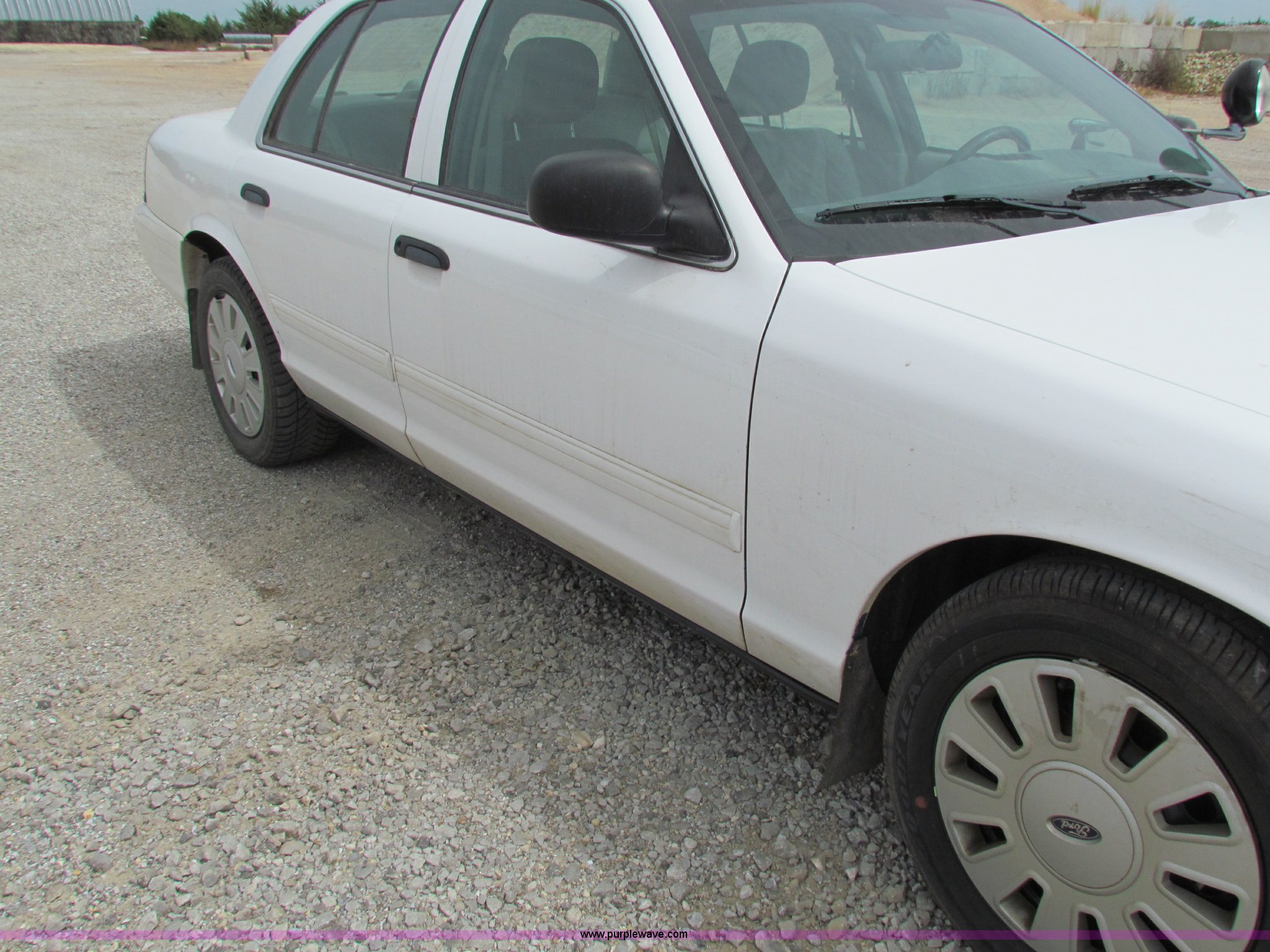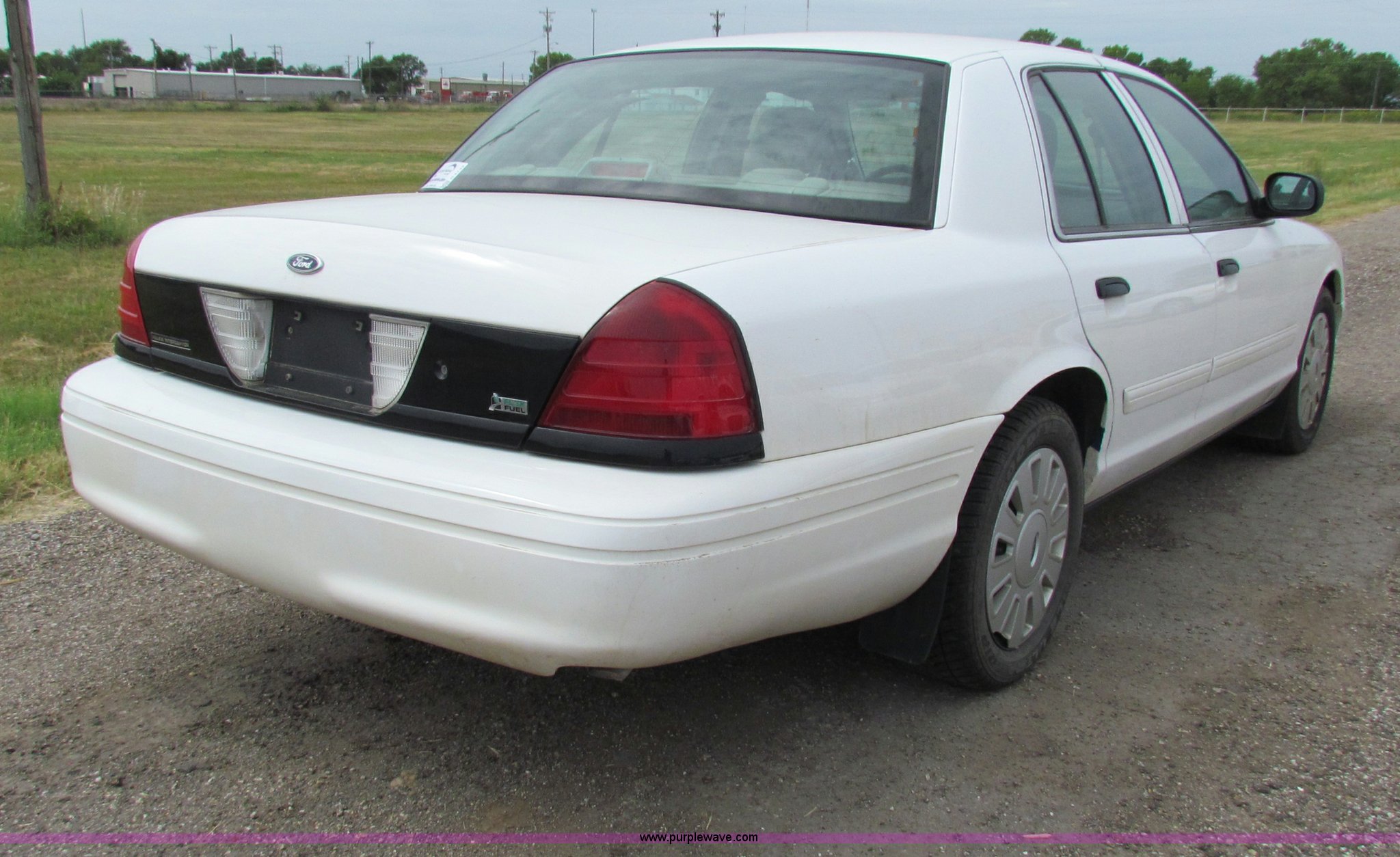 Purple Wave is selling a used Passenger Vehicle in Kansas. This item is a 2009 Ford Crown Victoria Police Interceptor with the following: 79,990 miles on odometer, 4.6L V8 SOHC 16V FFV gas engine, Automatic transmission, AC and heat, Tilt, AM/FM, Power windows, locks, mirrors, and seats, Cloth front interior, Vinyl rear interior, Spotlight, Roof top port holes, 235/55R17 tires, Interior/exterior cosmetic damage, Warning light on in dash